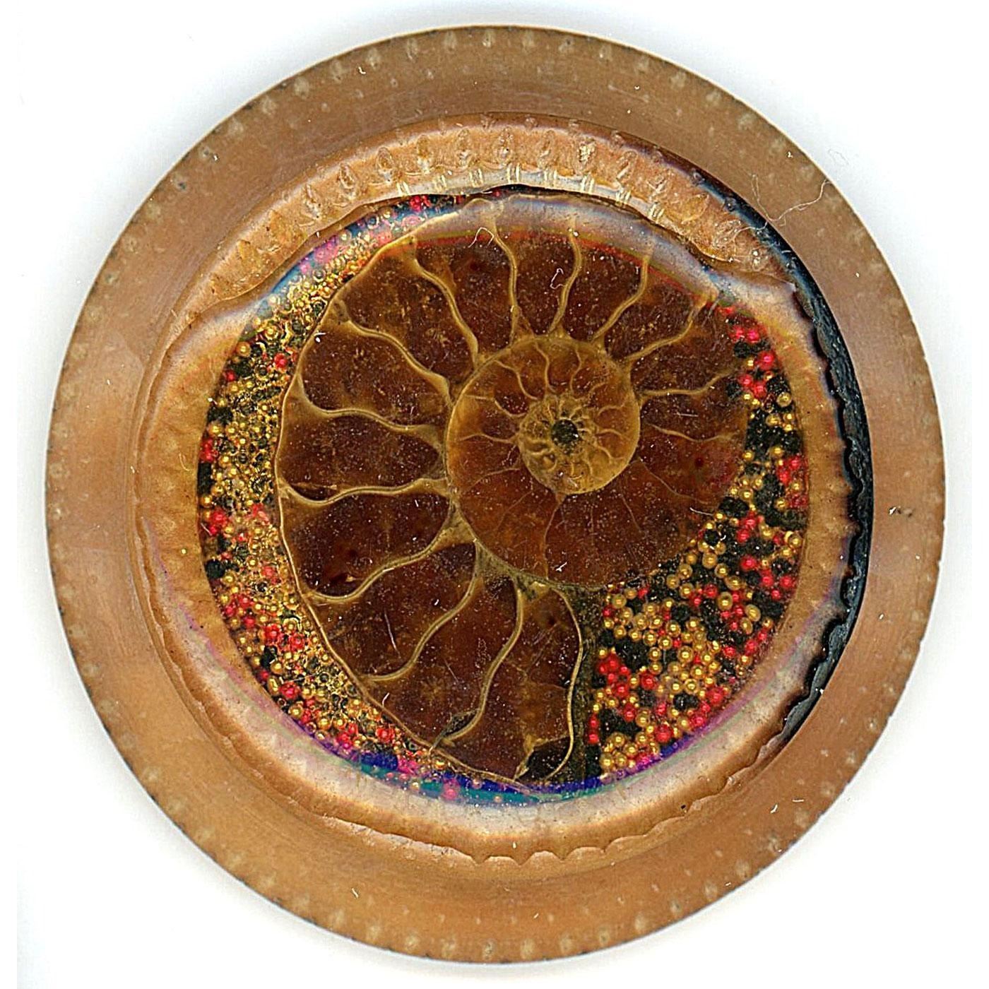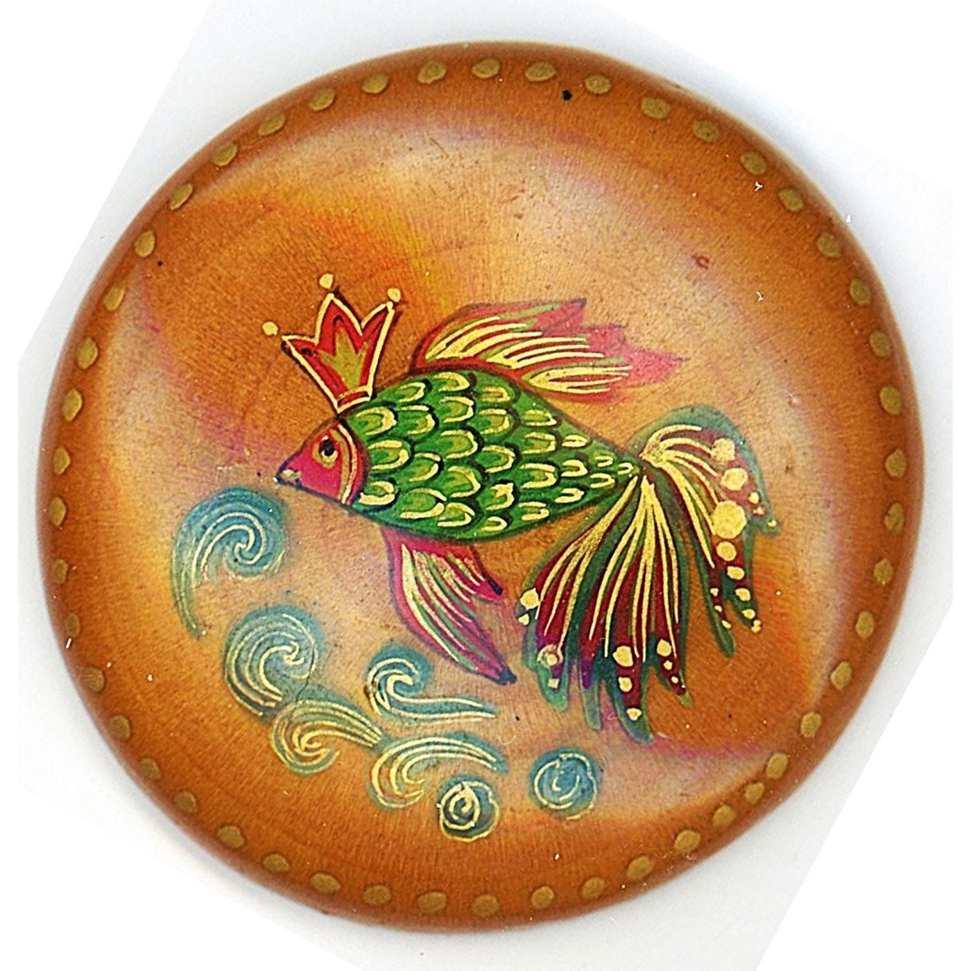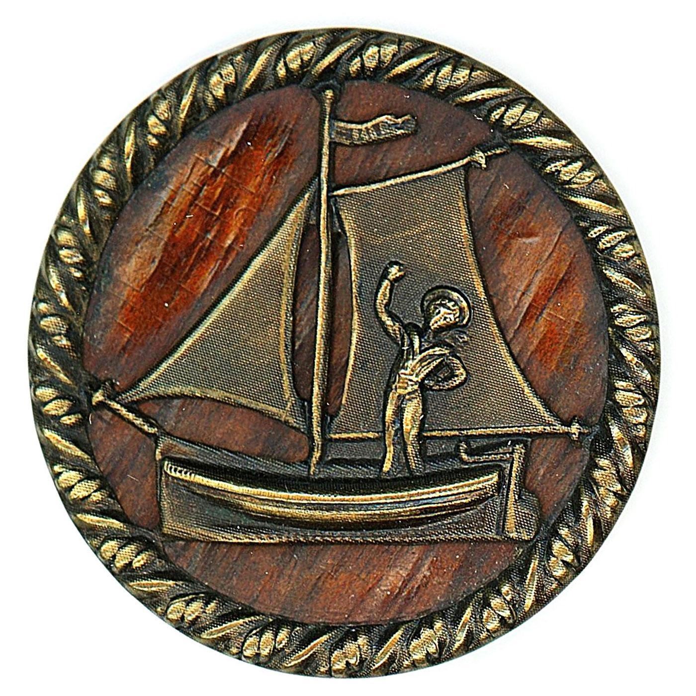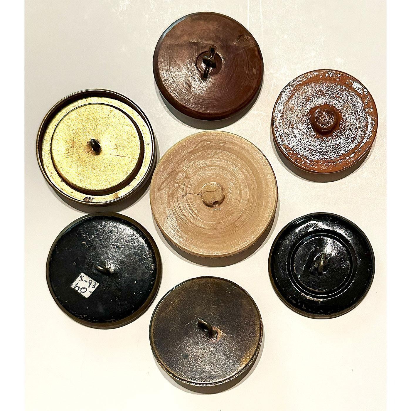 7 Large 19th-20th century examples including Asian pictorial. Here we have a selection of buttons in Earth tone colors including a large Bob Benson VI with a petrified stone center, a wonderful rich tones wood background of a boy and a sailing boat, a Russian painting on wood fish, a leather background Buddha, a tea dyed natural material background with ma steel and brass of Christopher and more.