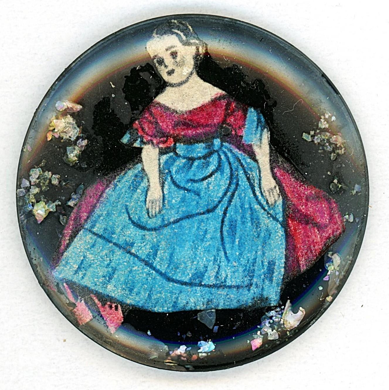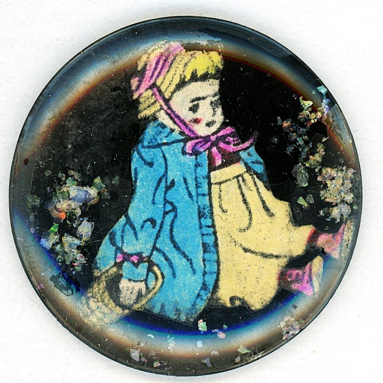 5 Large 20th century Watch Crystal examples. These buttons were made by the late Eunice Quinn of Wisconsin in the 70's. She made them in the same manner that Theodore Gates did. They are paper cutouts of women and children and set under a clear glass watch crystal and coated with a pitch like material back and signed with her initials,