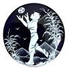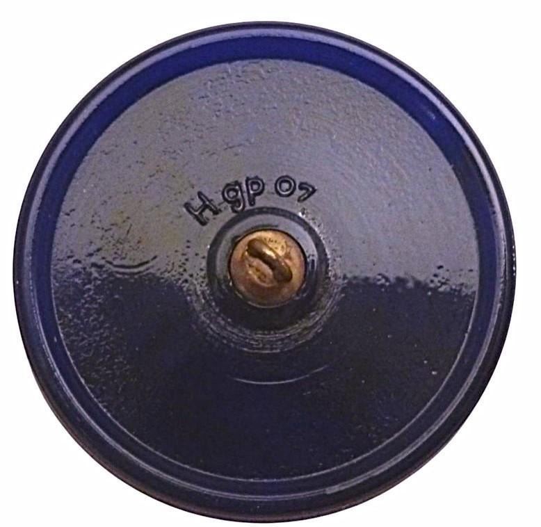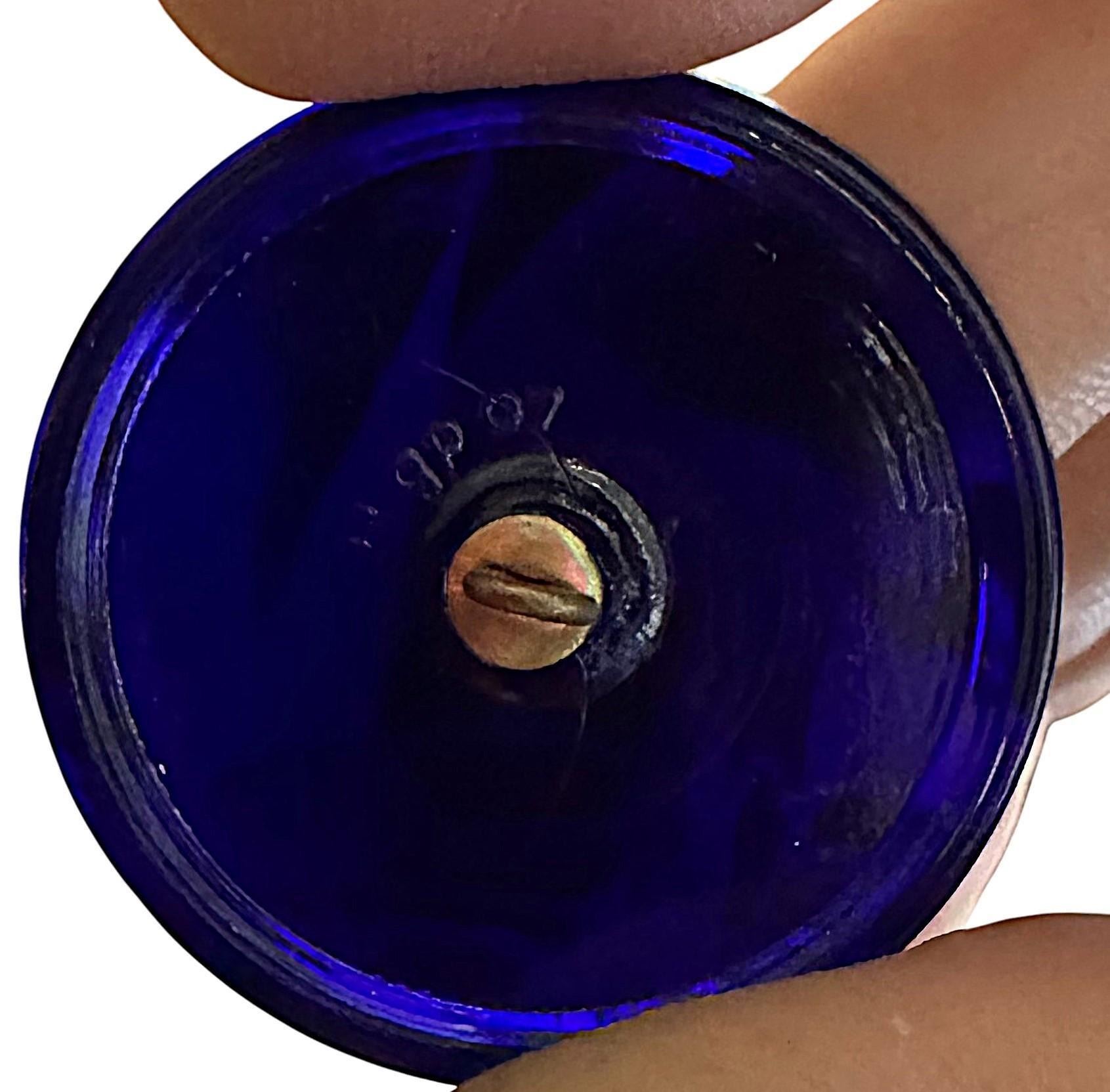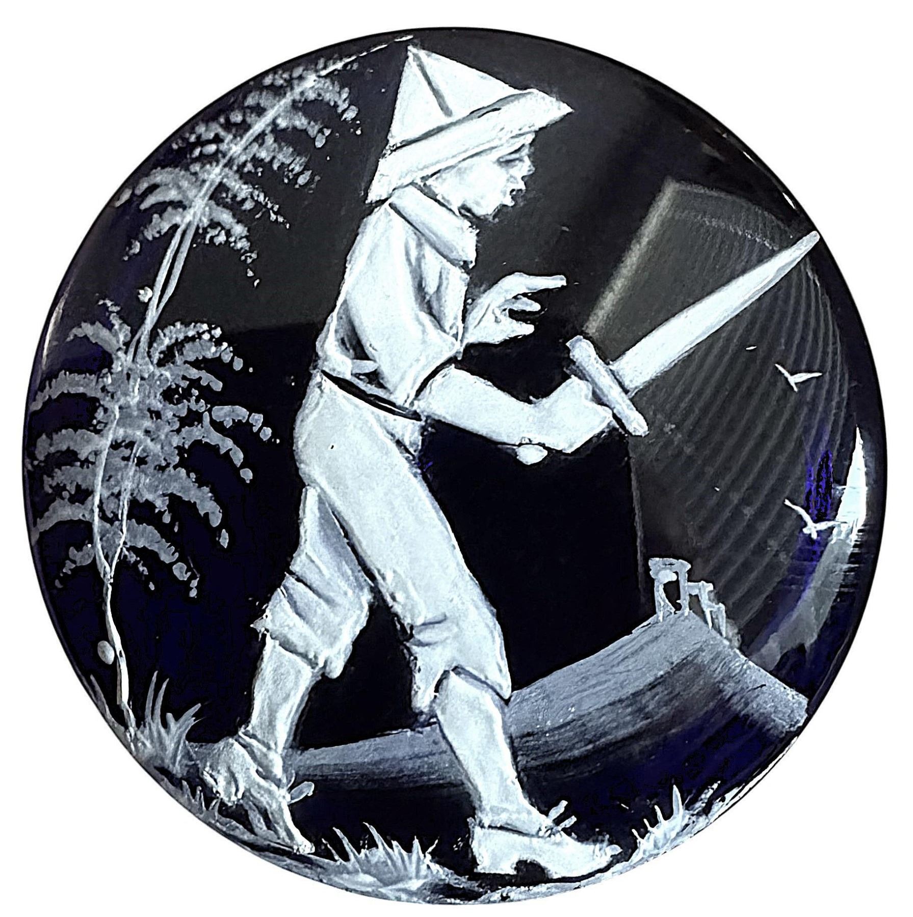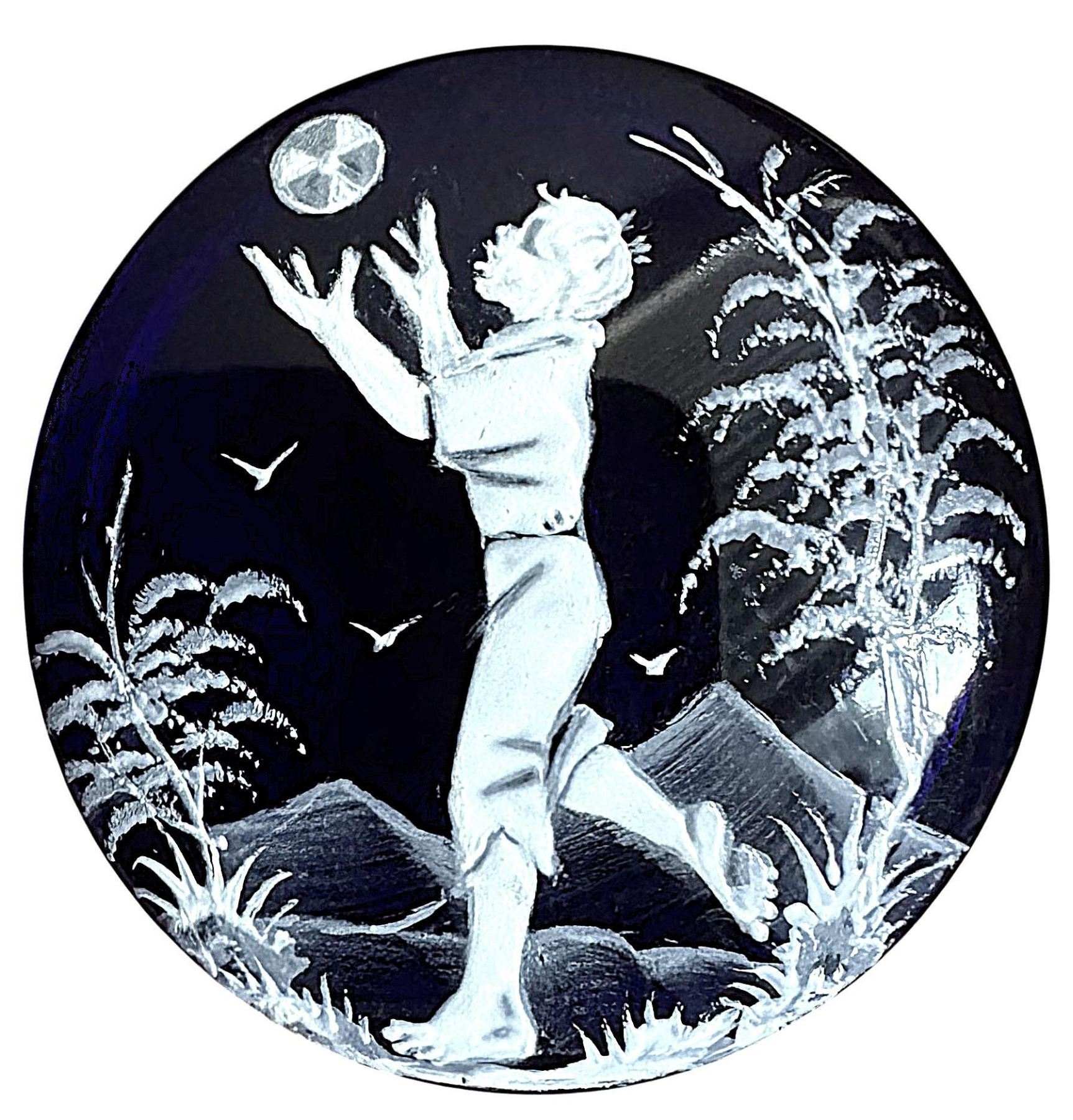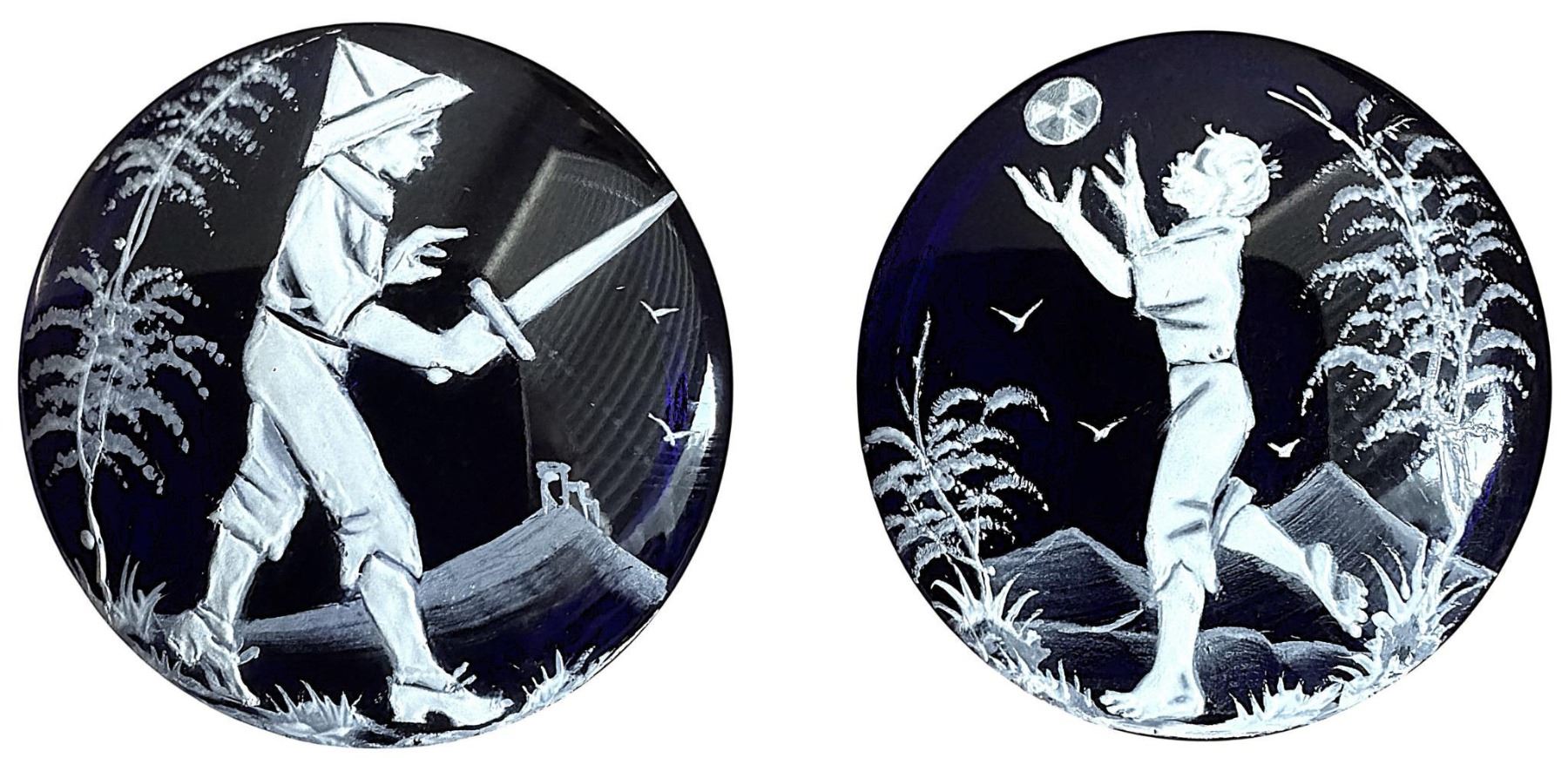 2 Large enamel decorated glass 21st C. cobalt children buttons. These backmarked examples in cobalt glass have become quite desirable among collectors ever since they were produced for Gerry Peck in 2007 as witnessed by the backmark in Czechoslovakia for her, and they are no longer being produced. The style of painting in enamel on glass is certainly reminiscent of the old glass by Mary Gregory and the children scenes are charming.