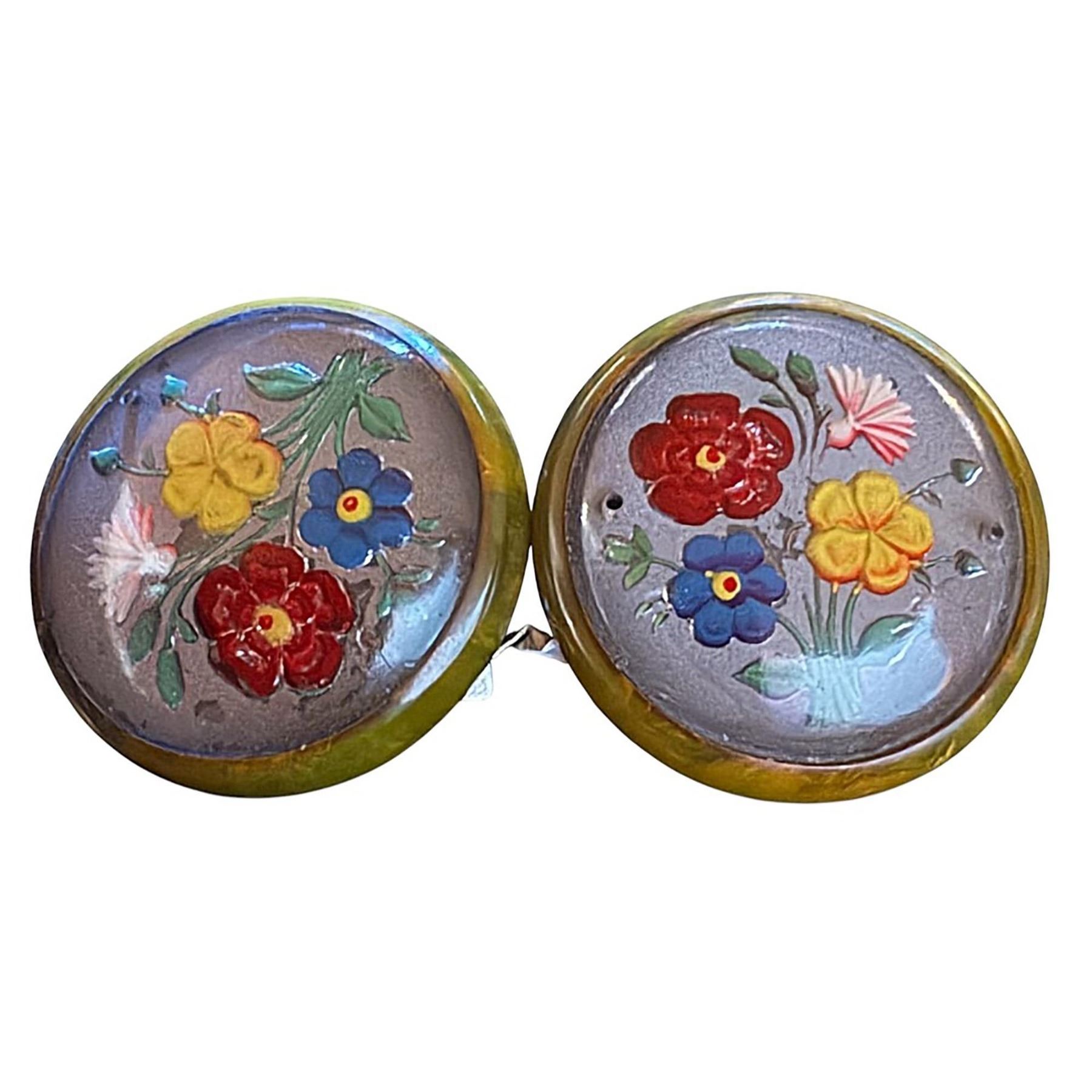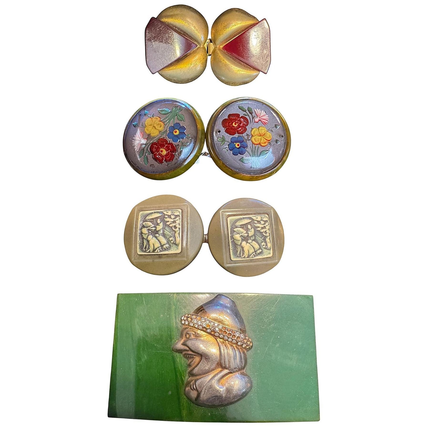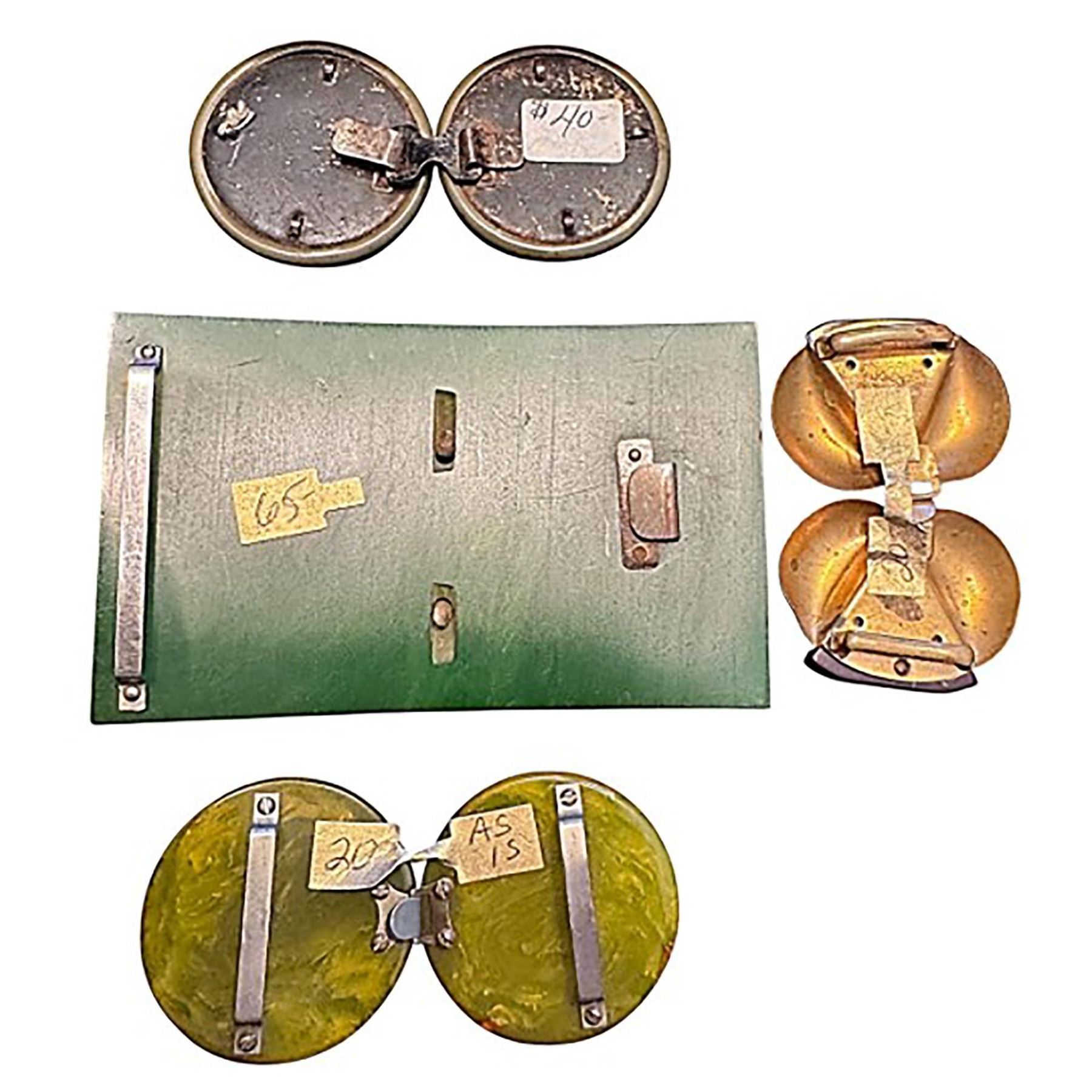 4 Large 1 and 2 pieced buckles including Bakelite. In this lot of buckles you will find a lovely reverse intaglio glass floral, a great large thick green Bakelite with brass head, a two piece celluloid/Ivoroid pictorial and more.