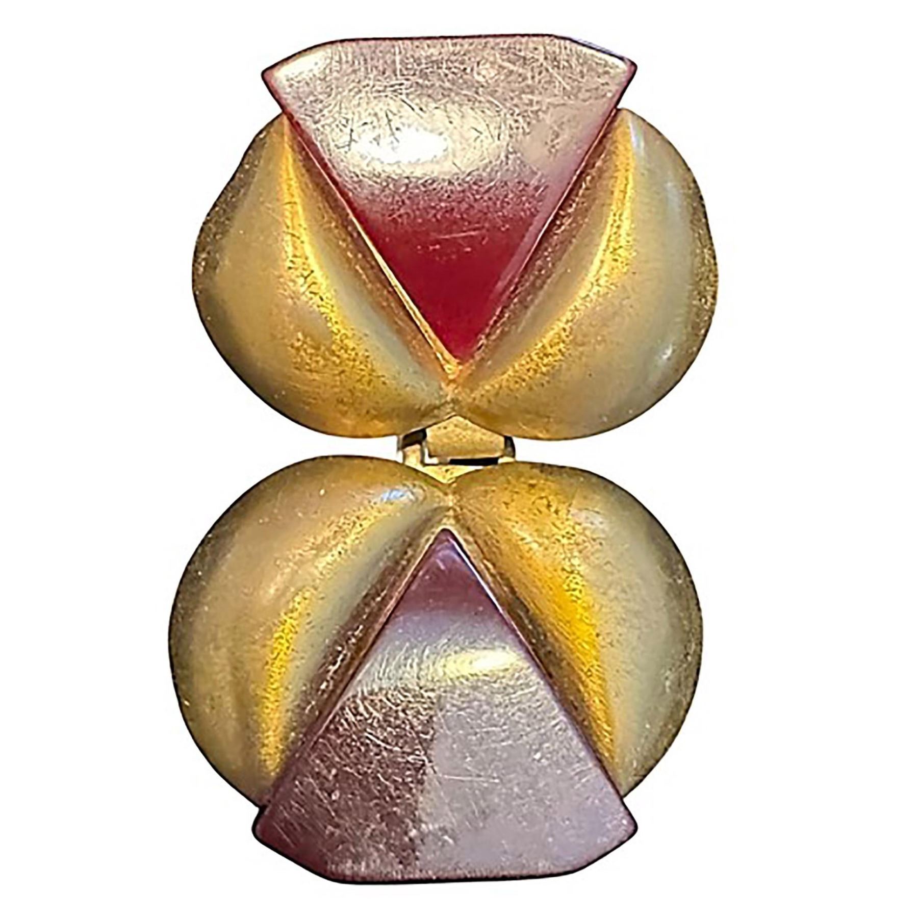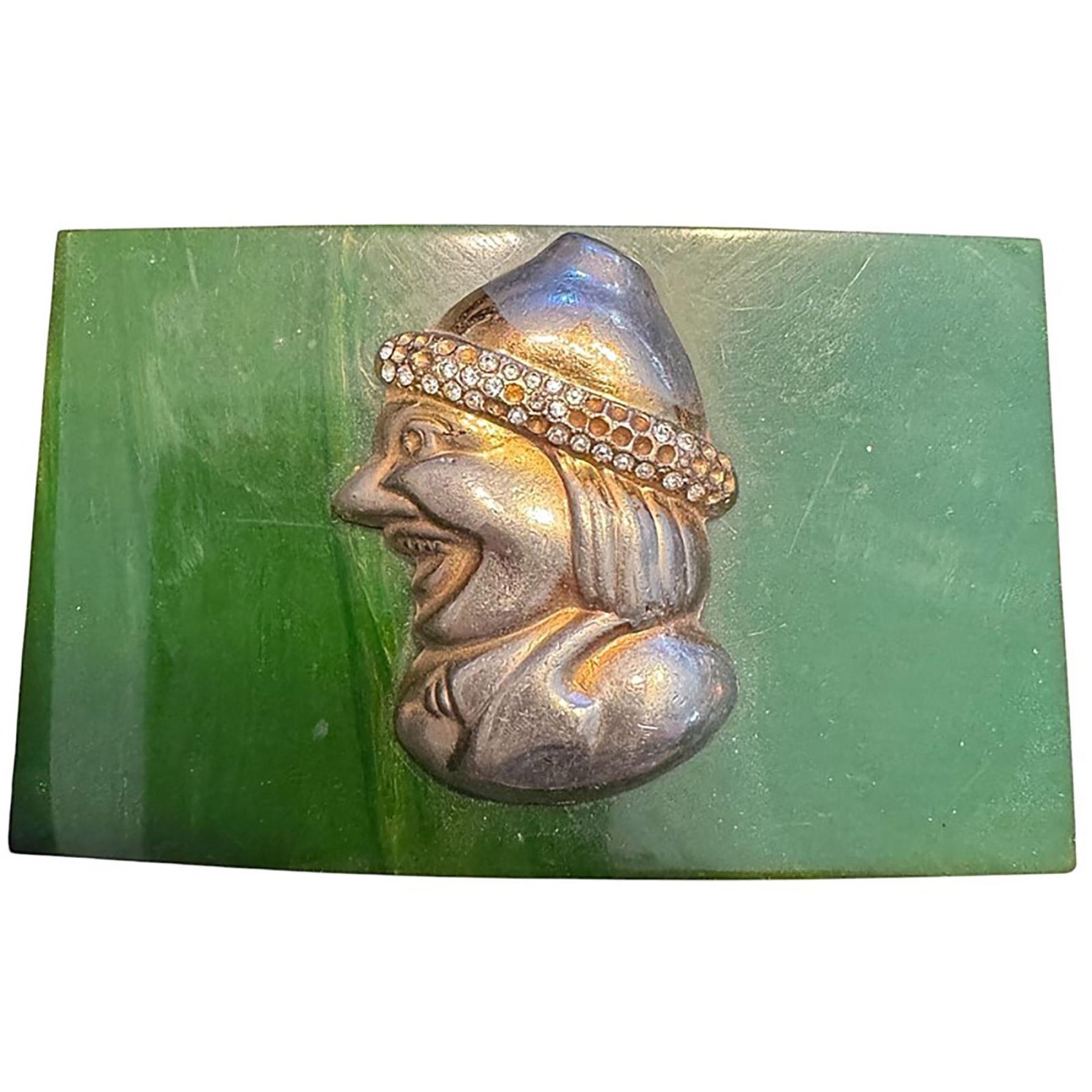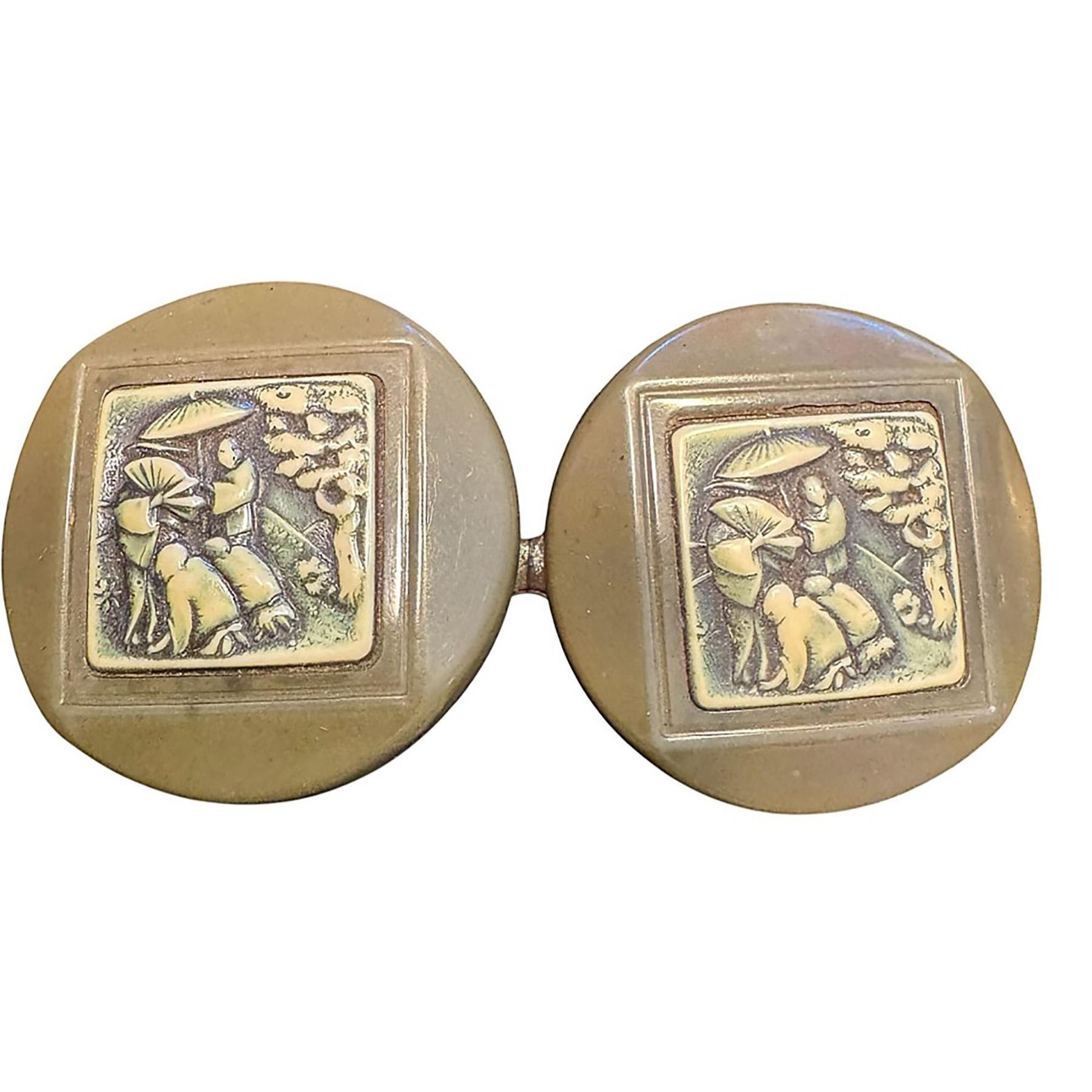 4 Large 1 and 2 pieced buckles including Bakelite. In this lot of buckles you will find a lovely reverse intaglio glass floral, a great large thick green Bakelite with brass head, a two piece celluloid/Ivoroid pictorial and more.