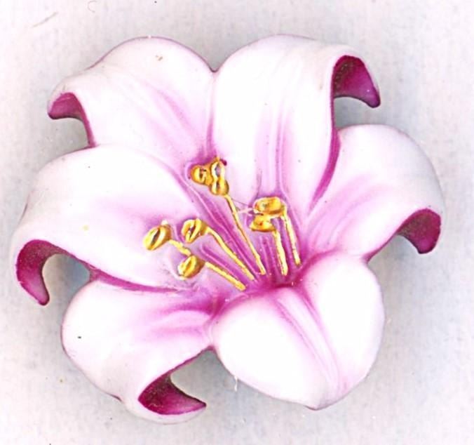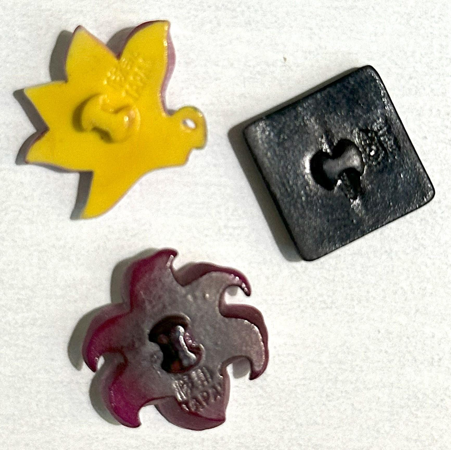 3 Medium 20th century Japanese Arita porcelain examples. Arita buttons from the Arita province of Japan are certainly desirable buttons among collectors including Connie Robinson. This lot includes a colorful yellow Foo Lion on a square black back and two pink colorful realistic flowers.