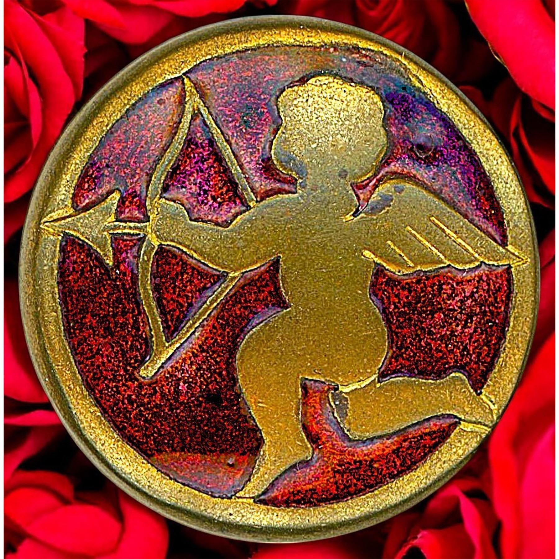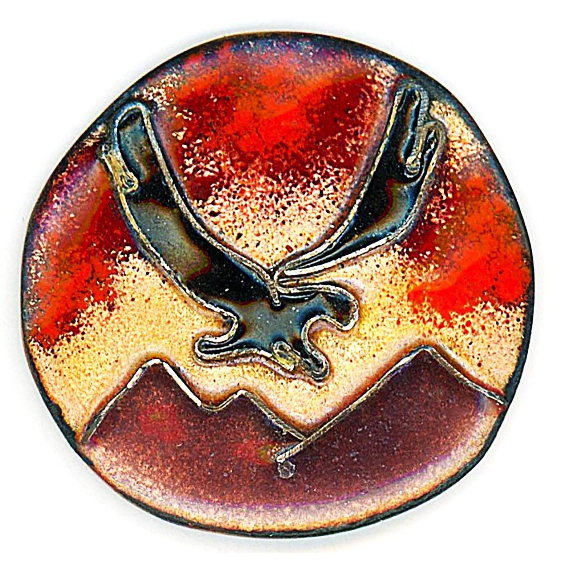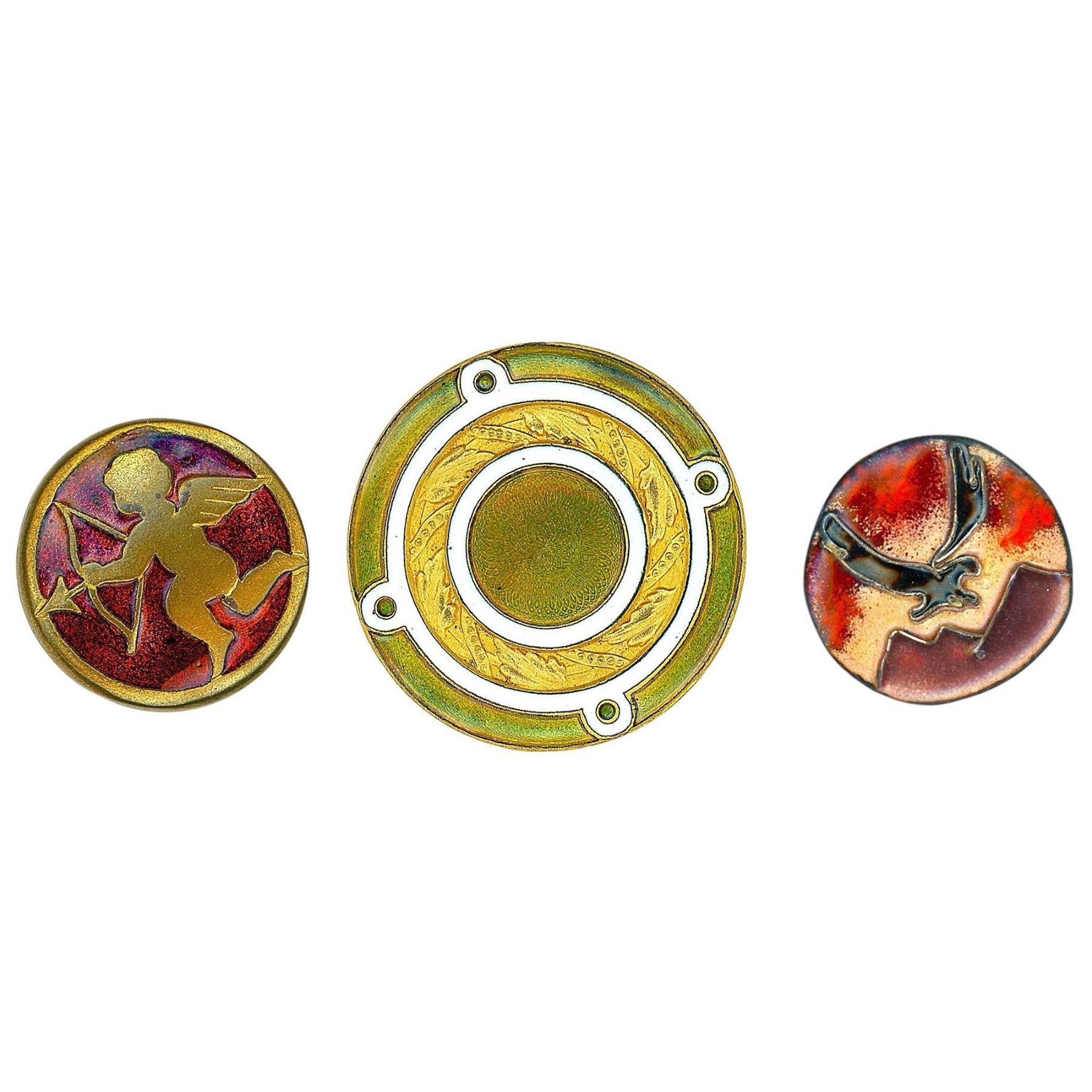 3 Medium/Large 19th-20th century assorted technique examples. This card includes a beautiful red Basse Taille enamel Cupid with bow and arrow, an unusual color enamel of 4 borders. This green color is not only unusual but quite striking. The lot also includes a colorful bird and mountain scene enamel in the style of Herma Lowenstein's enamels.