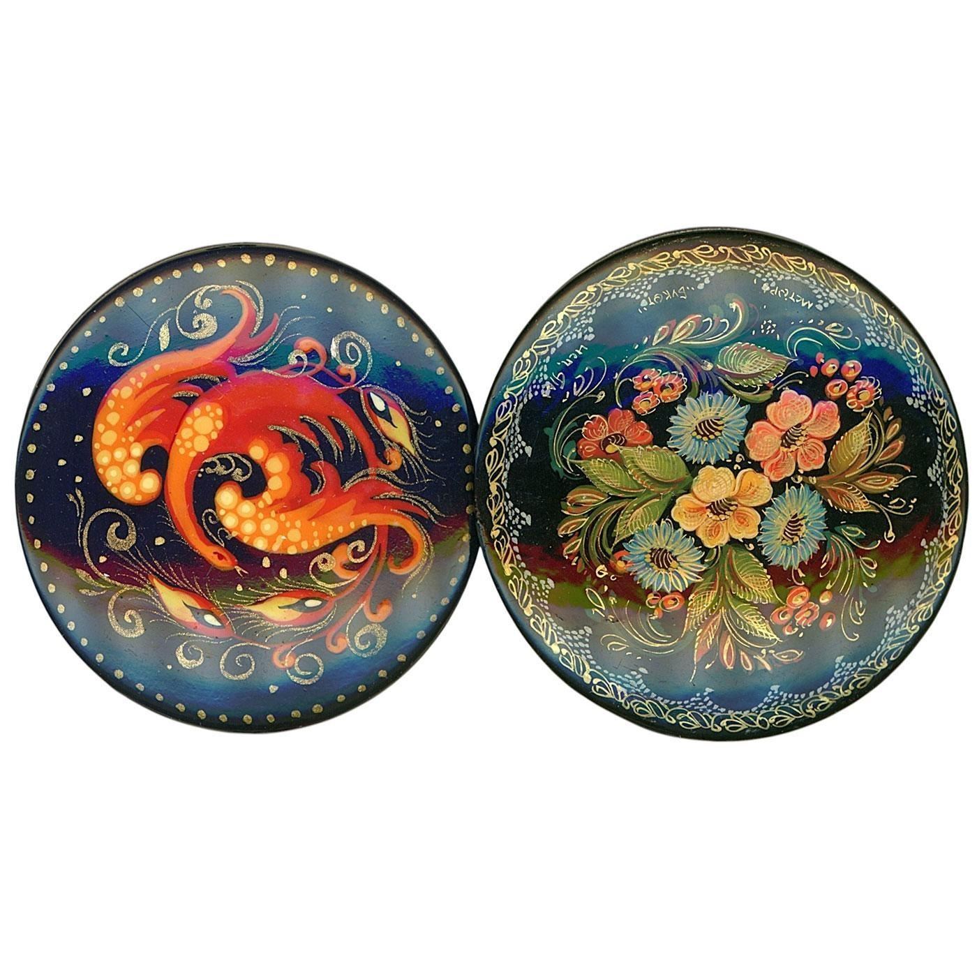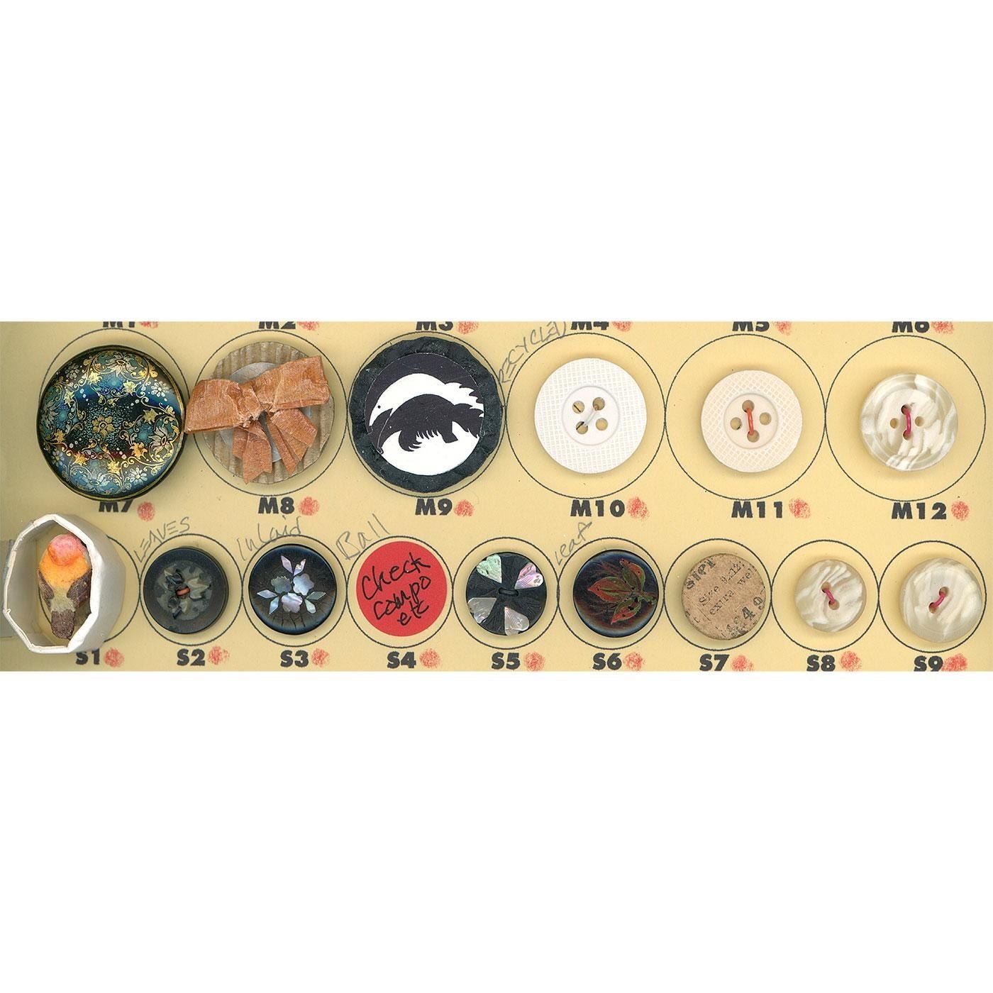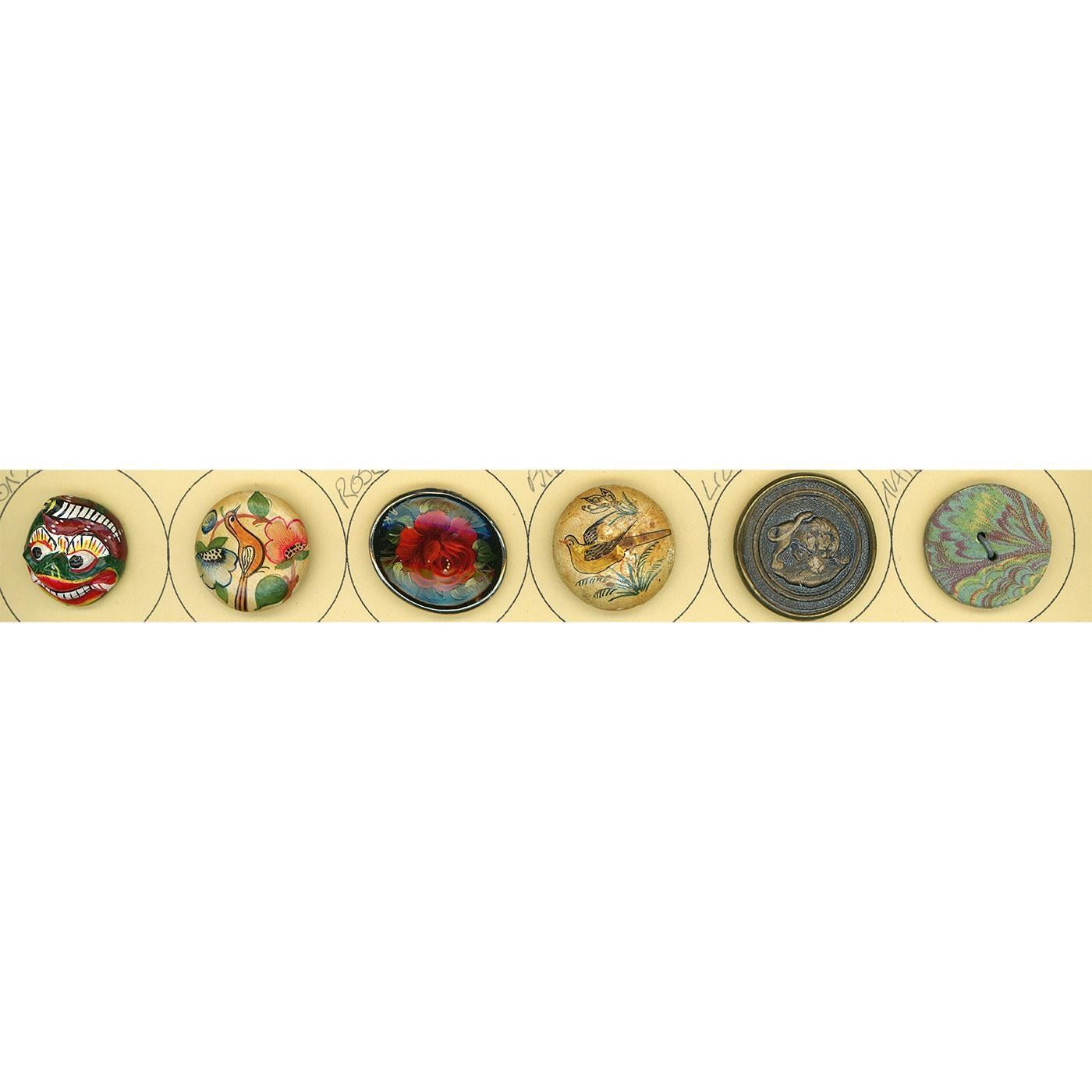 26 S/M/L 19th-20th century buttons including pictorials. This partial card includes two extra large nice colorful Russian Lacquer buttons, wood. Horn inlay, pictorials and patterns and more.