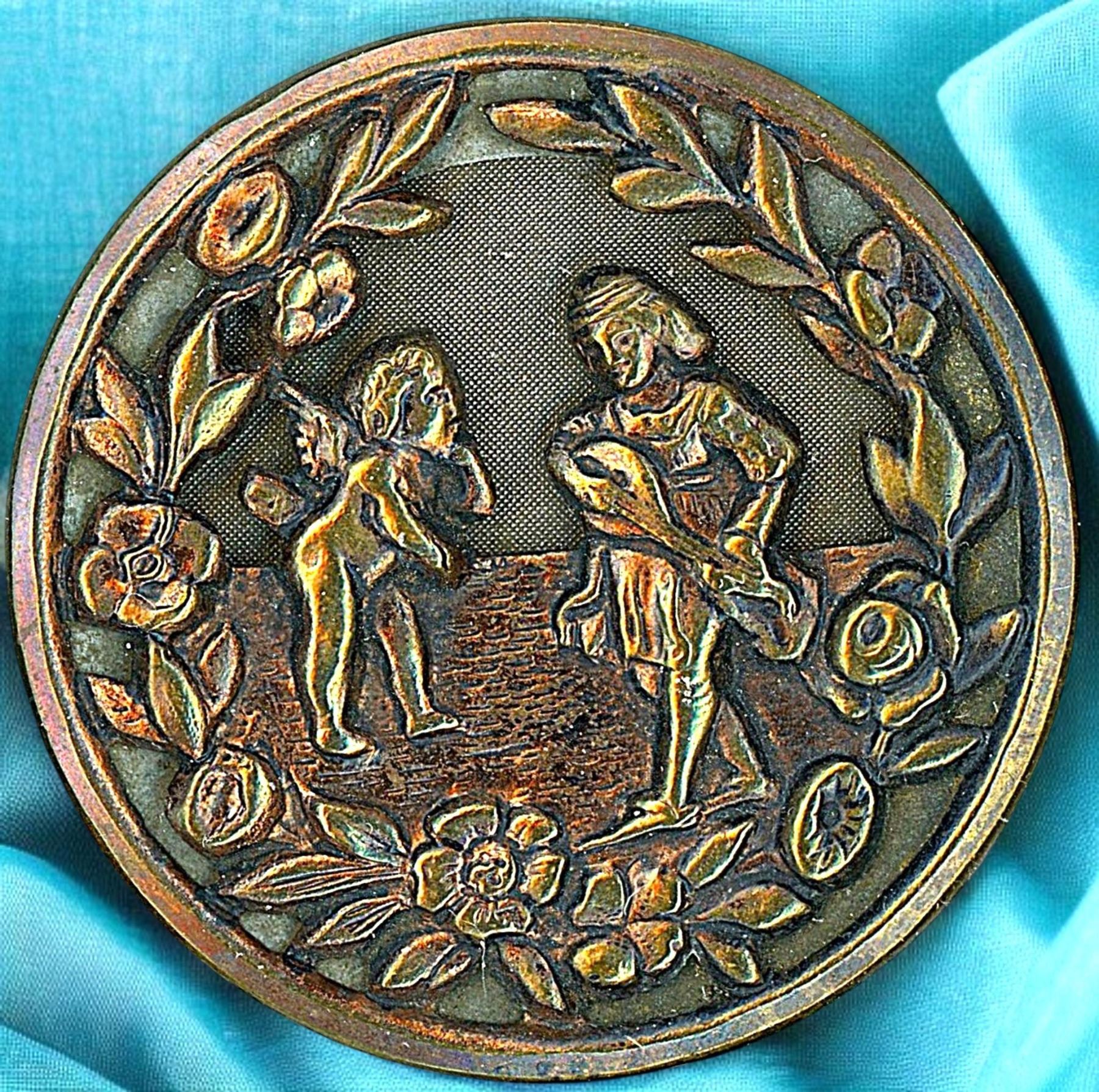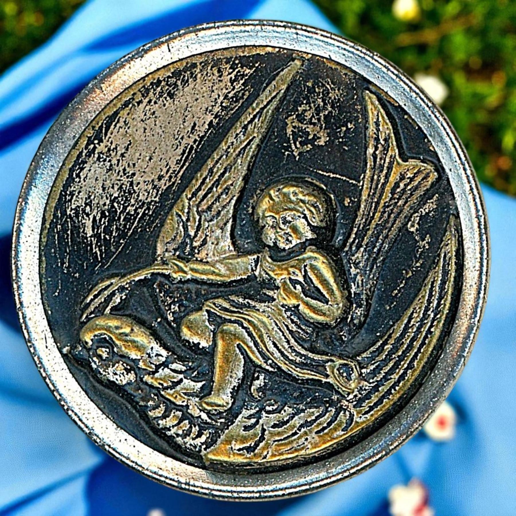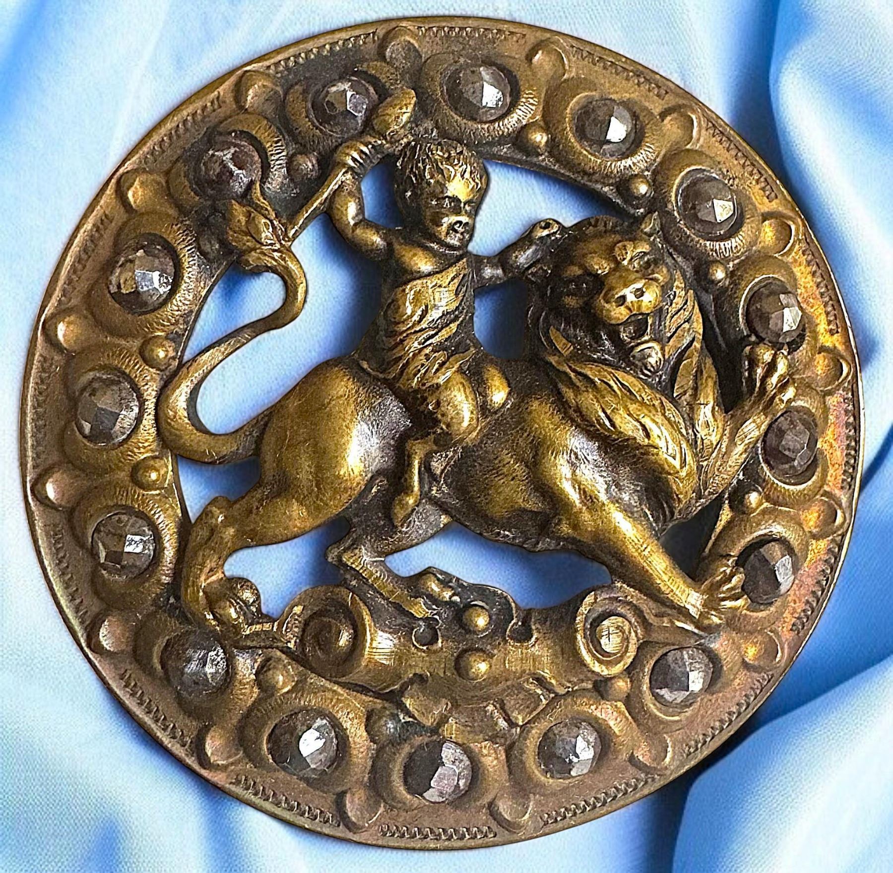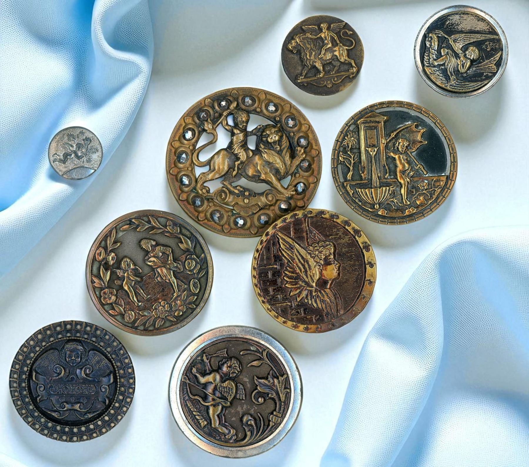9 S/M/L 19th century examples specialized to metal. Here is a card of Cherubs and Cupids including a wonderful and finely detailed big large pierced brass with cut steels of a Cupid and the lion. The lot also has a very detailed brass button of a gnome like character being serenaded and more.