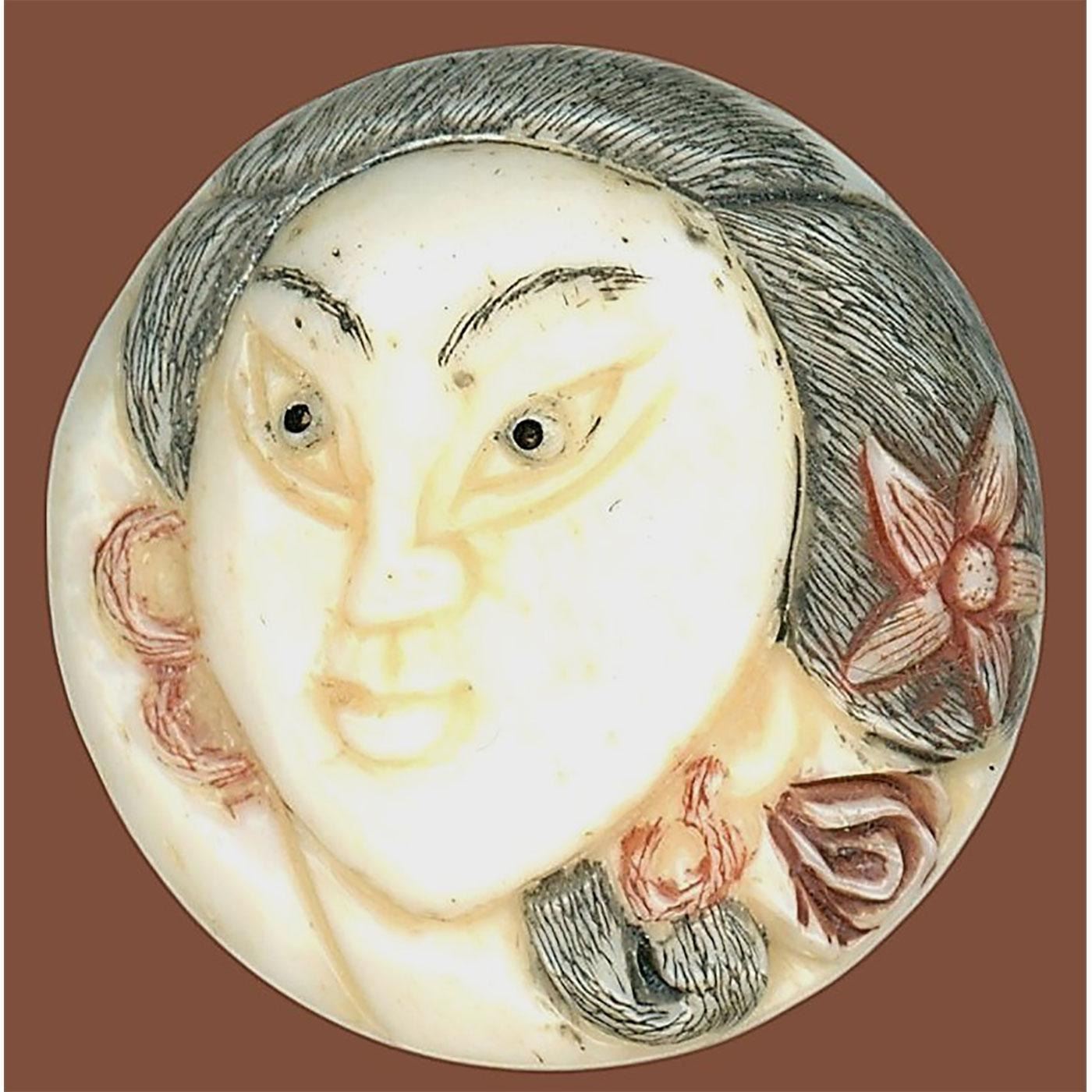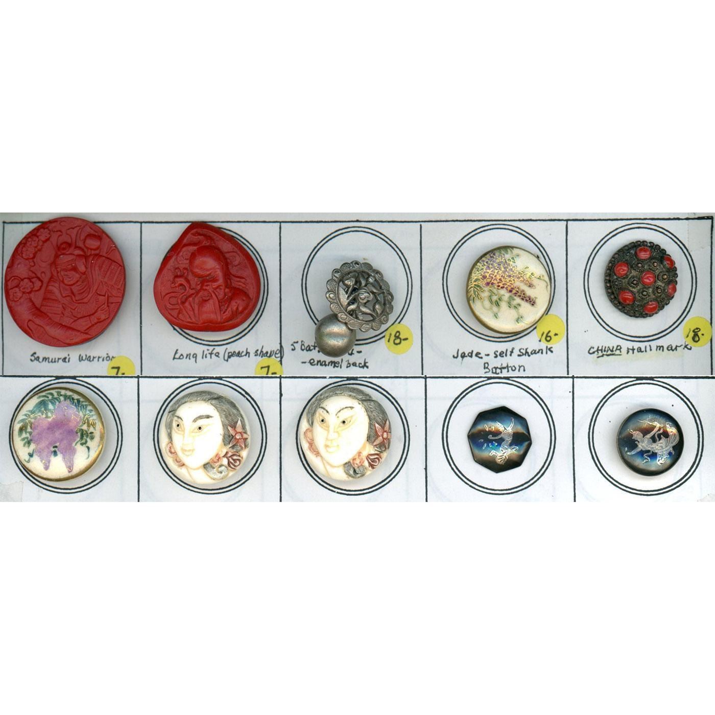 10 S/M/L 19th-20th-21st century buttons including cinnabar. This small card includes nicely carved bone examples, a nice early silver toggle, pictorial cinnabar from the late 20th century, Japanese Satsuma and more.