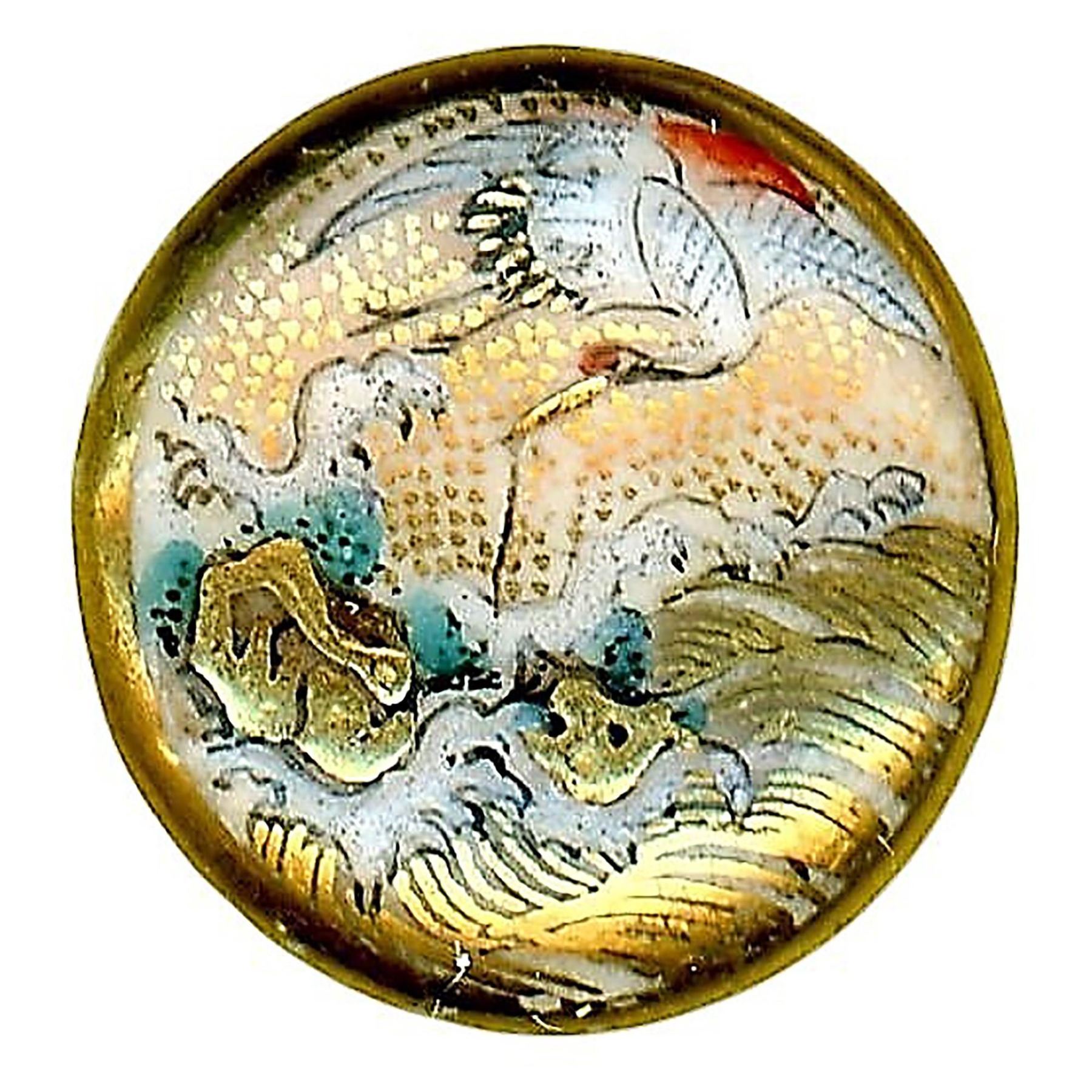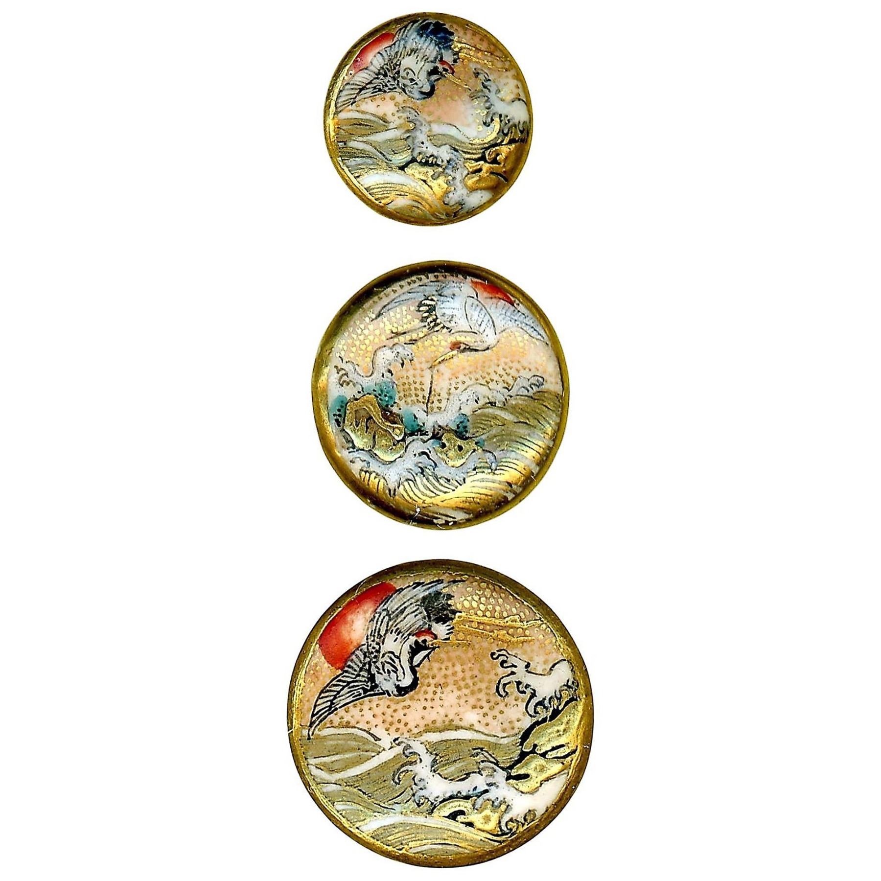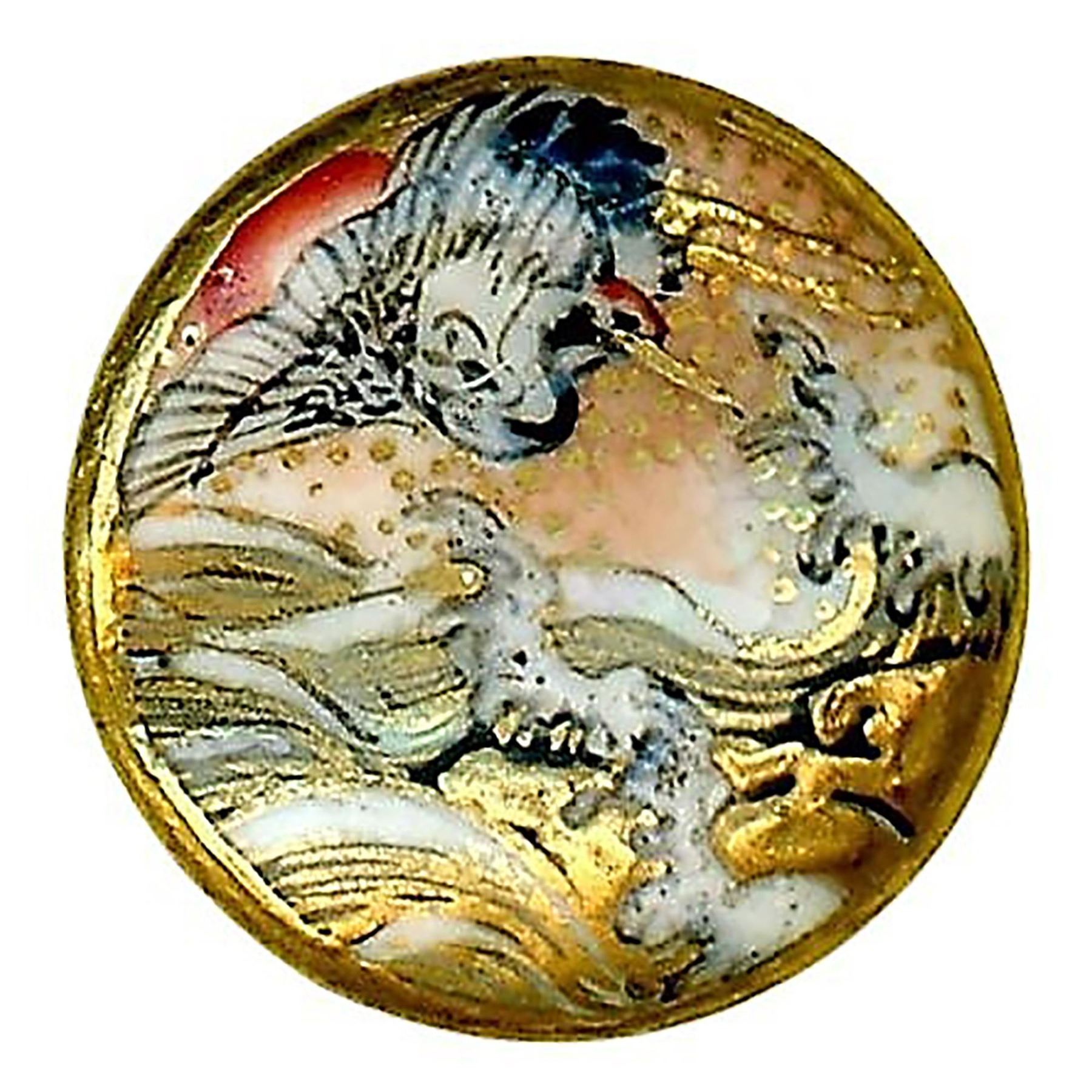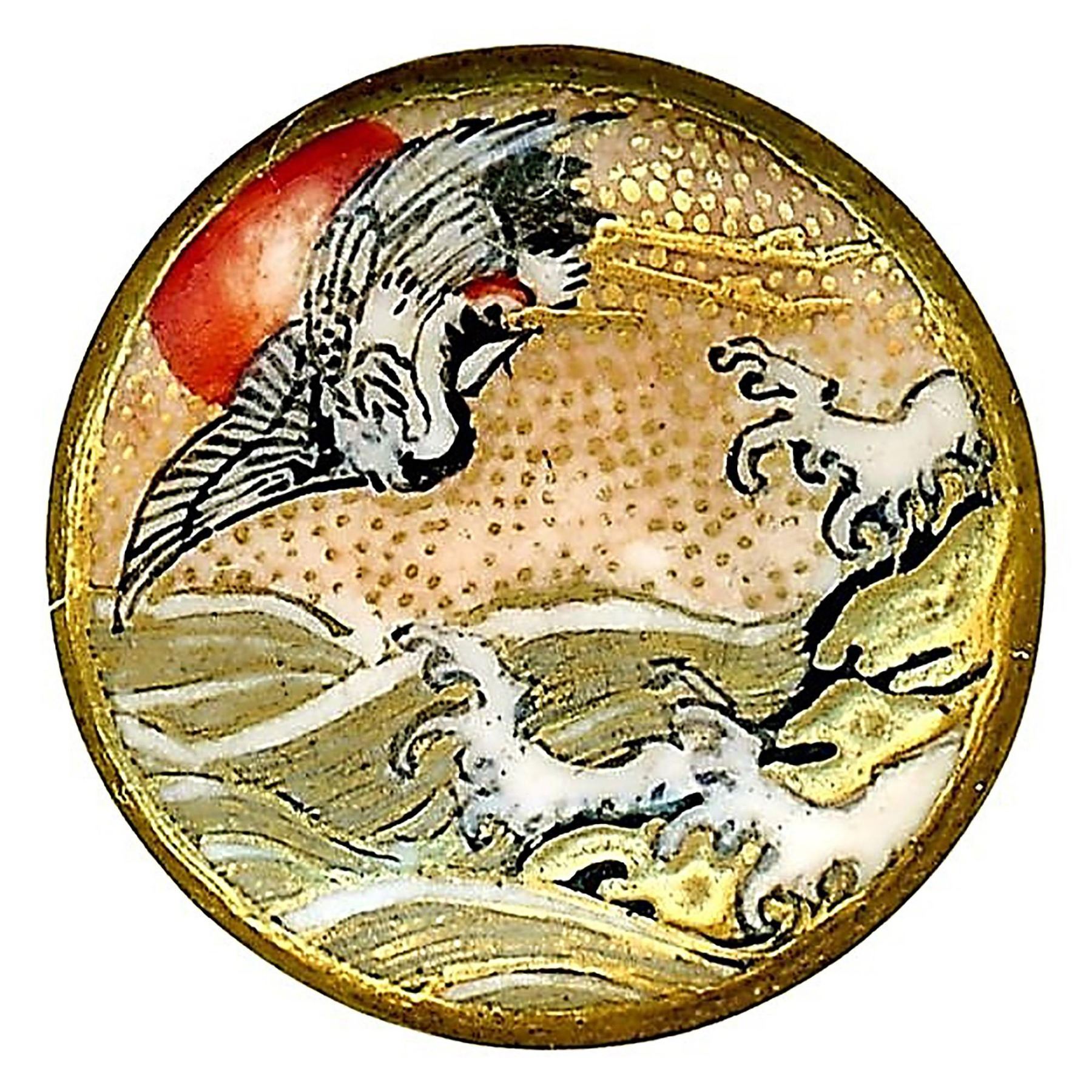 3 Small 19th century very detailed Japanese pottery buttons. These three small detailed Satsuma buttons with lots of gold depicts a meaning that our Tin Dang has once again explained for us the meaning of these depictions. The Crane in flight represents the faithful people, the red sun represents the symbol of the new beginning as Japan was called the land of the rising sun. The ocean represents success in your life. The entire meaning of the design represents good fortune and good wishes to the person being presented a gift. This button lot and two others in the auction are all from the collection of the late Pauline Lum of California. Notice the price sticker on the back image as these were purchased many years ago and obviously were prized in her collection. A very fine and scarce Satsuma button.