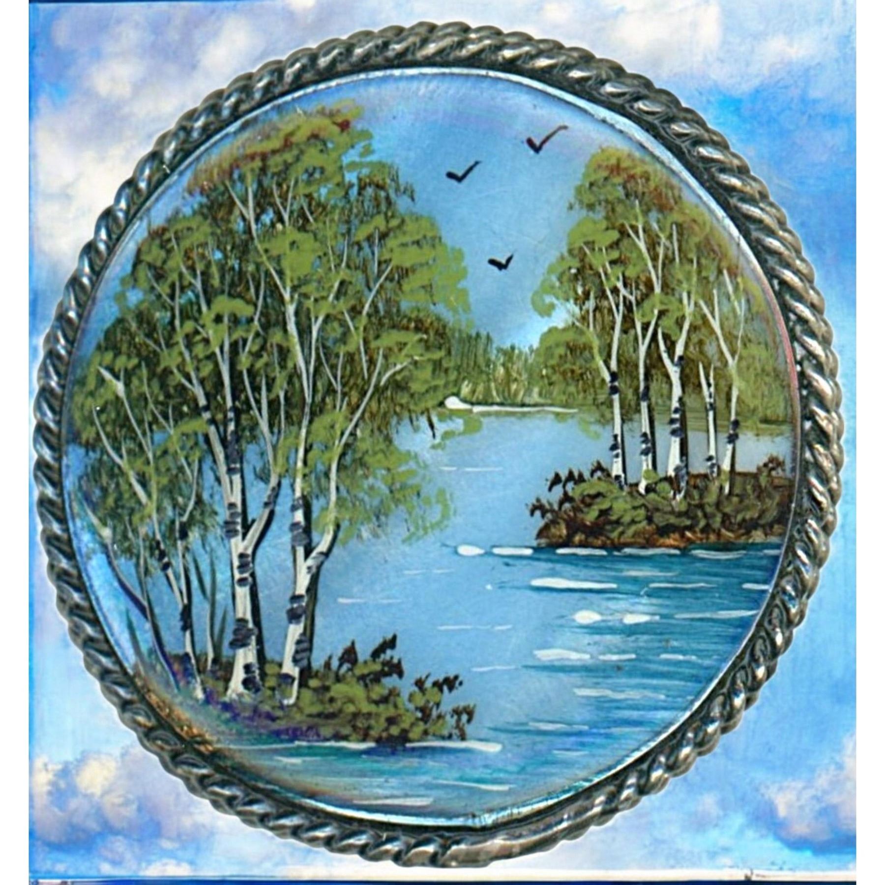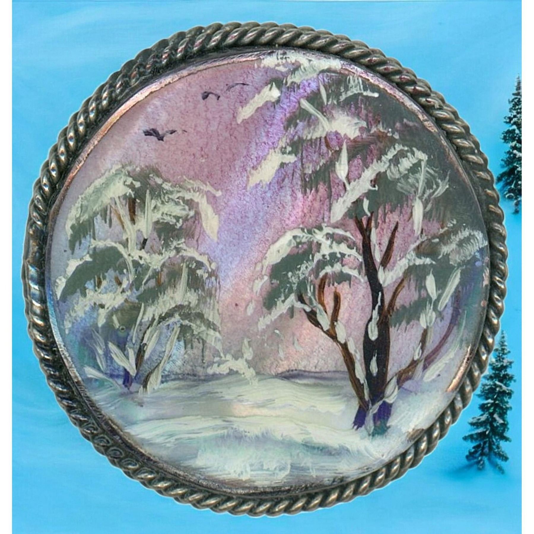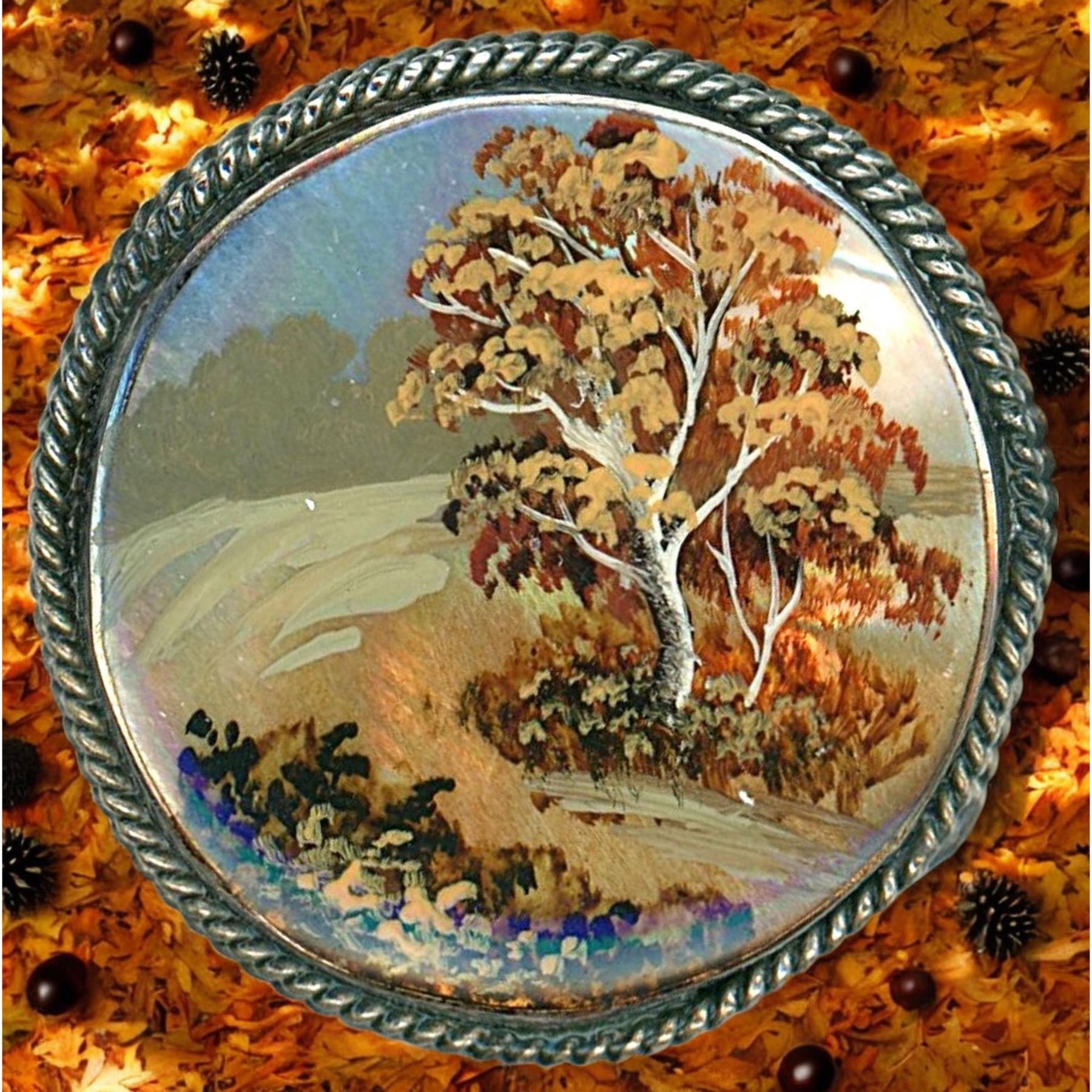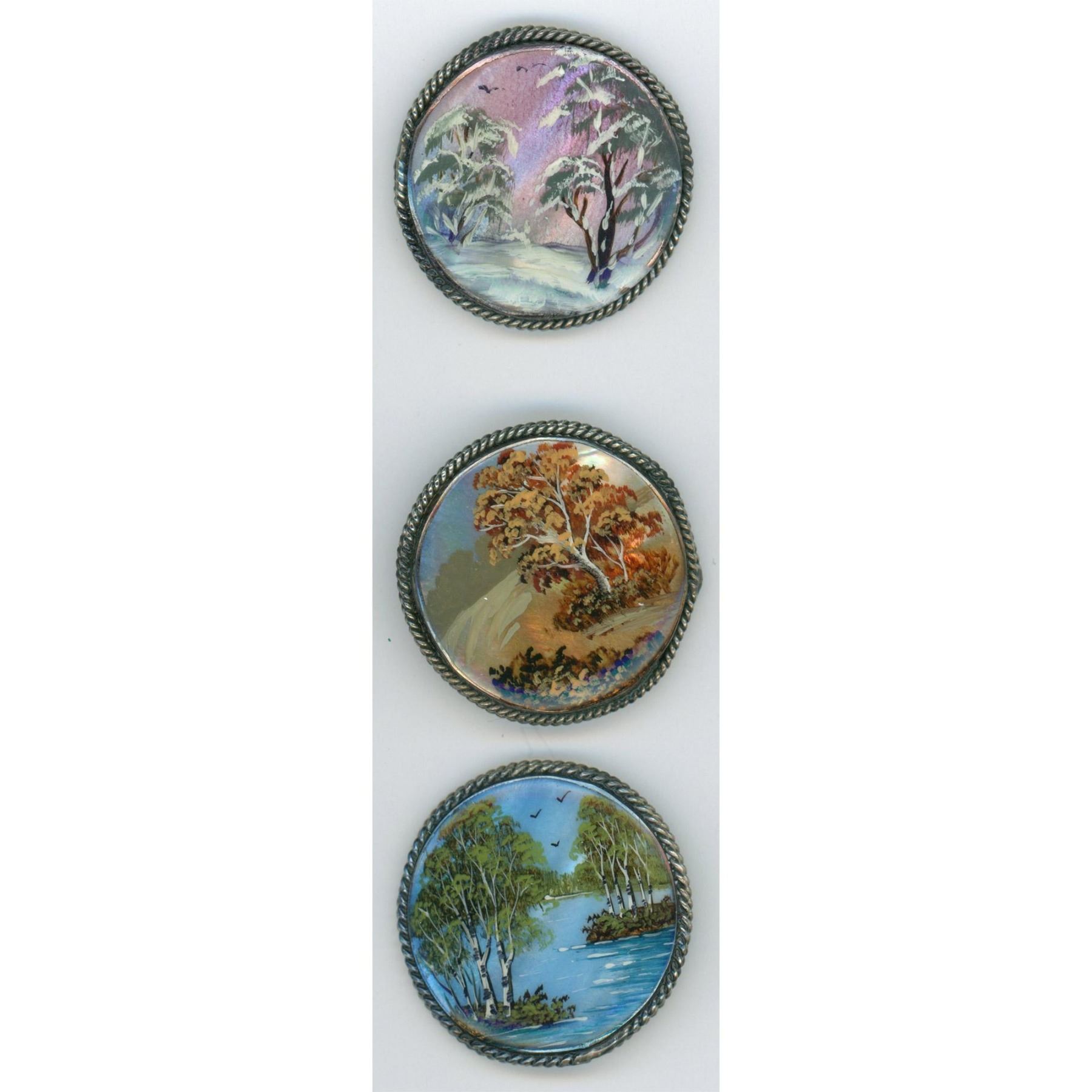 3 Large medium 20th century scenes in a metal setting. Here are three different scenes representing Summer, Autumn. Winter. The Summer scene almost looks light a Florida Highwaymen painting, very cool. These are very well done and may have possibly been painted in Russia but unsure. Rope twist borders and very nice examples.