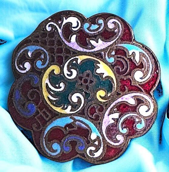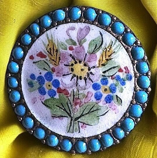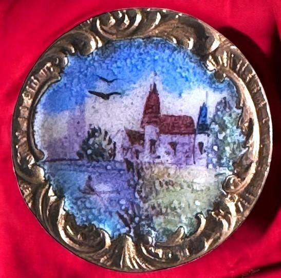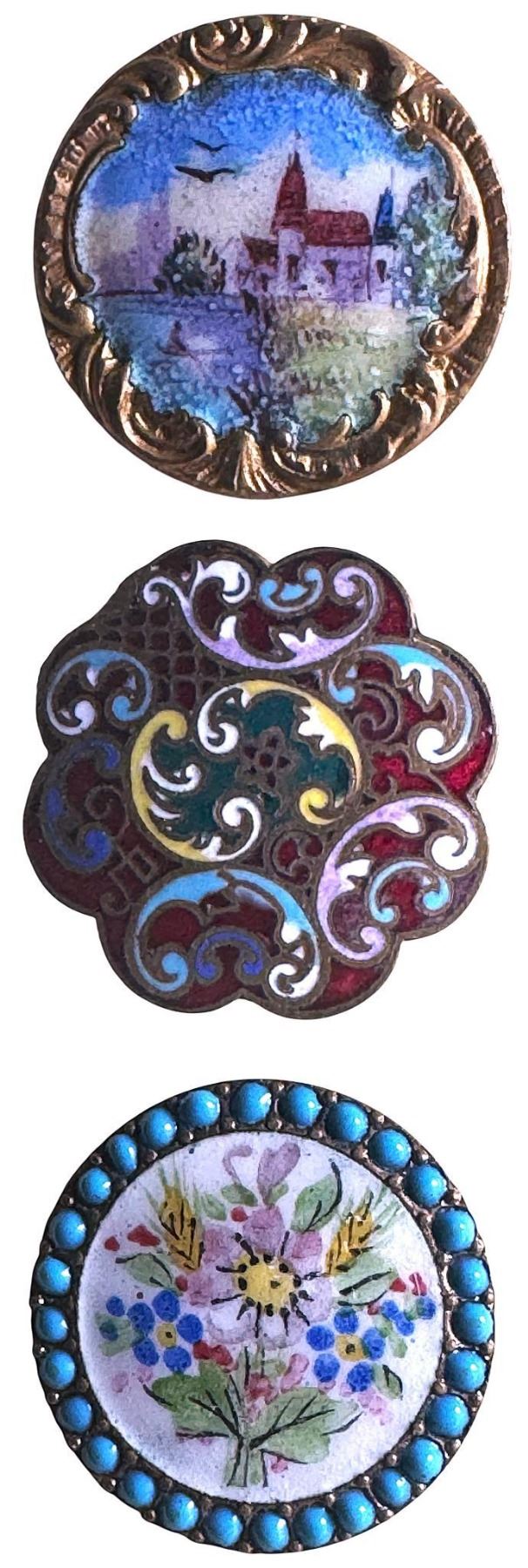 3 lovely medium 19th century pictorial examples. Here are three beautiful enamel examples from the collection of the late Paula Norby. This lot includes a nice Architectural scene, a beautiful floral with turquoise encrusted enamel border and a nice red and multi colored pattern example. Very fine examples.