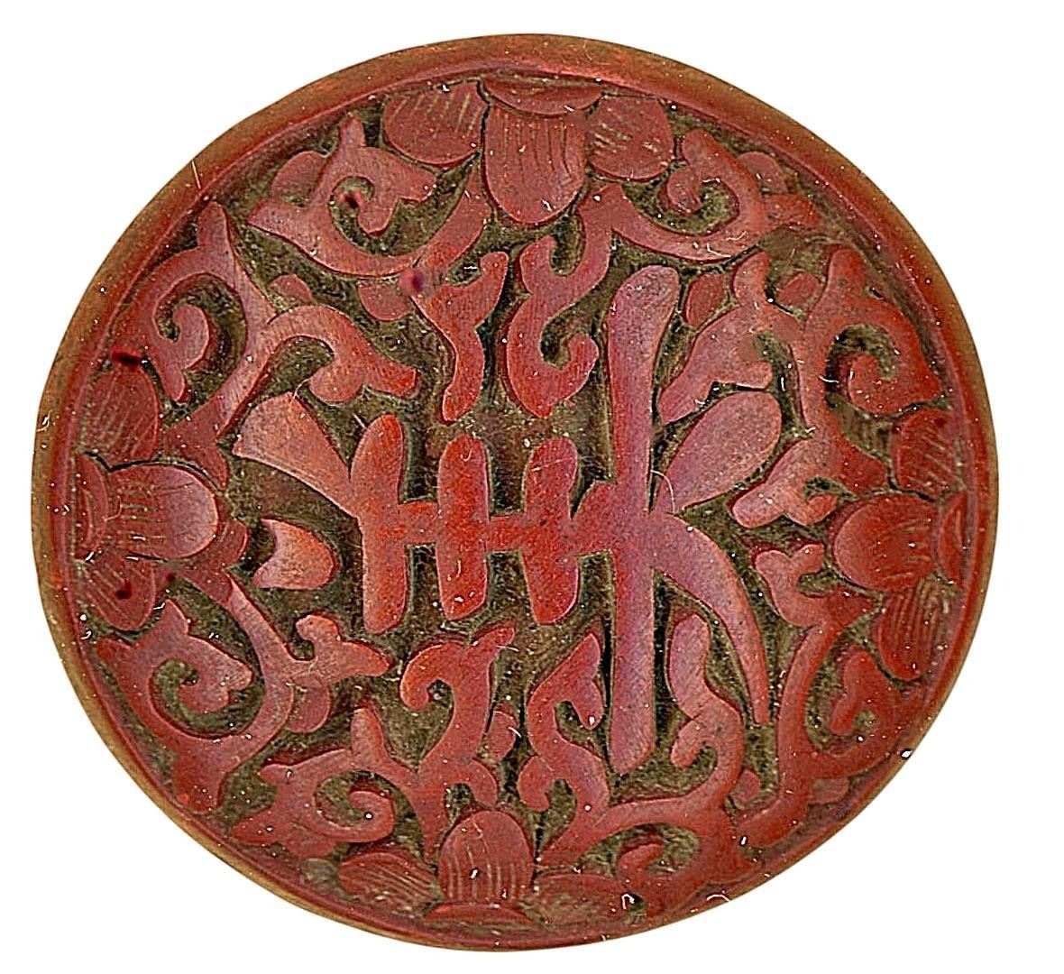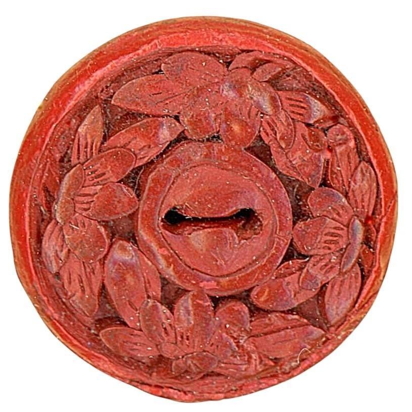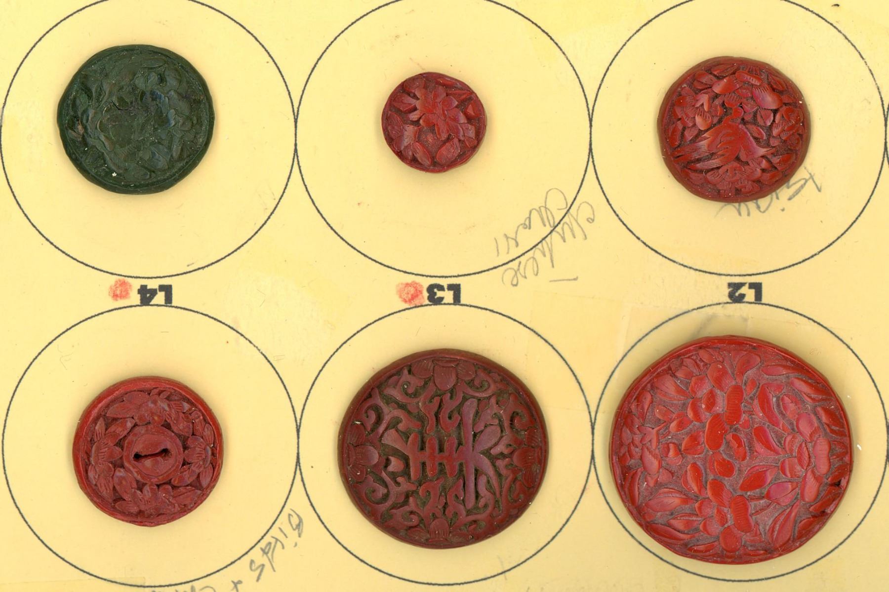 6 S/M/L early 20th C. examples including a rare green example. Although the typical colors in Chines Cinnabar buttons is red, other colors are found and are considered scarce. You can find white, black, purple, brown and green. This card includes a medium green example along with a scarce medium sew thru and more.