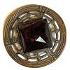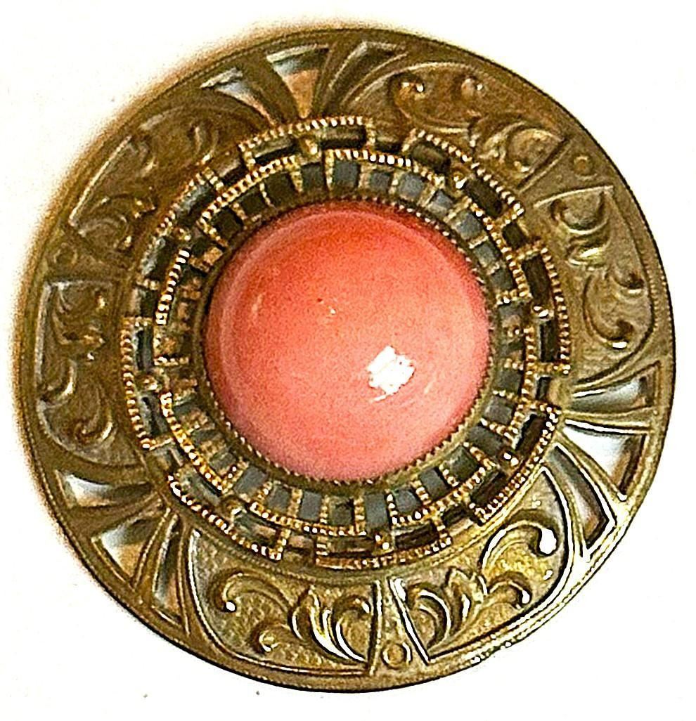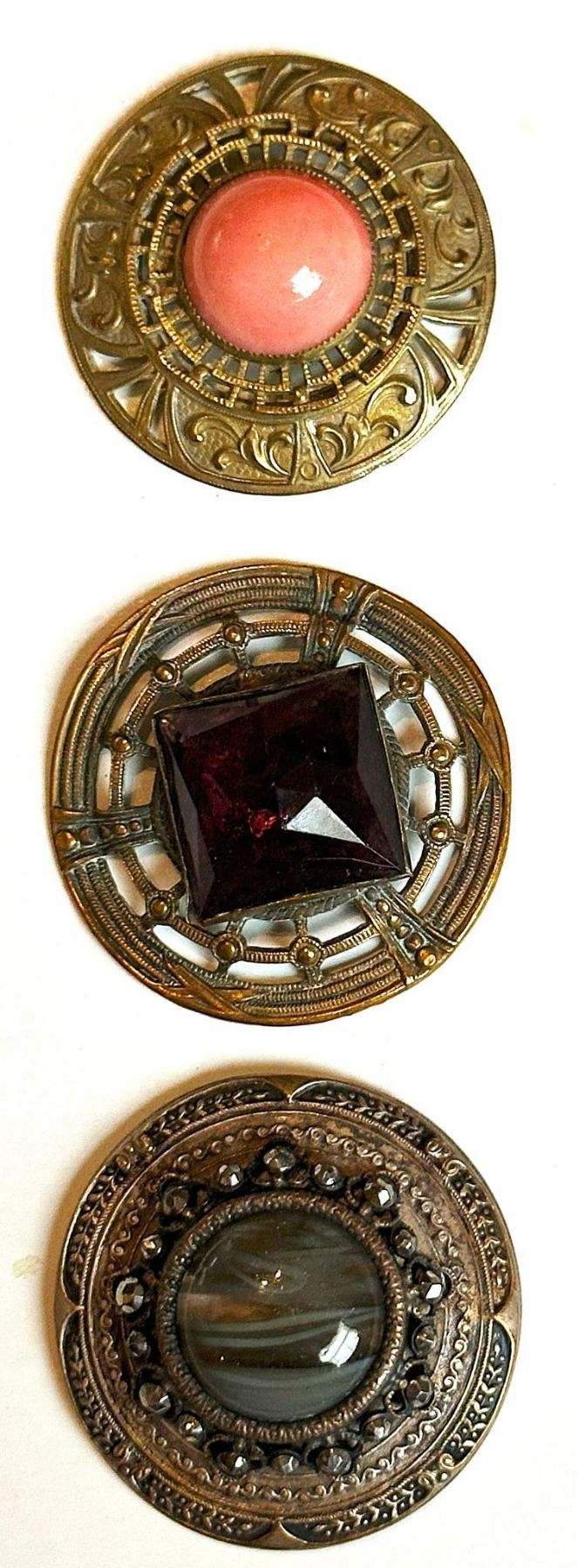 3 Large 19th century authentic Gay 90 examples. Here are three very nice Victorian period buttons known to collectors as Gay 90's. One is a beautiful salmon colored cabochon center in an ornate pierced brass setting, another in an ornate pierced setting houses a large faceted square purple glass stone, and the last example is for an ornate setting with an intermixed glass center surrounded by cut steels. # lovely examples.