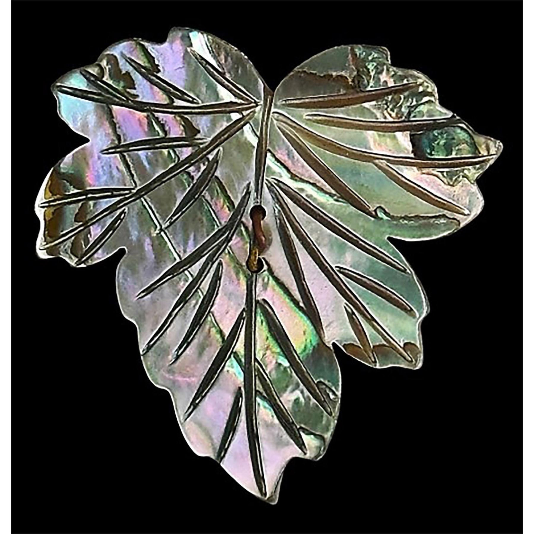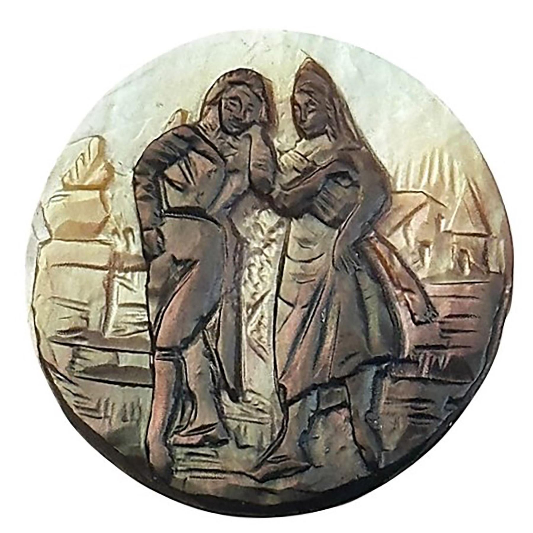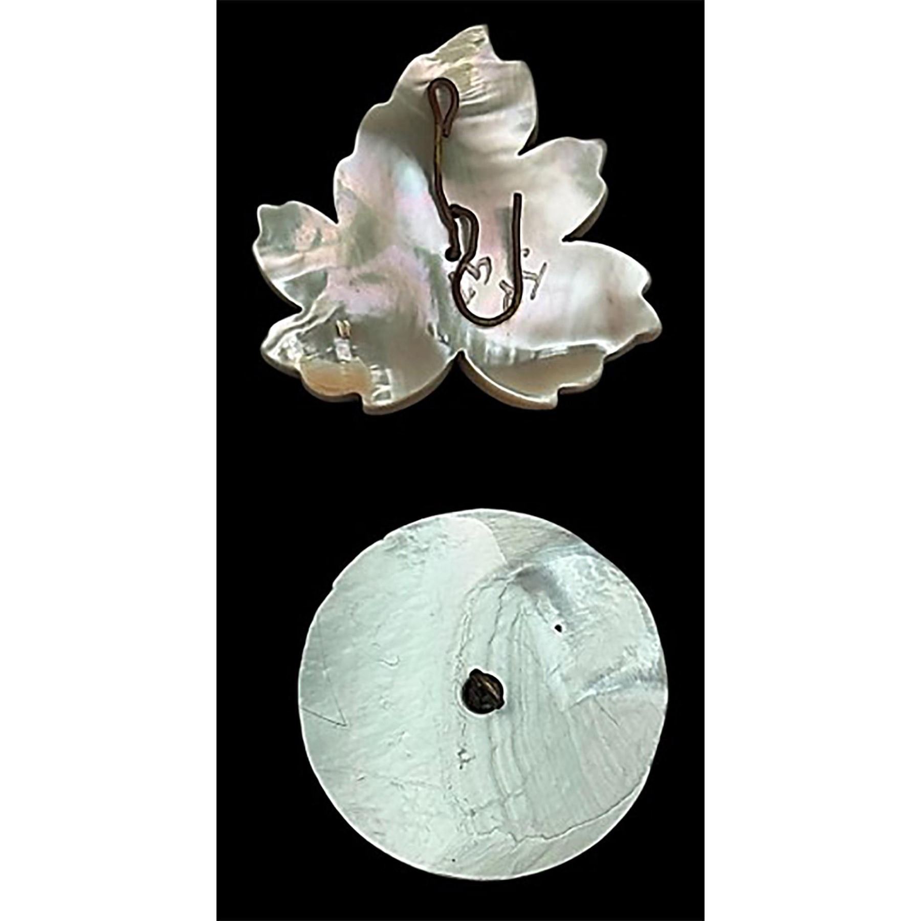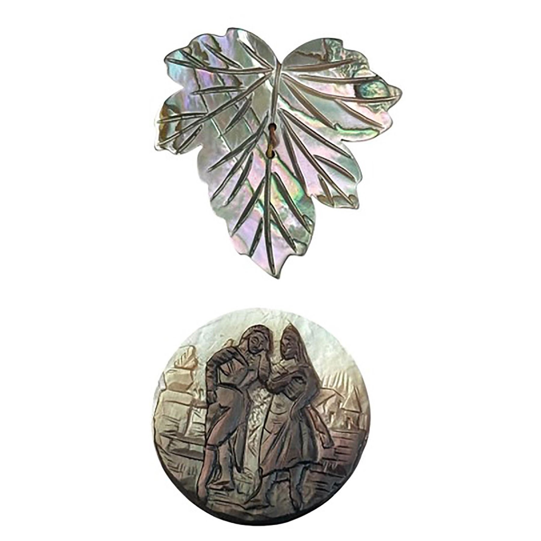2 Large 19th C. pictorial pearl buttons including realistic shape. This nice lot includes a wonderful abalone carved and engraved shell over green snail in a realistic leaf shape along with a carved brown shaded pearl of a couple.