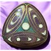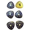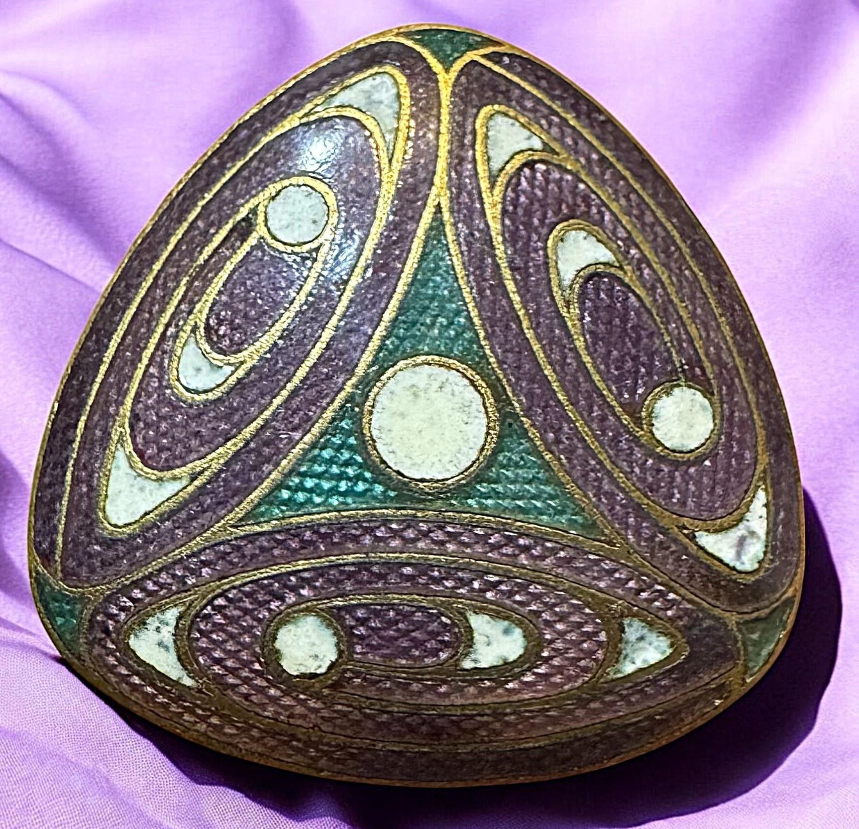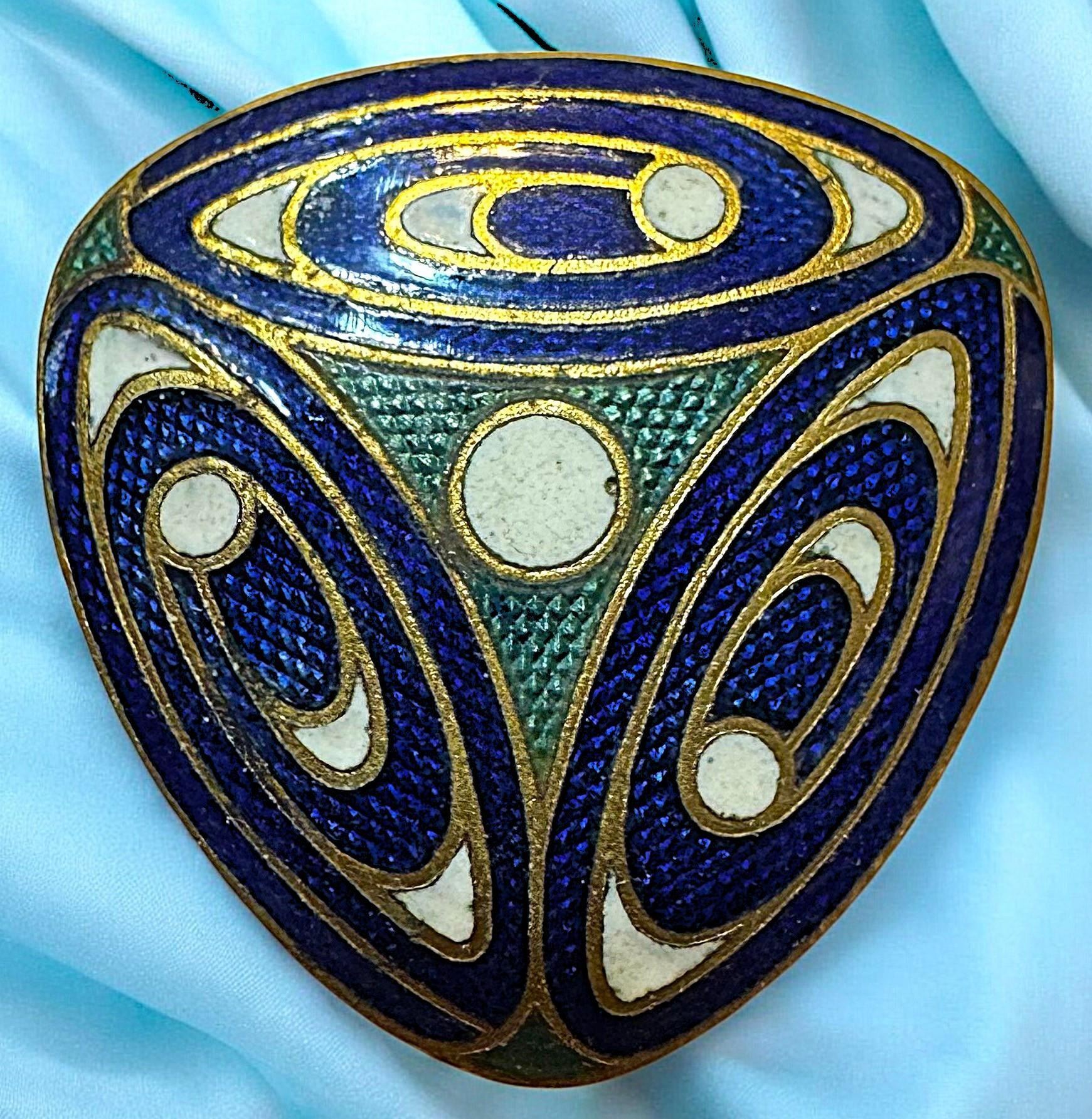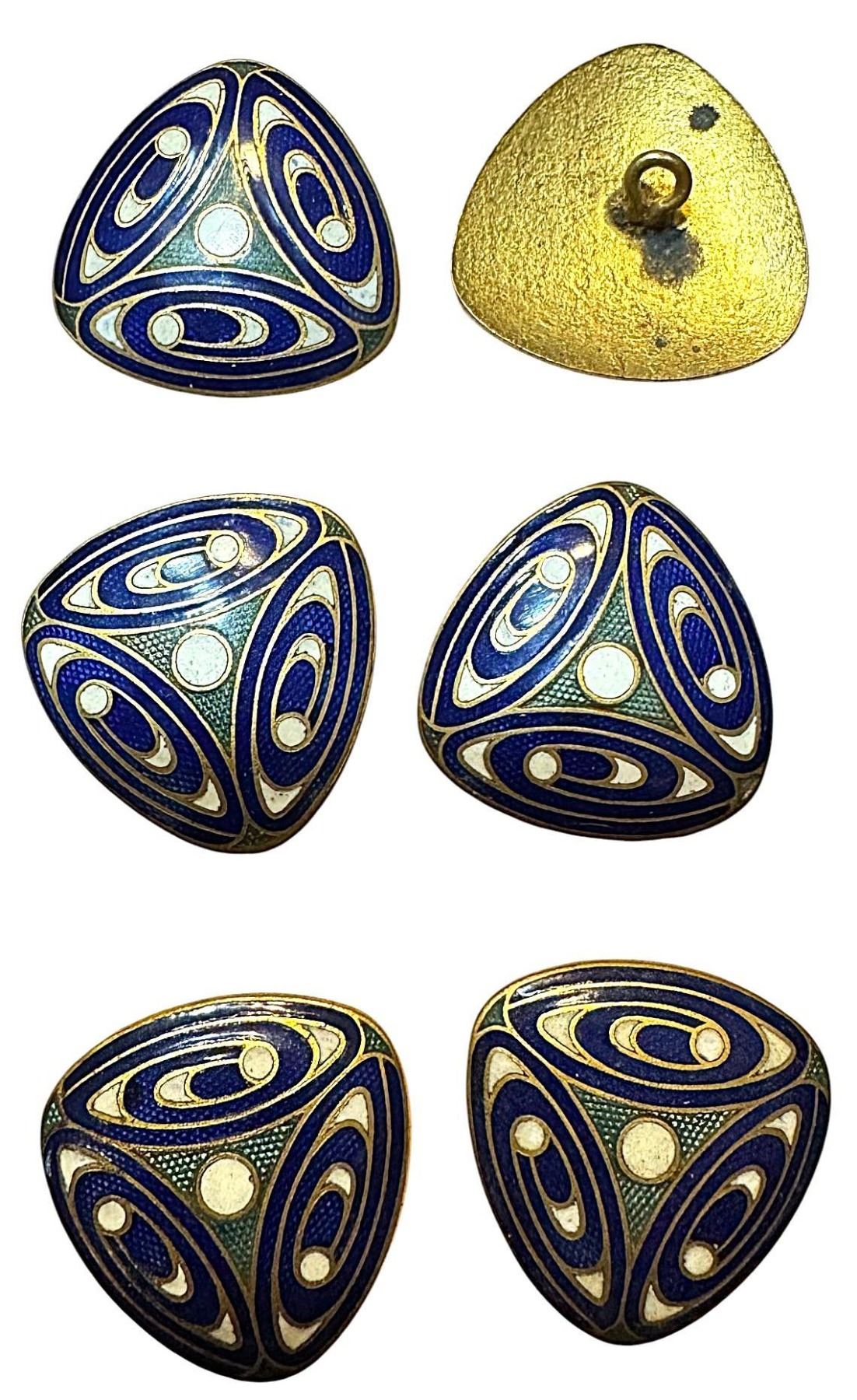 6 medium 19th century Basse Taille technique examples. This card of 6 matching designs are found here is two colors, 5 blue and1 purple. The enamel technique employed is that of Basse Taille. The unusual shape and the vibrant coloration on these make them desirable.