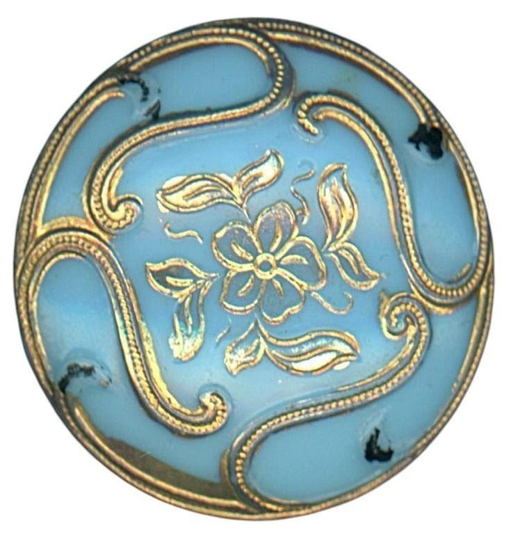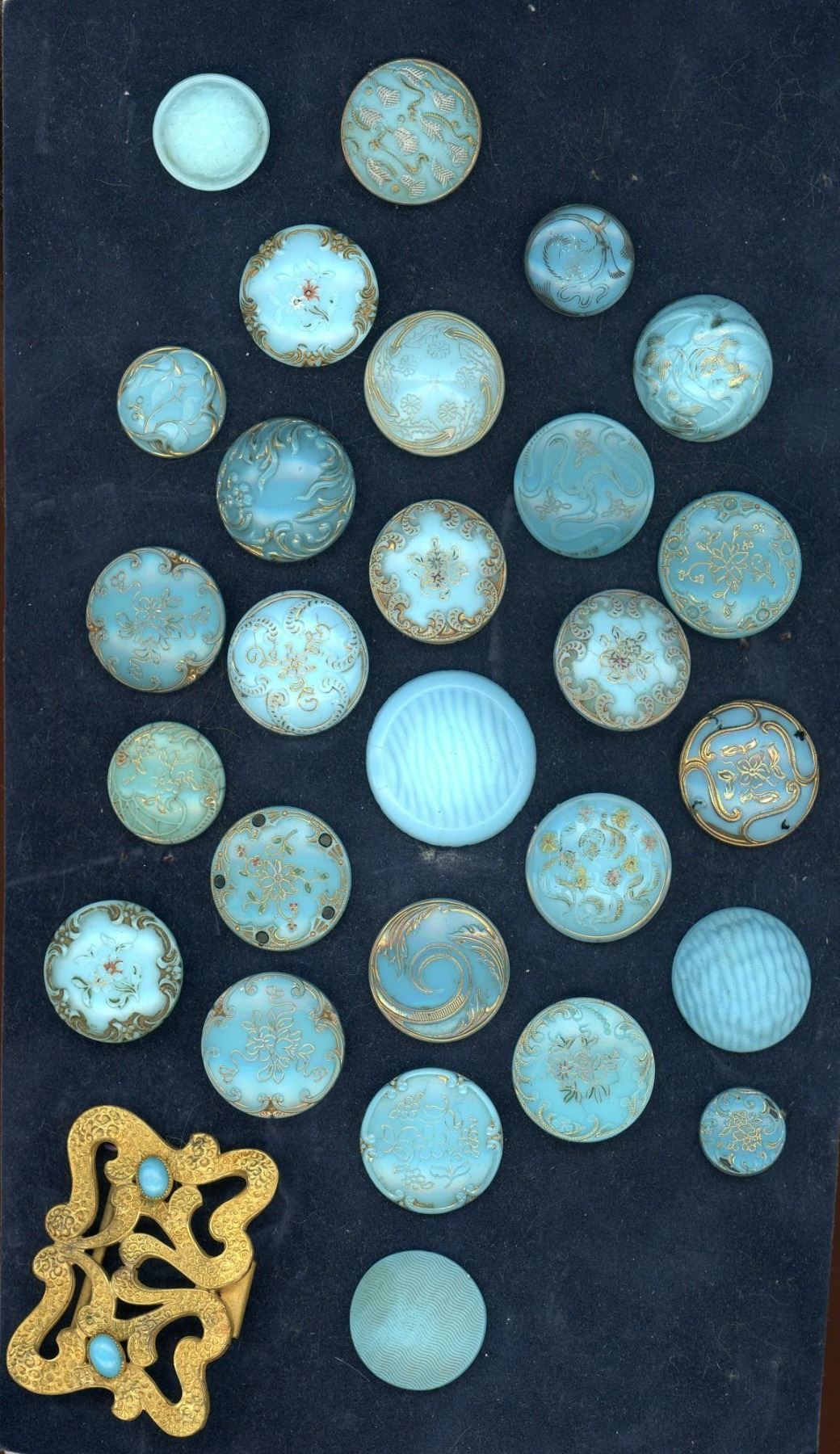 27 plus Small/Medium 19th century assorted Victorian examples. Here is a card of assorted designs and patterns on Turquoise colored Victorian glass buttons. The lot also includes 1 buckle half with turquoise glass inset.