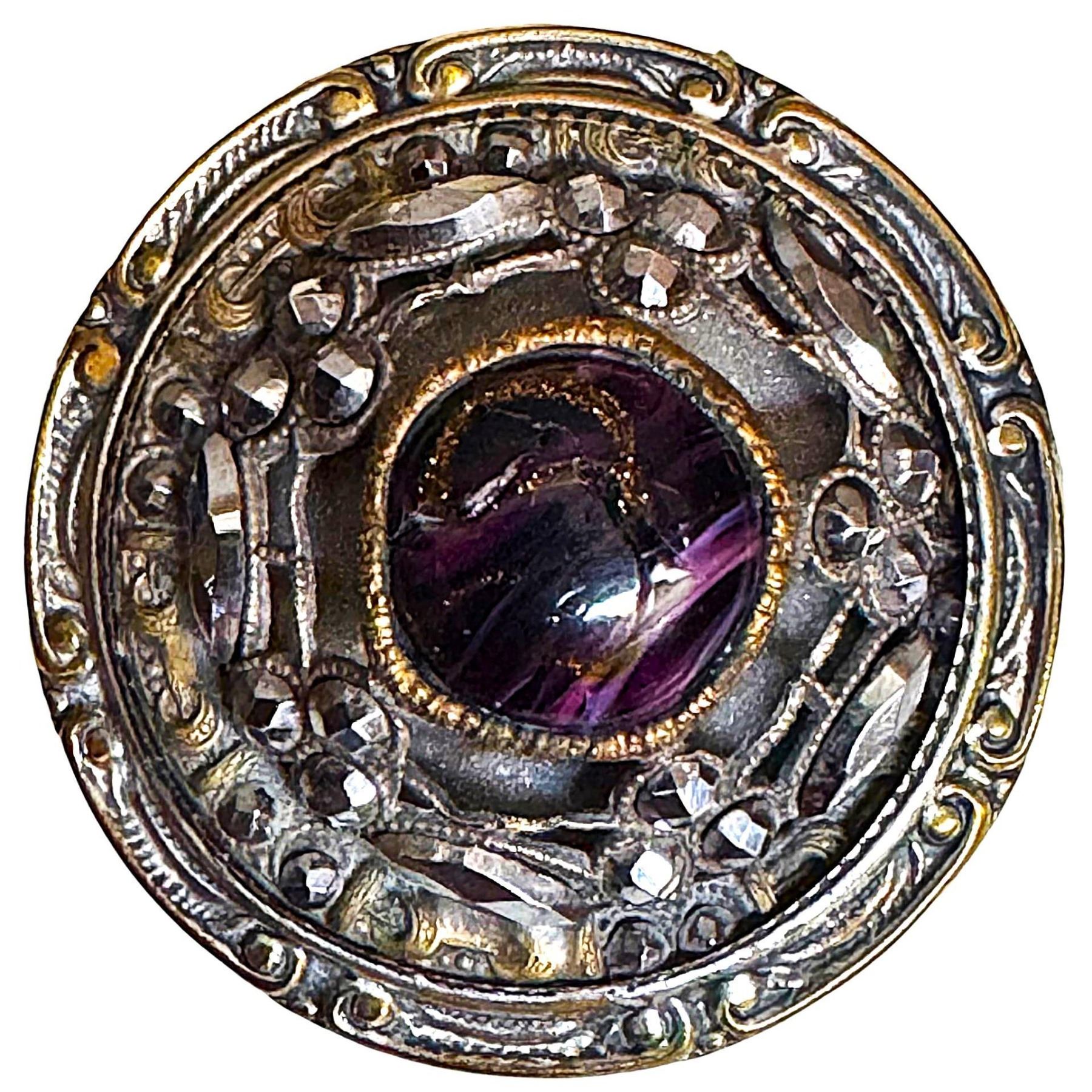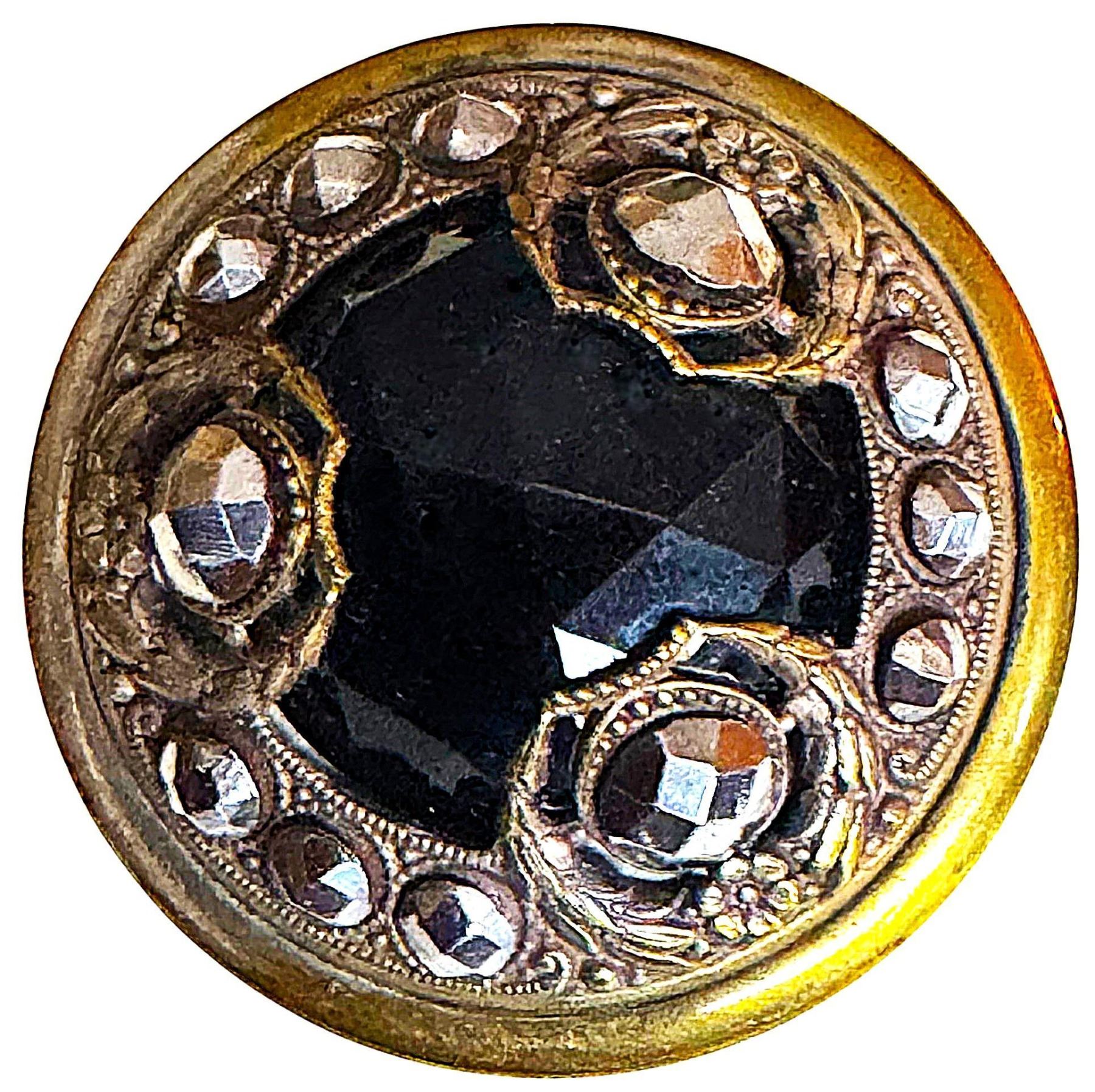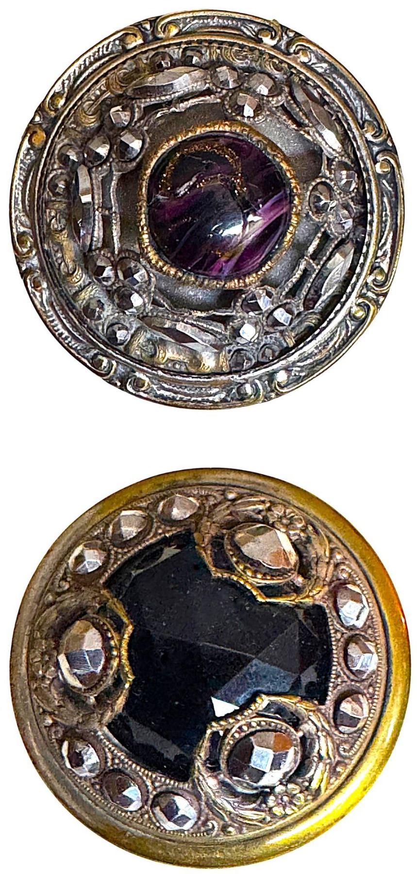 2 Large early 20th century large jewel examples. Here we have two nice quality large jewel black glass centers one is intermixed with purple and goldstone, The closed backs are slightly later in time than their predecessors, known to collectors as Gay 90 buttons. These are still of very high quality for large jewels.