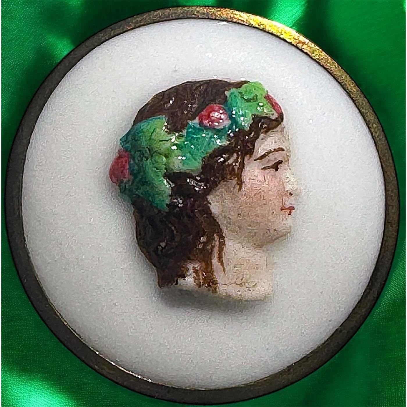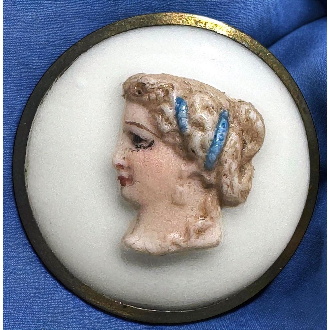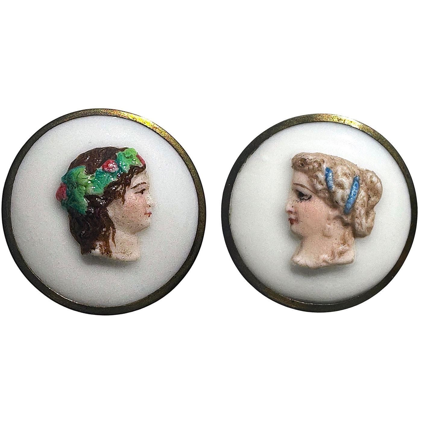 2 Medium size 19th century high relief colored glass heads. Here we have two different beautifully made white glass in metal with high relief heads that are hand colored. These are beautifully executed and make for wonderful glass in metal buttons on a competition tray.