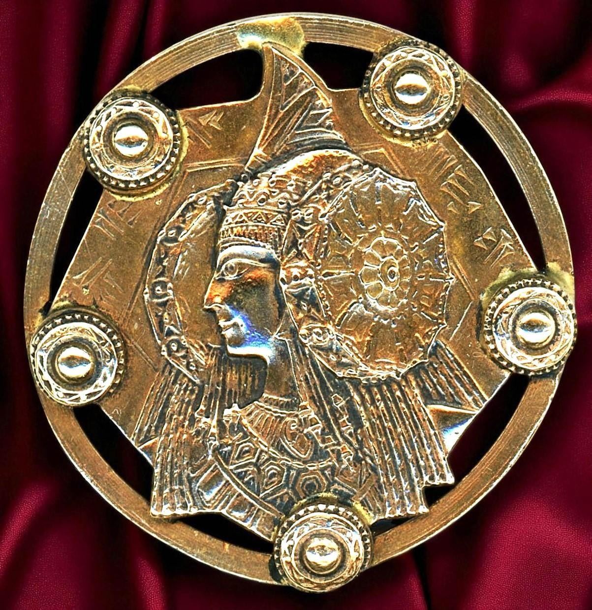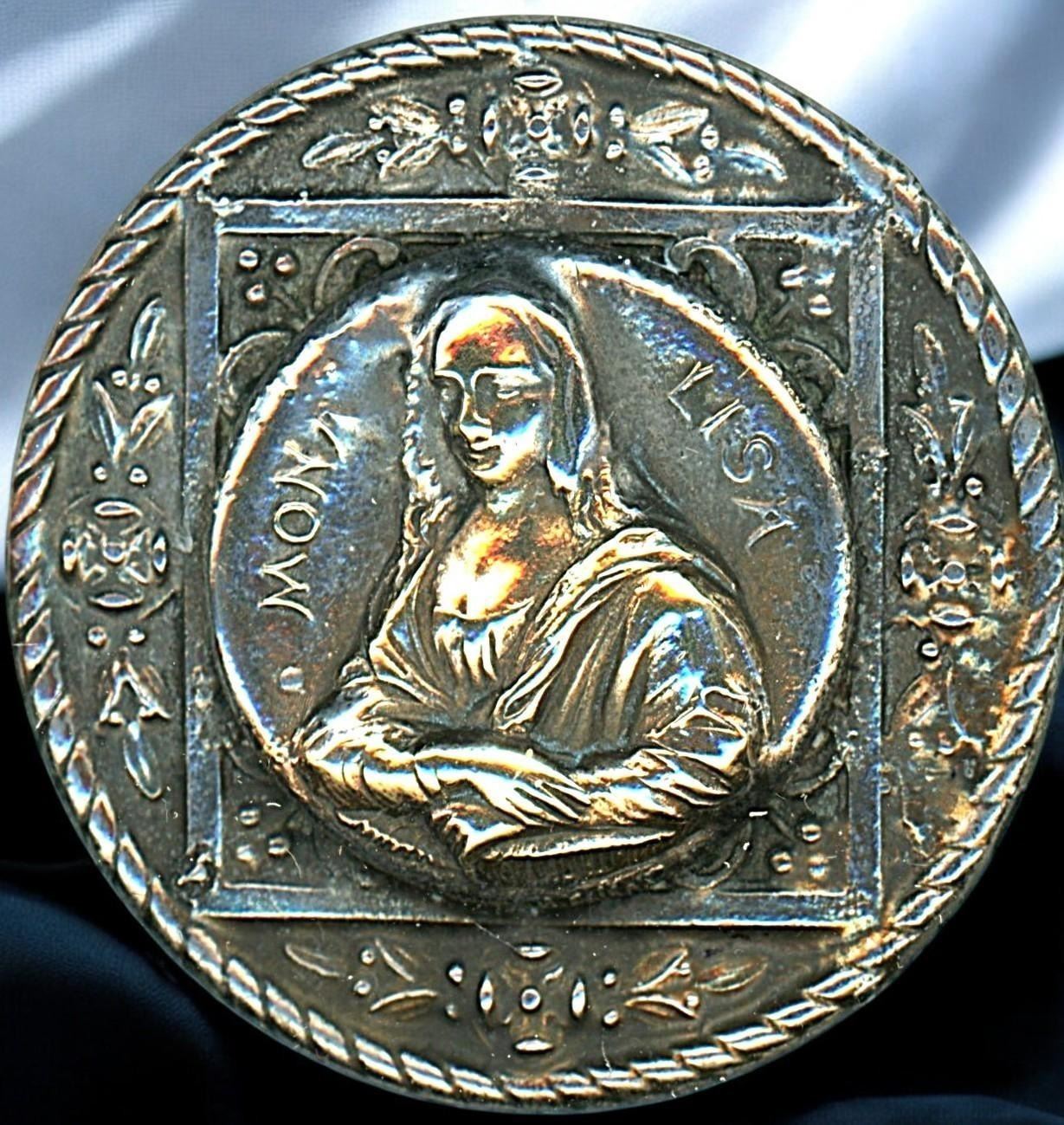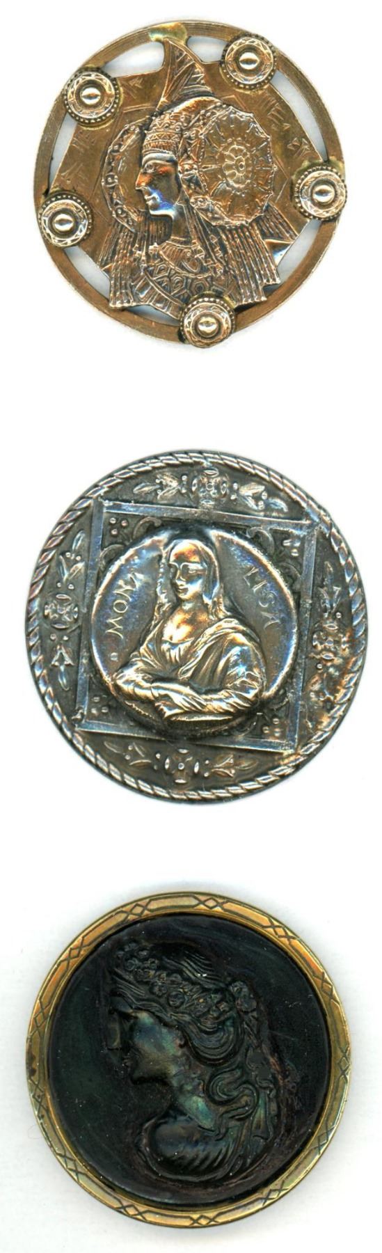 3 Large 19th century all female examples. This card includes a great and scarce pierced fine quality heavy brass Egyptian female example along with a black glass female profile in metal and a detailed and fine silvered brass of Mona Lisa with a verbal of her name around her bust.