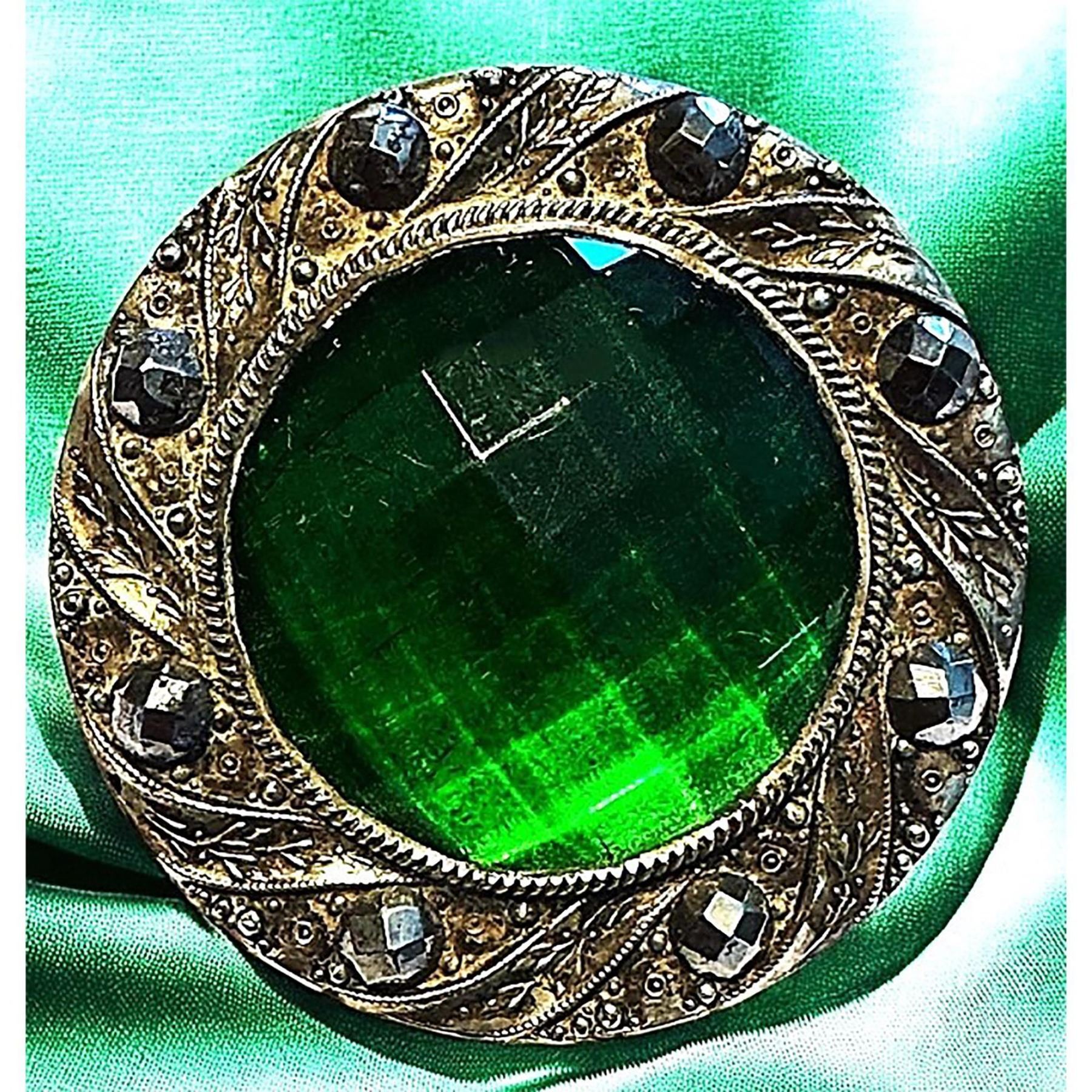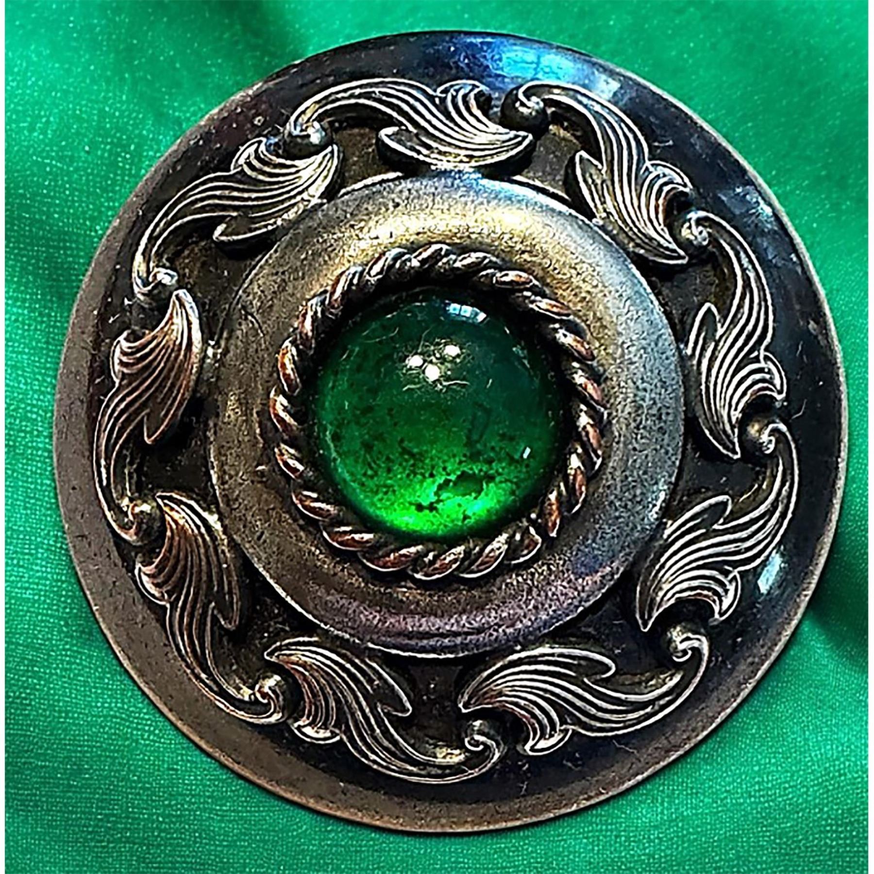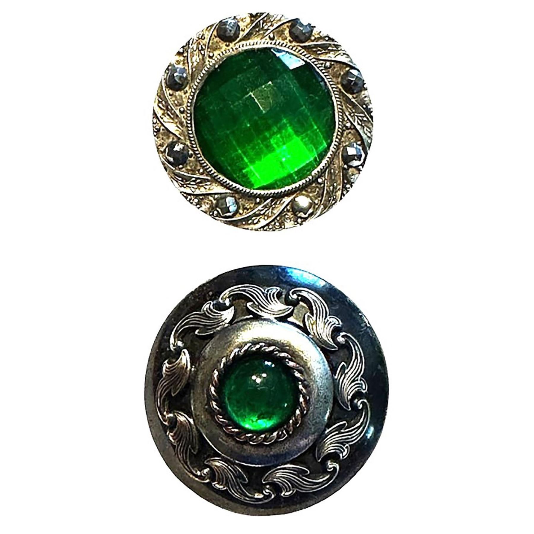 2 Large early 20th century green glass in metal buttons. ere are two very nice examples from buttons after the gay 90 era. These are 2 beautifully made large jewel buttons and in fine condition.
