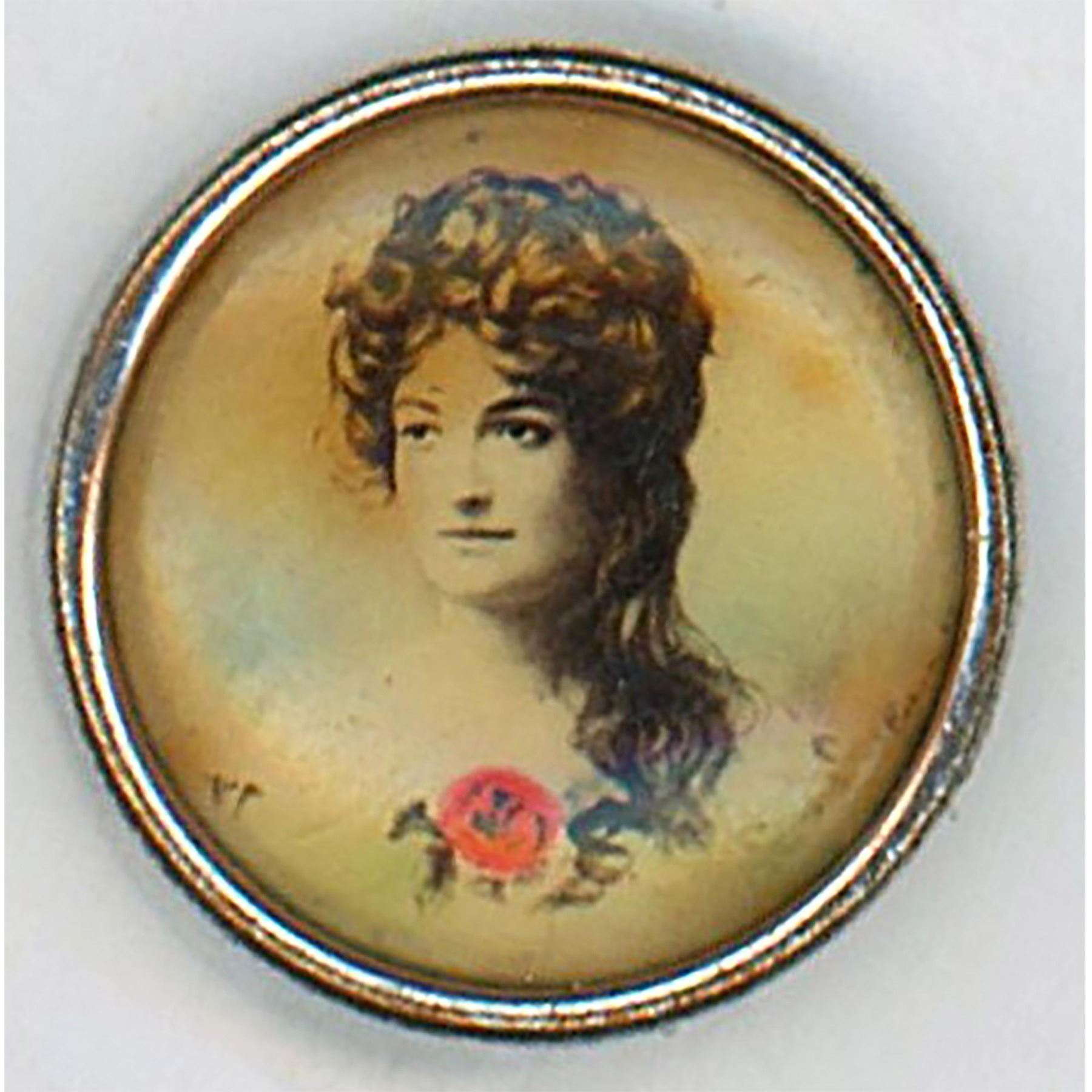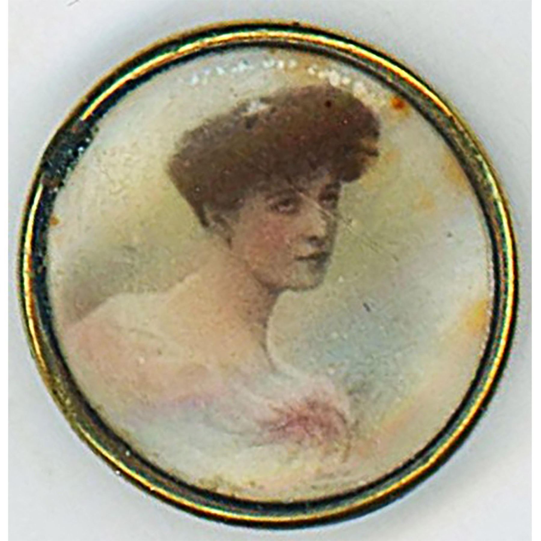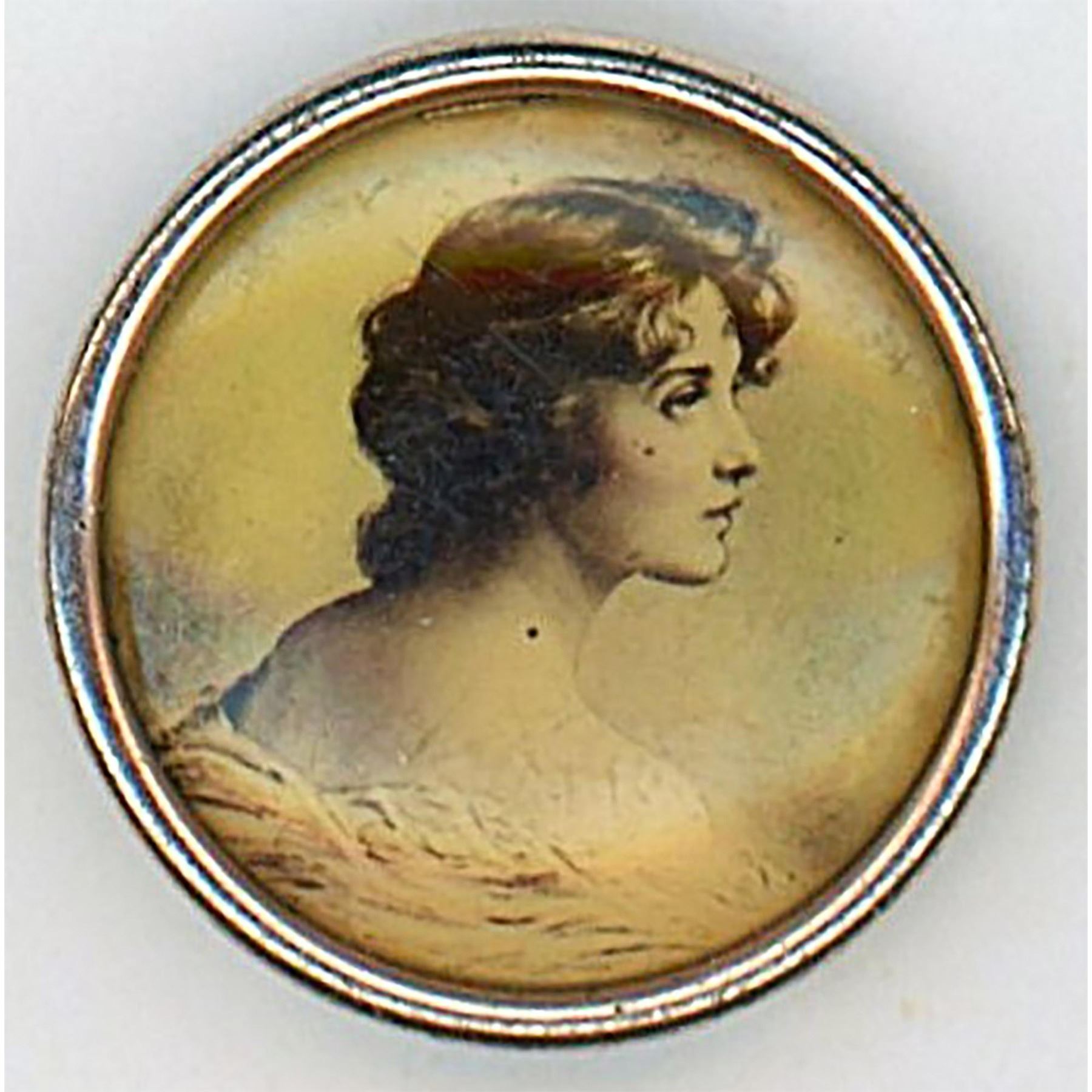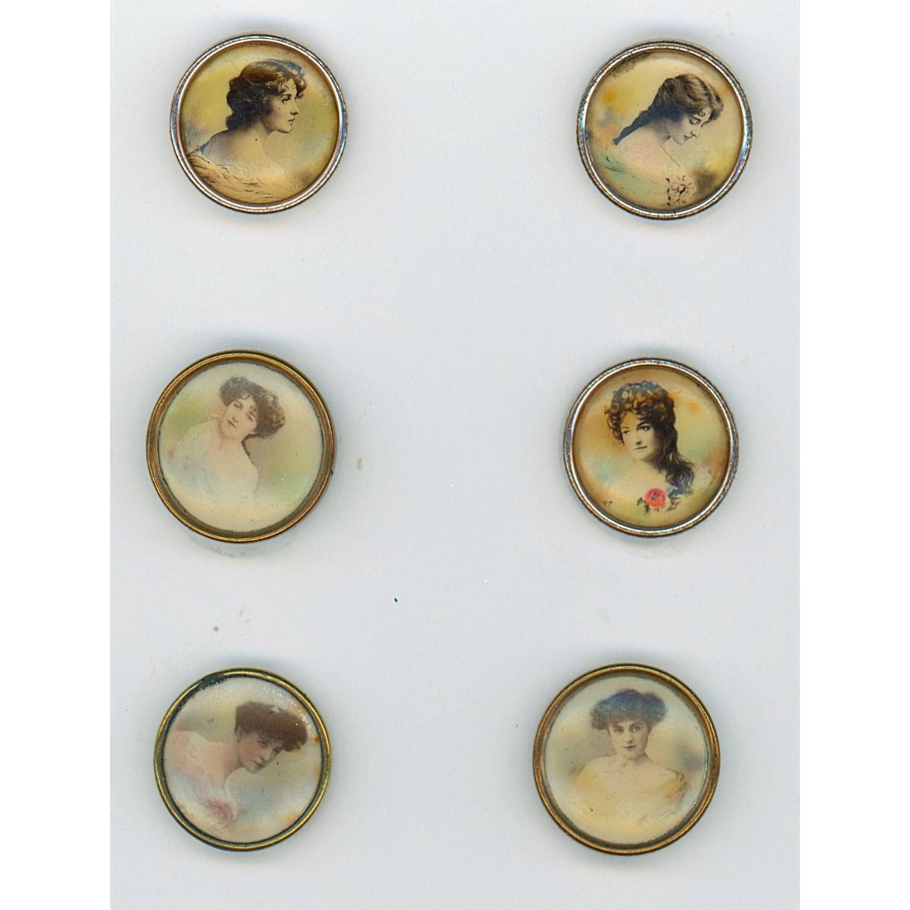 6 small late 19th early 20th C. under celluloid shield buttons. Here are 6 different ladies. These lithos some with backmarks have always been desirable among collectors. Some are accented with a little color.