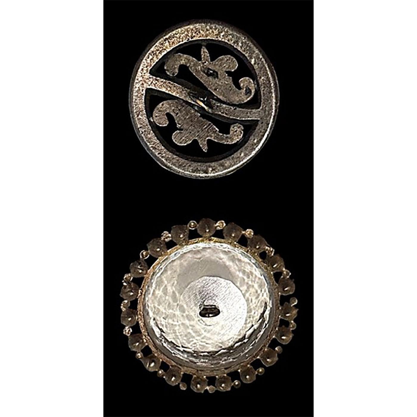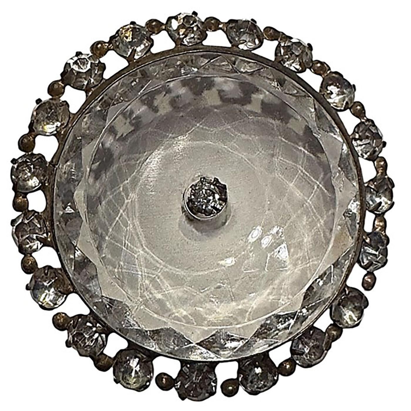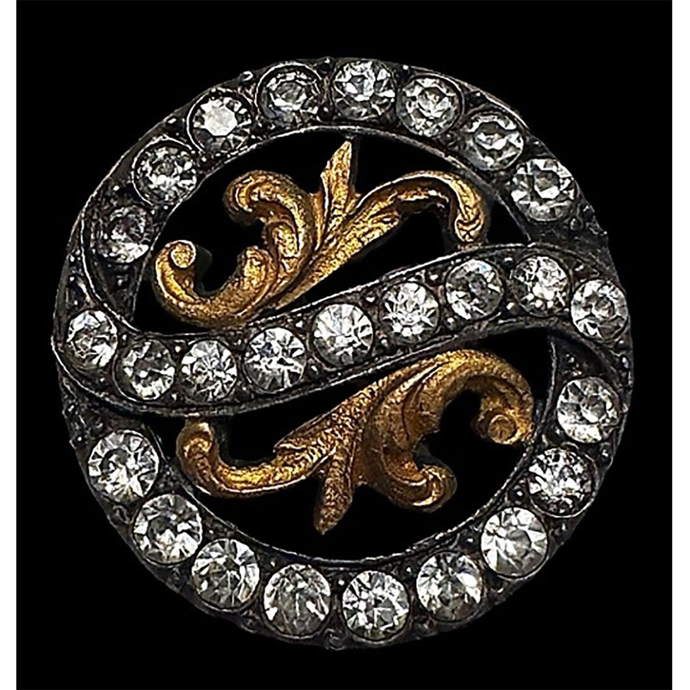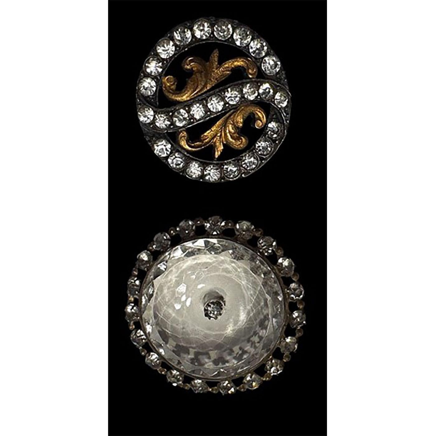 2 Large 19th century buttons including glass and metal. Here are two different examples of paste bordered buttons from the 19th century. One example has a large faceted clear glass concave center set with a brass rim with brilliant cut paste jewels, this example is a glass button not a glass in metal example. The other button shows a paste border in an early and high quality silver setting and an openwork design with gilded silver acanthus leaves set with a paste scroll like center, very stunning examples here.