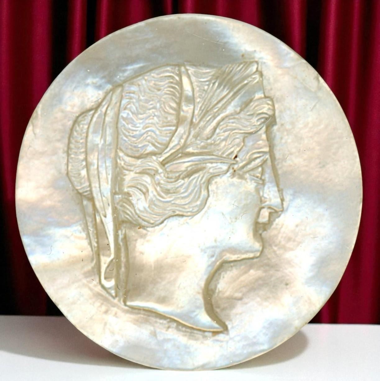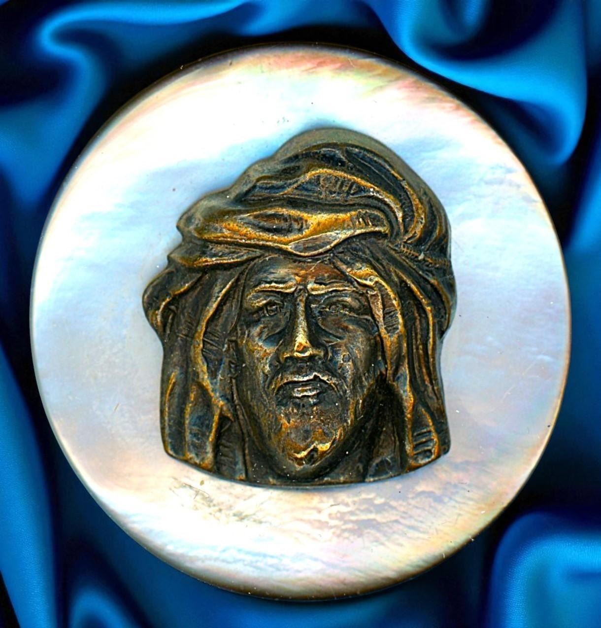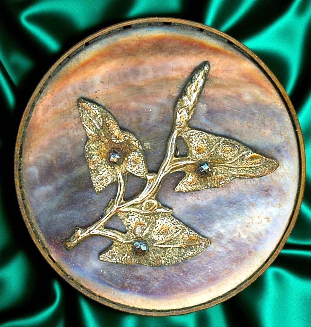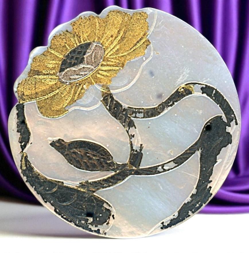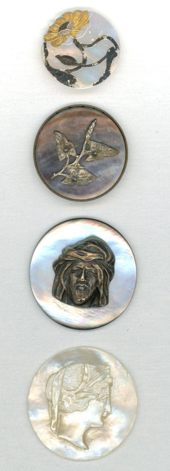 4 Large 19th century examples including pictorial. This lot includes a beautiful carved pearl of a female profile, a smokey pearl of a turban hat man, a nice brass leaf example and an Art Nouveau gilded floral example.