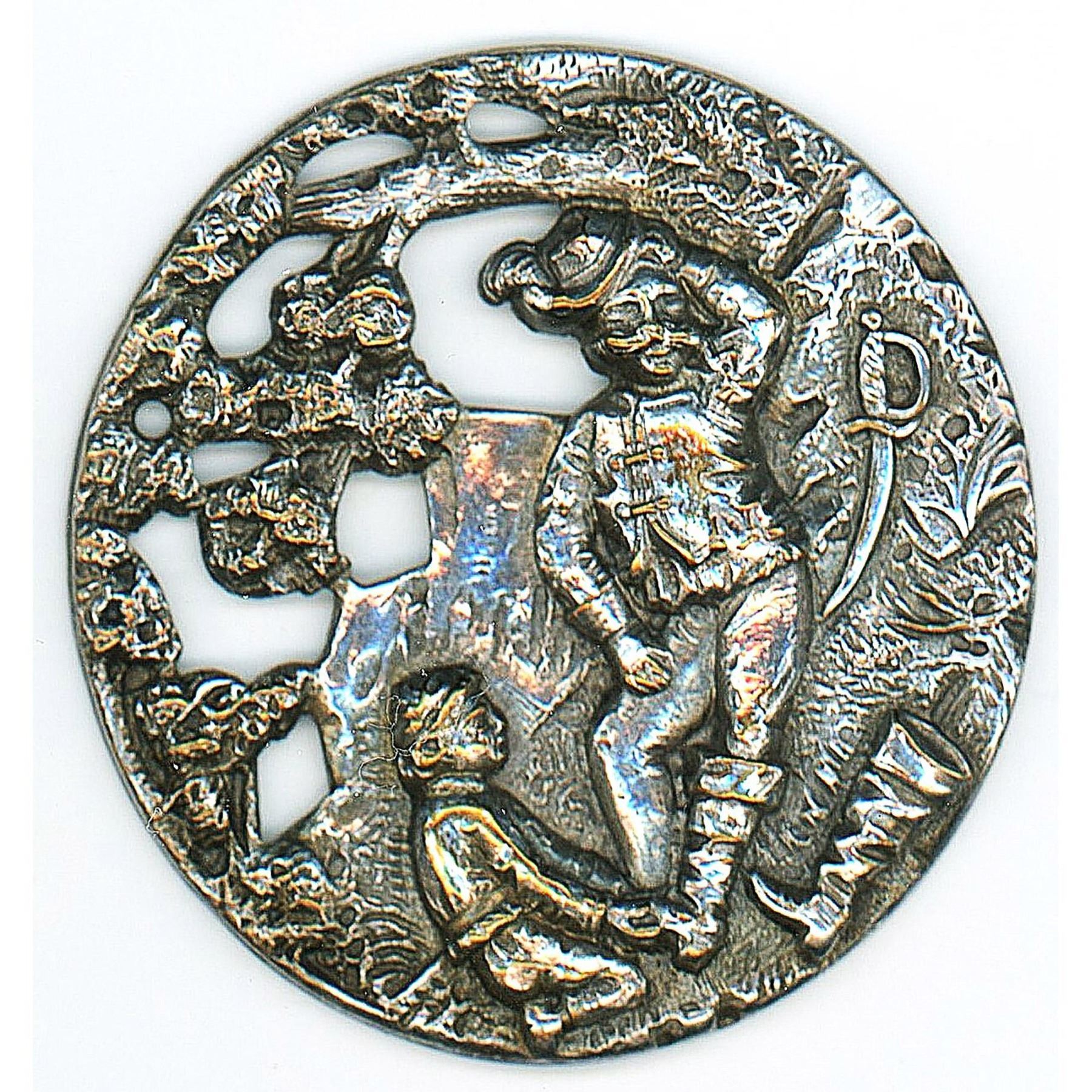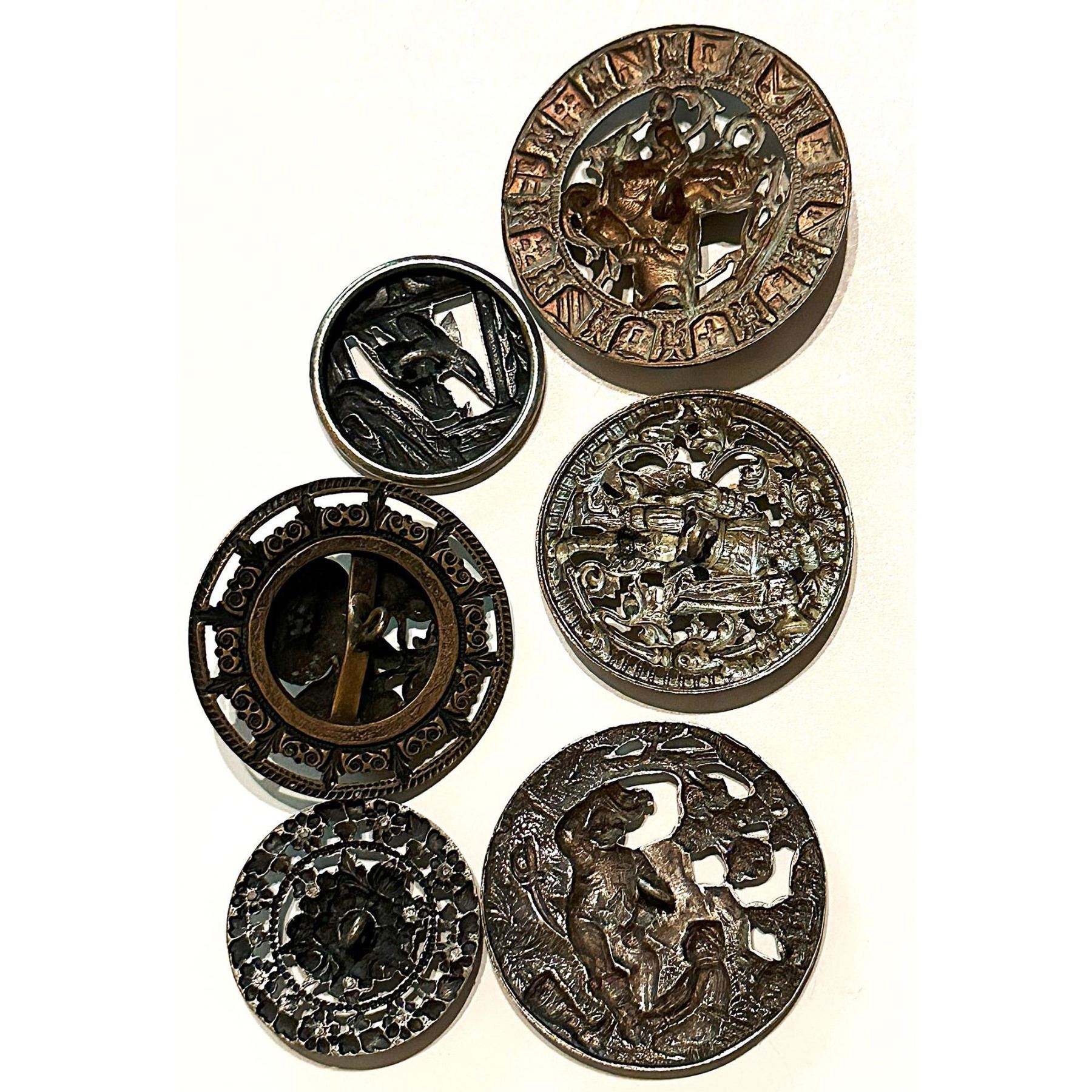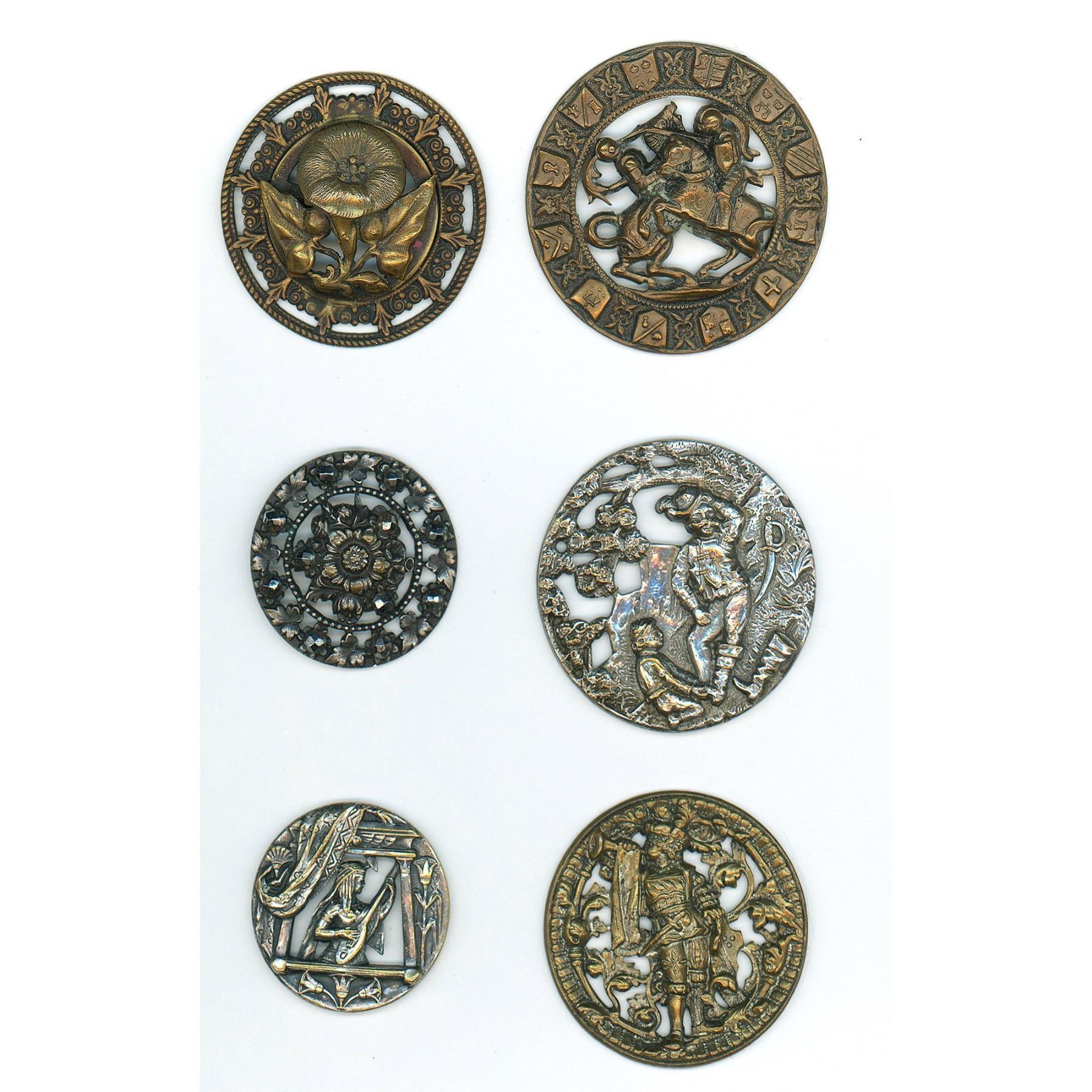 6 Medium/Large 19th century pierced metal examples. This nice selection includes Cleopatra on a Balcony, "Tom Thumb and the Seven Leagues Boot", a wonderfully detailed flower and leaves in high quality design and more.