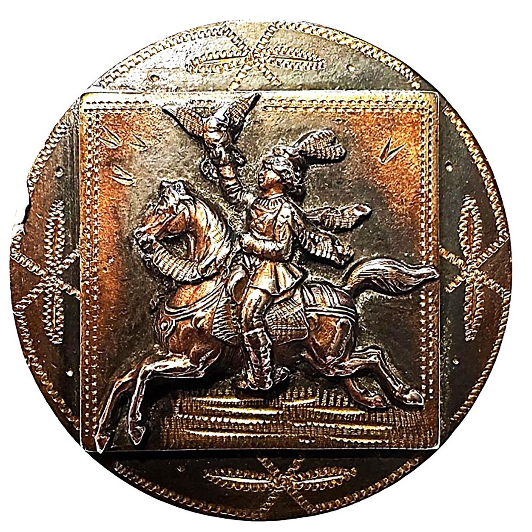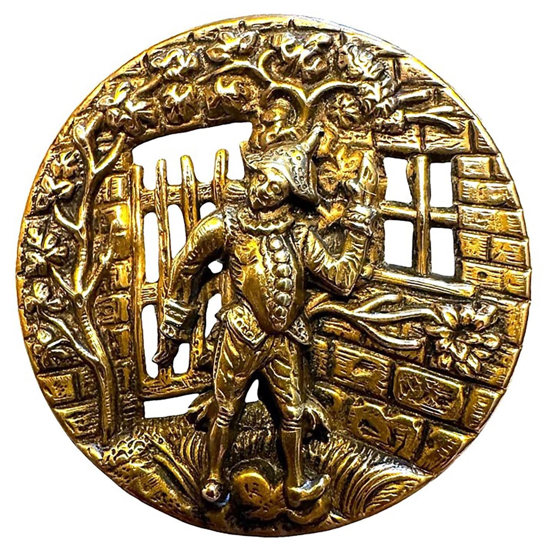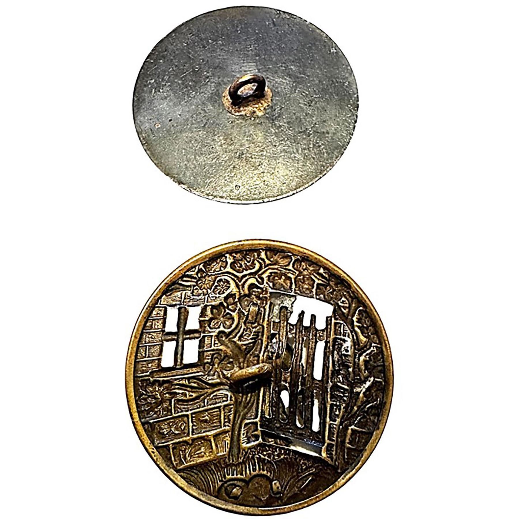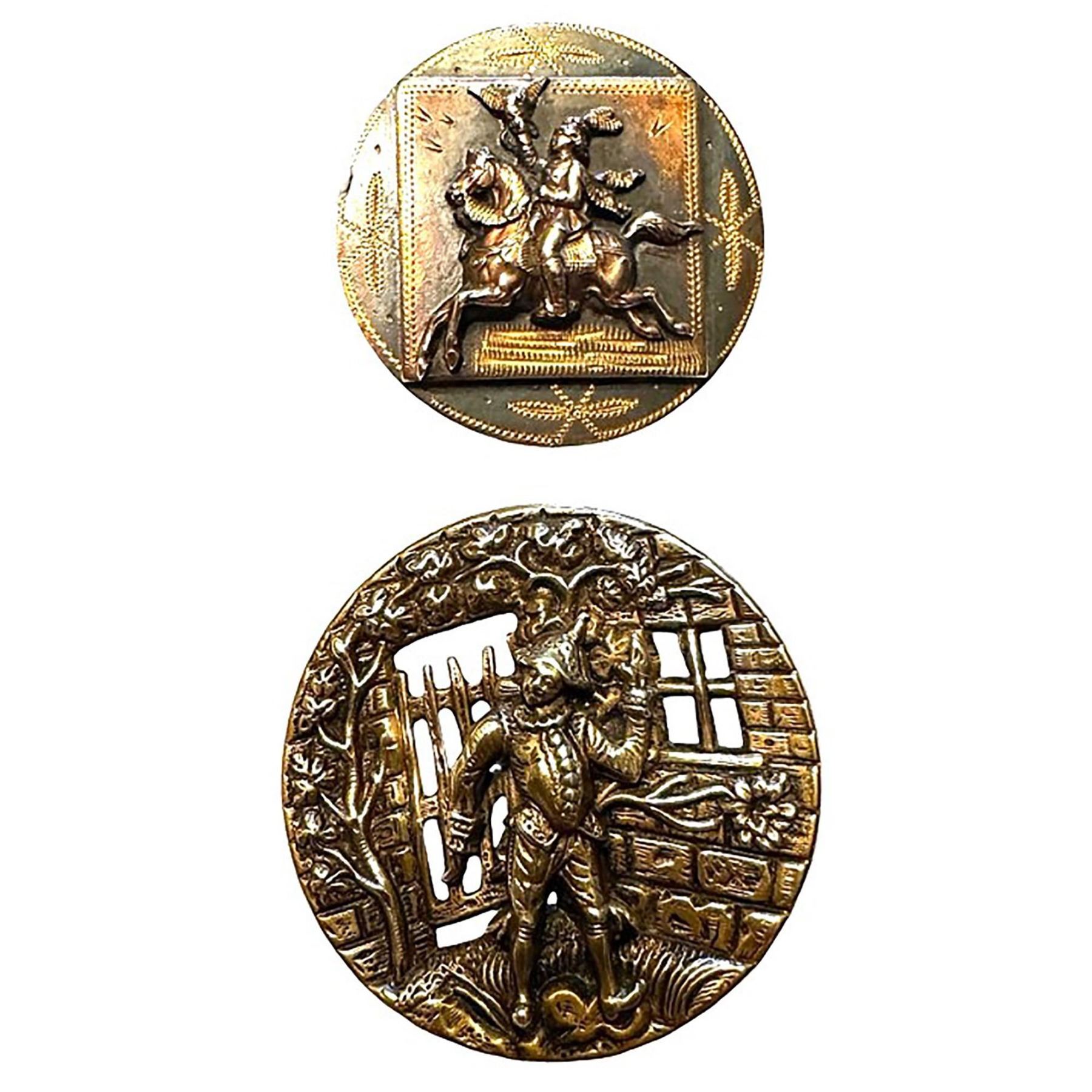 2 Large 19th century detailed brass picture buttons. Here we have a nice tole background (engraved) horse and rider button along with a detailed figural button of a jester amongst a pierced gate and window, Two very fine quality picture buttons.