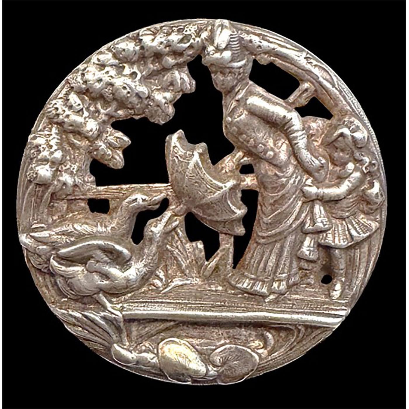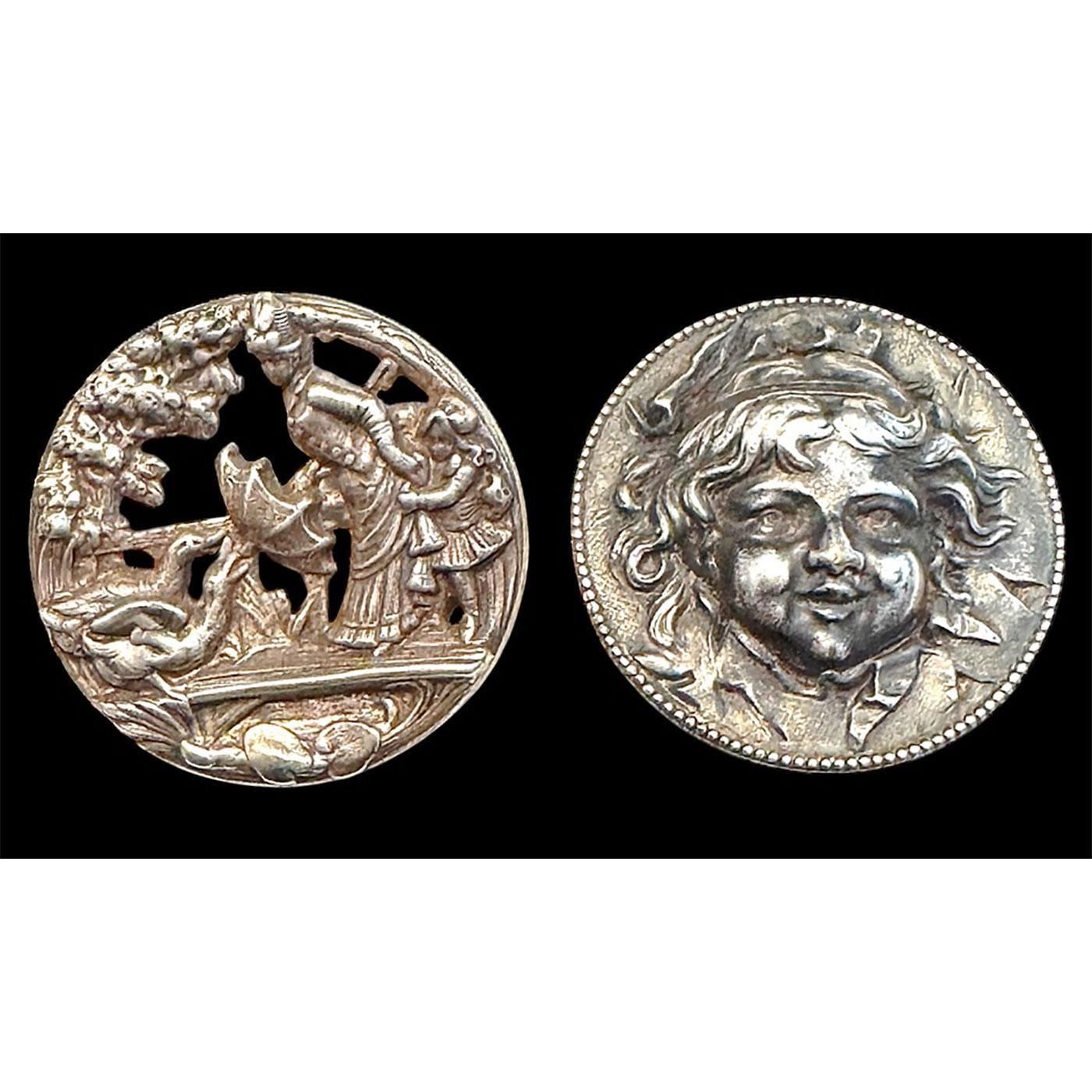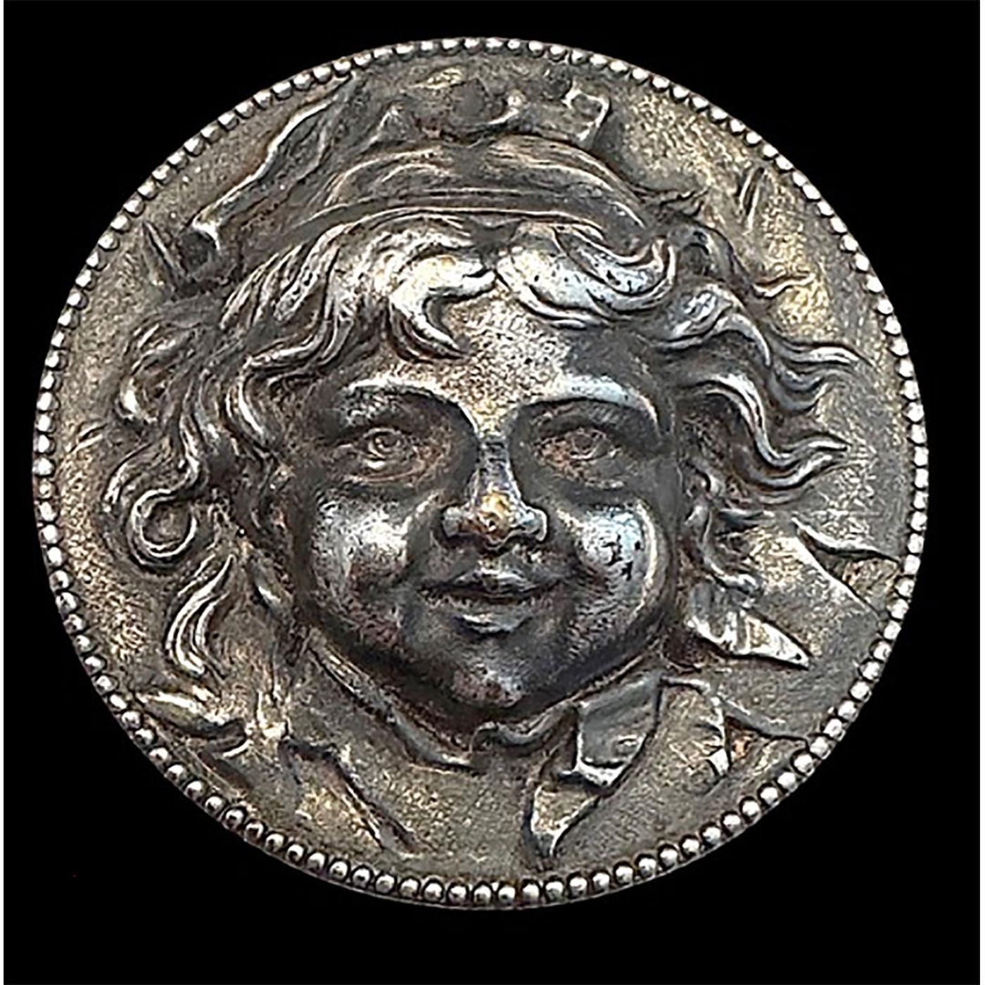 2 Large early 20th C. silvered including "Shooing the Geese". Here we have two nice examples from the collection of Nikki Deal. One is a high relief children's head example in fine detail and the other is a silvered brass pierced example of the women with child behind "Shooing the Geese" with her umbrella.