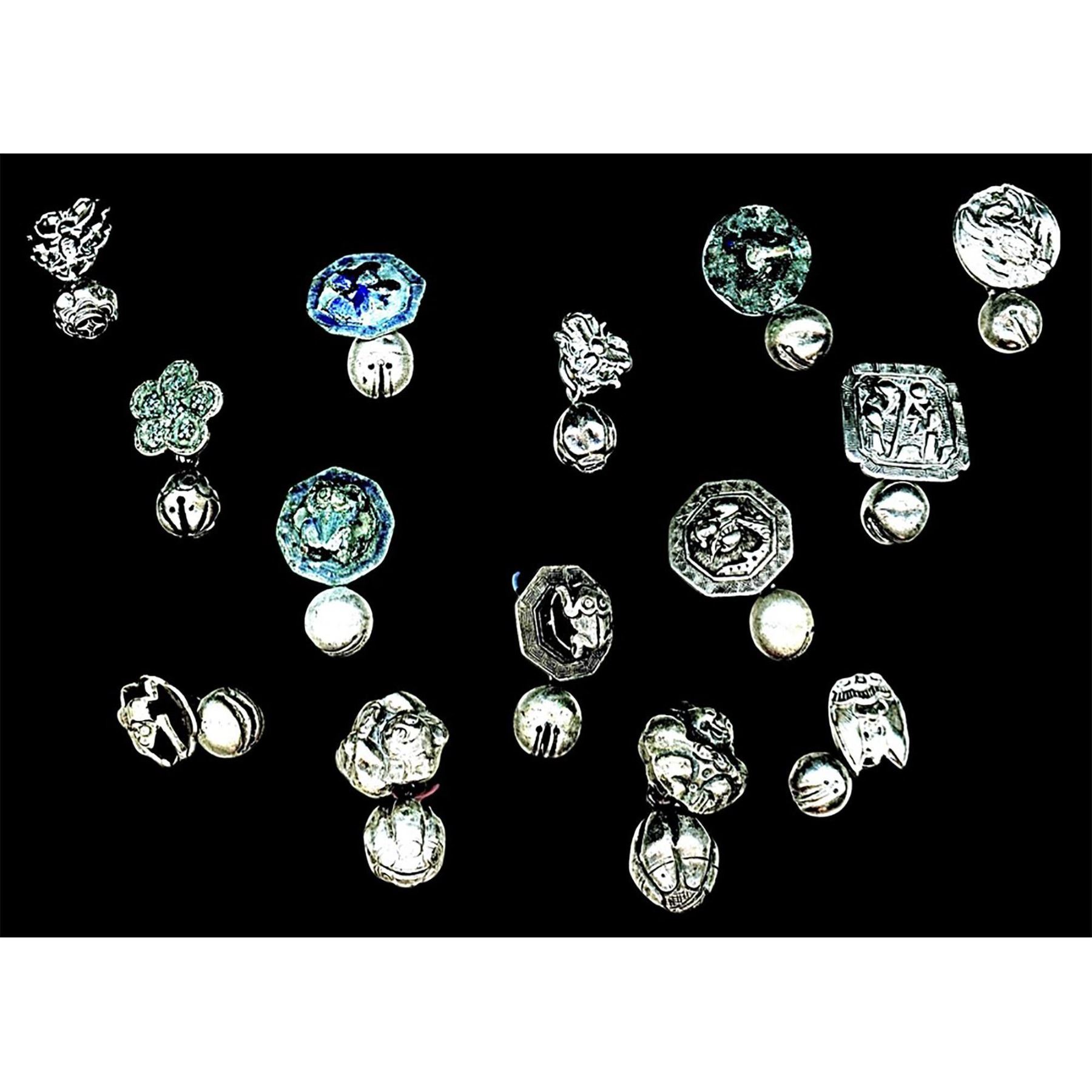 14 Medium late 19th early 20th C. toggles including enamel. The late Pauline Lum of California specialized in these and collected a large selection of them over the years. Here are some very nice examples of these very cool buttons. Notice the couple of enamel on silver examples.
