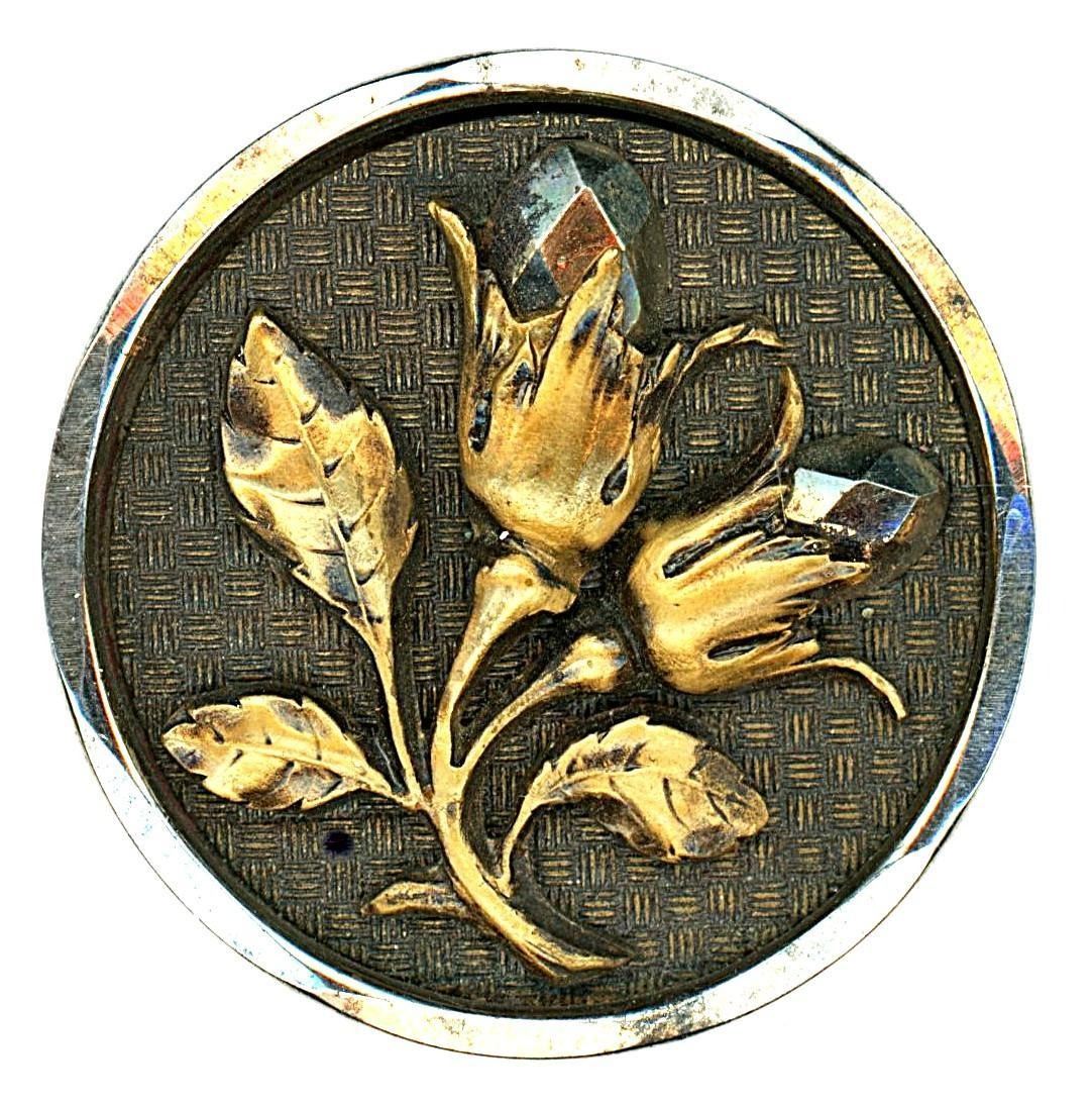 12 Medium/Large 19th century examples including pictorials. We recently received a small collection from a non mainstream button collector who apparently specialized in steel cups and large jewel buttons, and lots of them in fine condition. This selection includes a great brass and cut steel cluster of grapes, a horse and rider example and more.