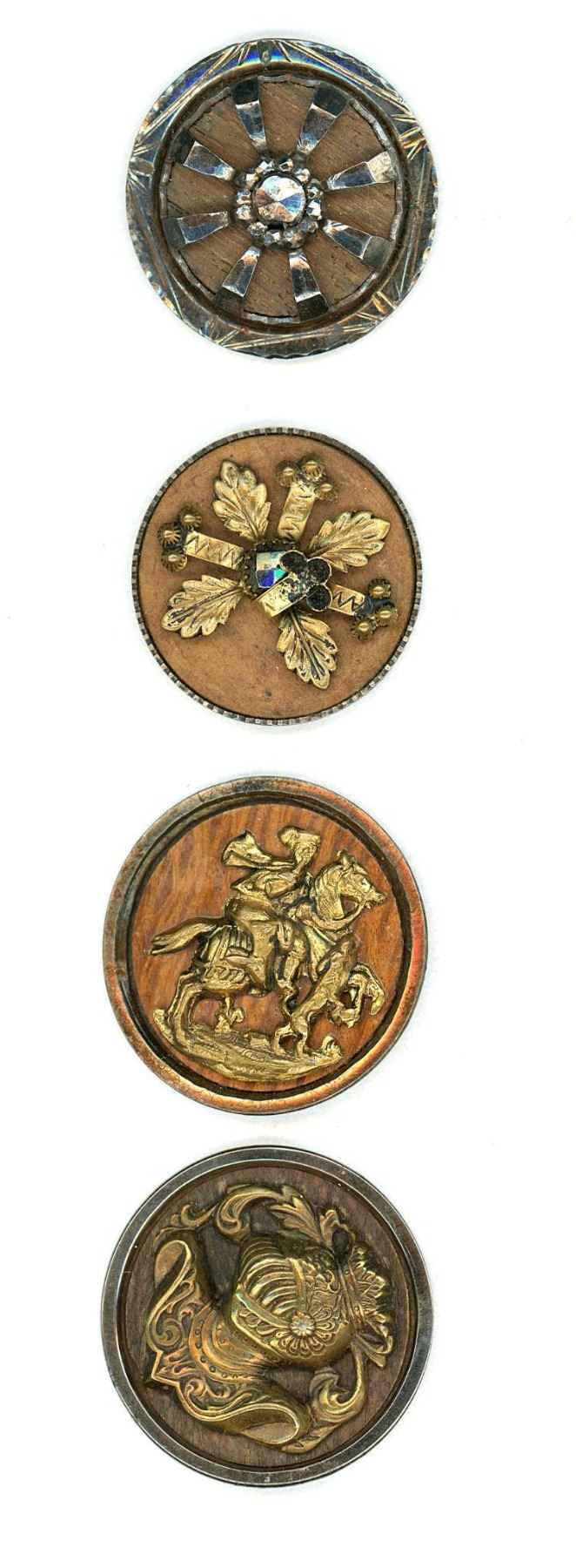 4 Large 19th century wood background examples. We recently received a small collection from a non mainstream button collector who apparently specialized in steel cups and large jewel buttons, and lots of them in fine condition. This card includes a great horse and rider and more.