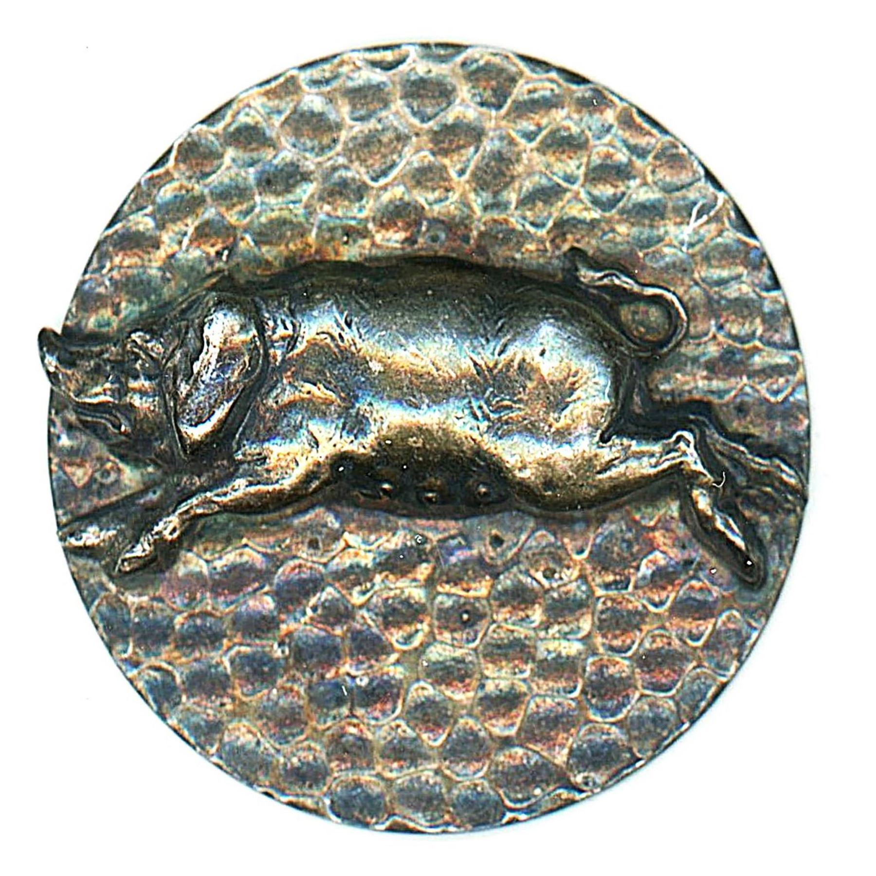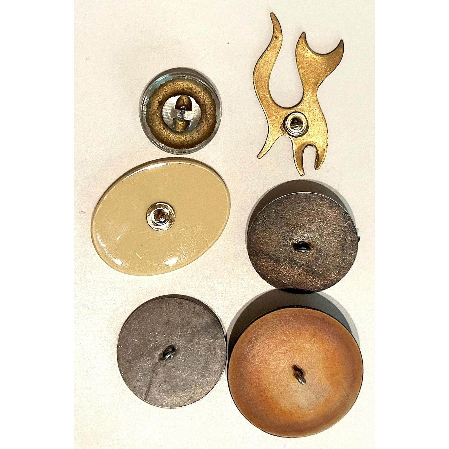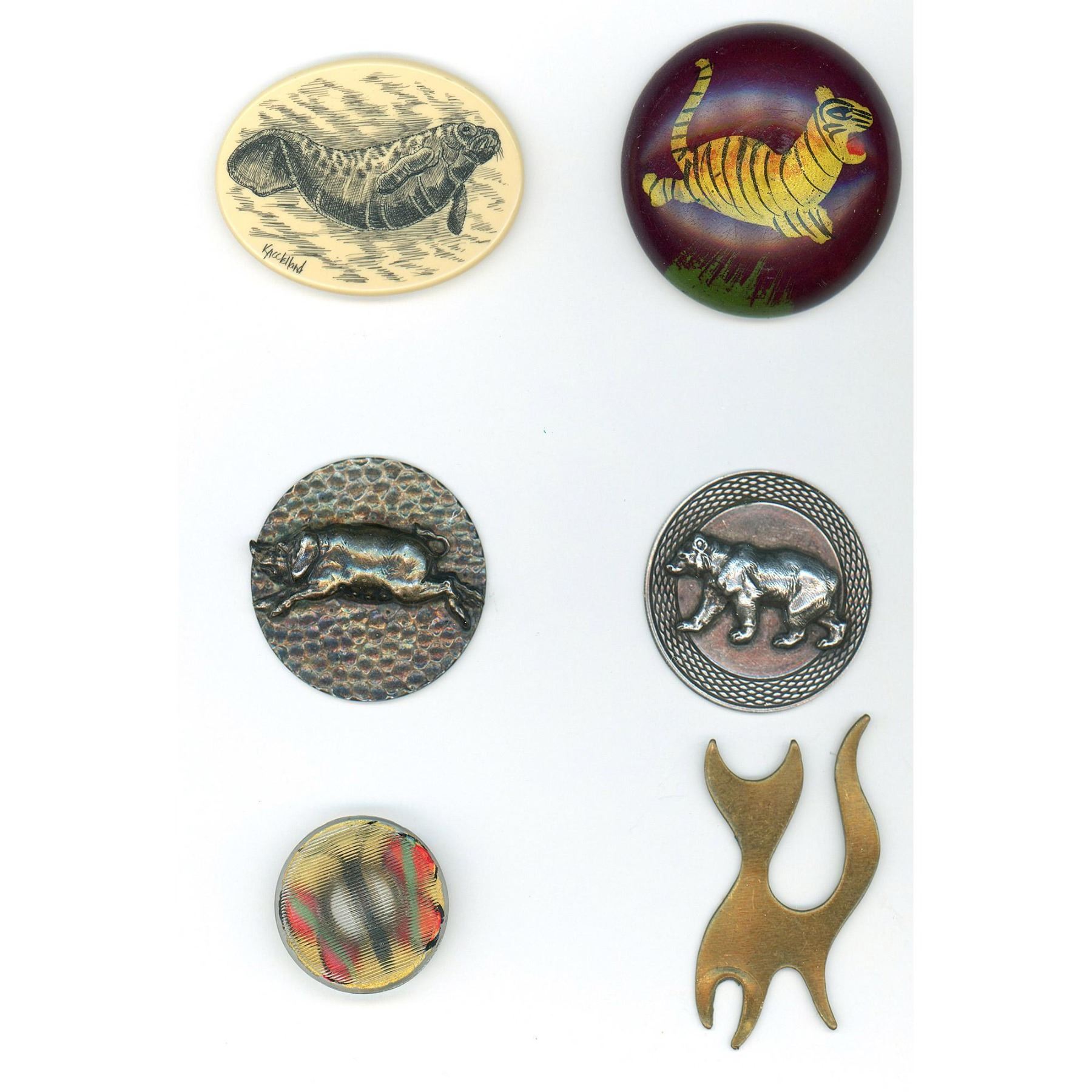 6 Medium/Large 20th C. asserted animal examples. This card includes a nice hammered silvered brass pig, a signed faux Scrimshaw artist made oval plastic Walrus, a colorful back painted frosted glass Butterfly, a cool realistic Deco style CAT and more.