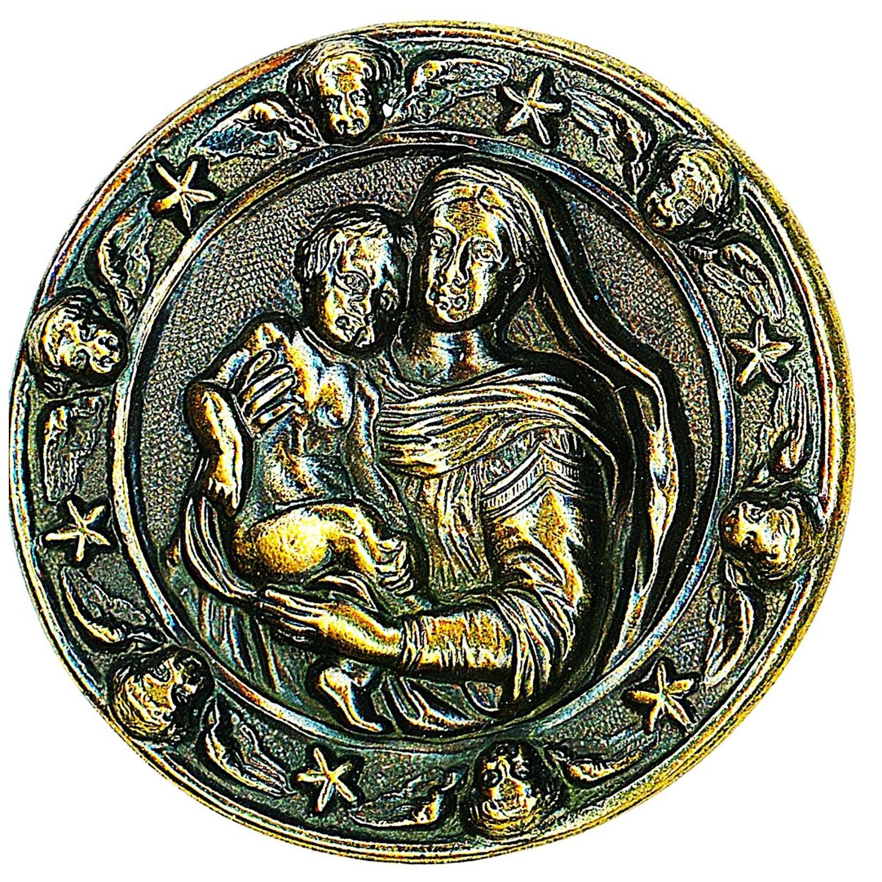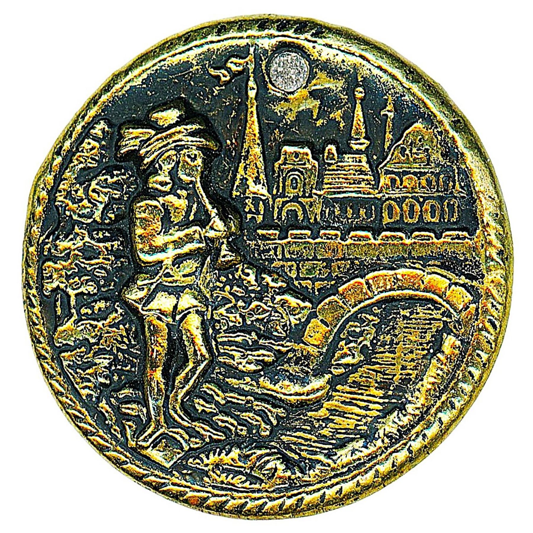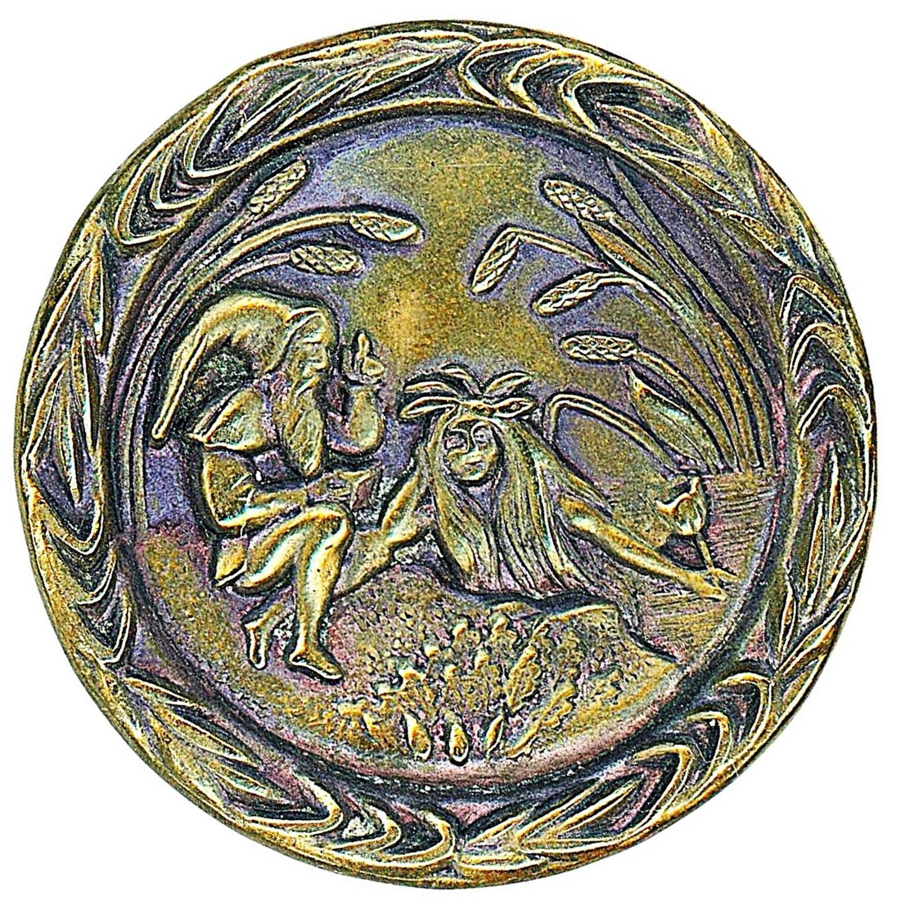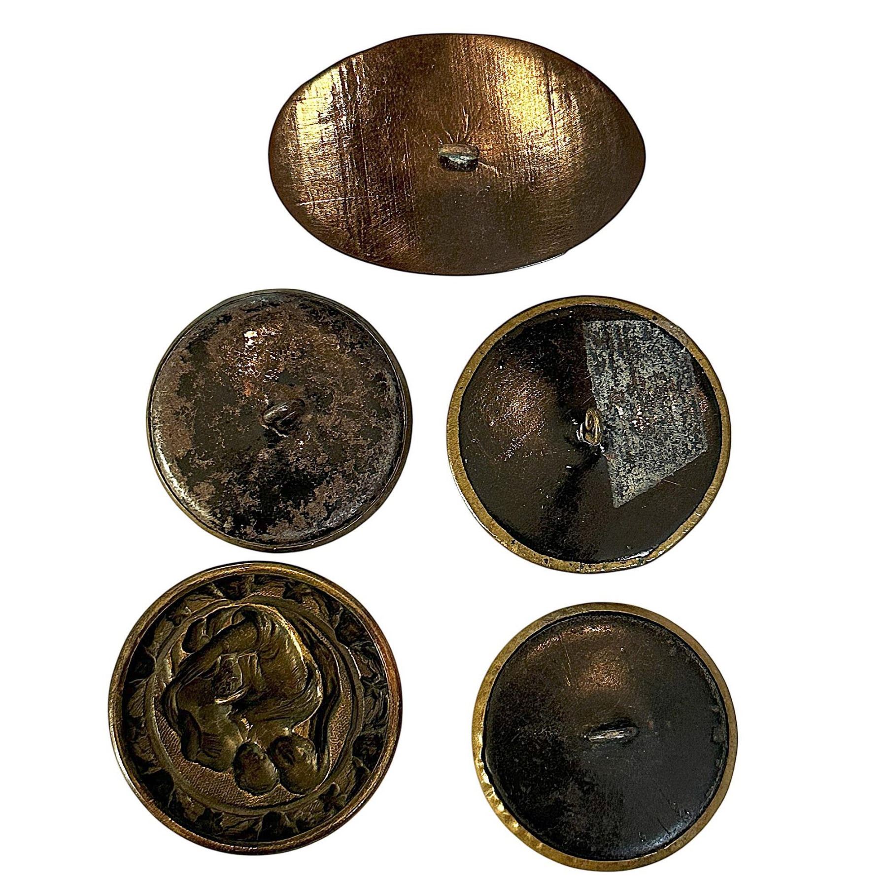 5 Large 19th-20th century examples including Bakelite. This lot consists of an oval Bakelite on Bakelite in two colors, several metal pictures including "The Madonna and Child" and "The Pied Piper of Hamlin", a Rare Gnome and Water Sprite and more. Nice small lot.