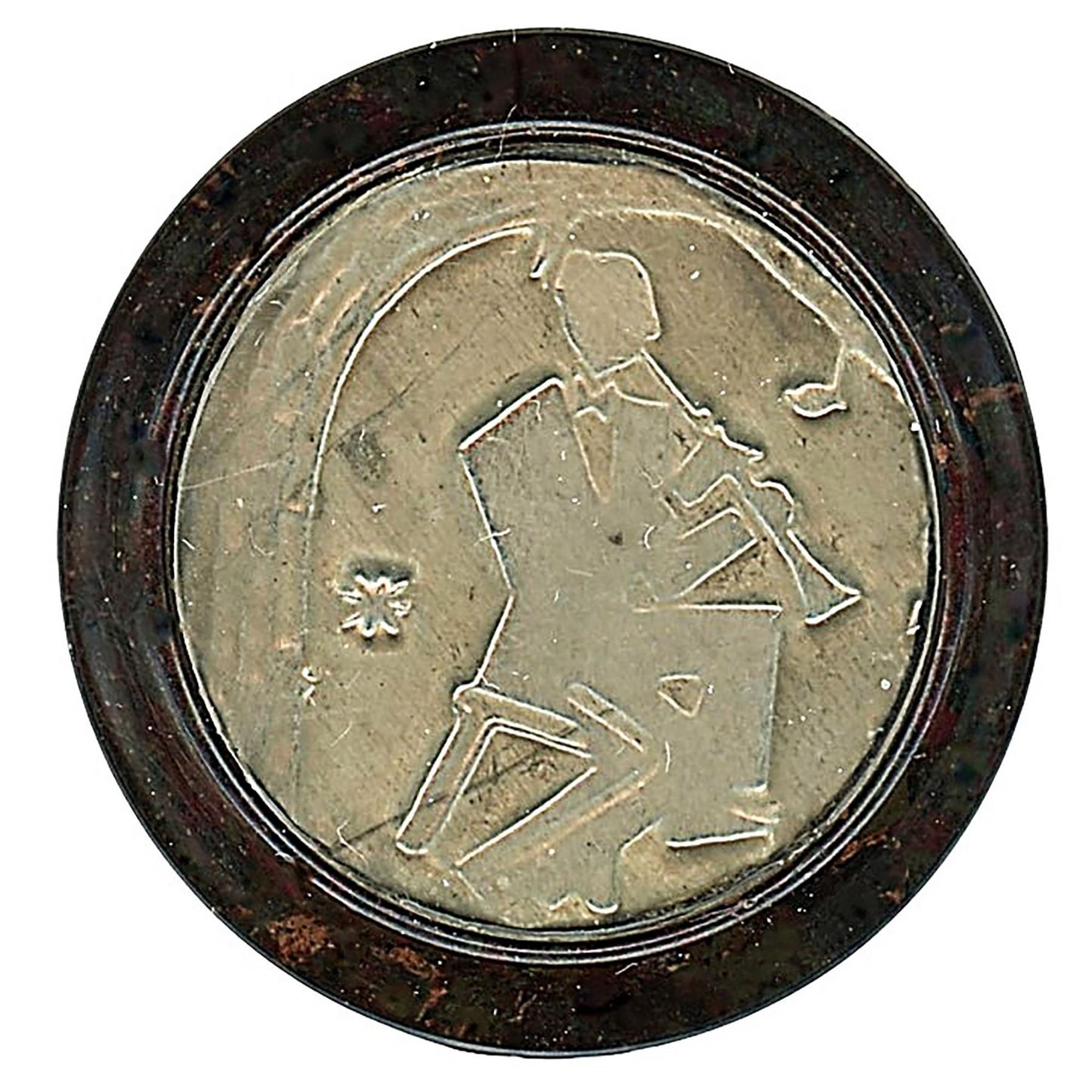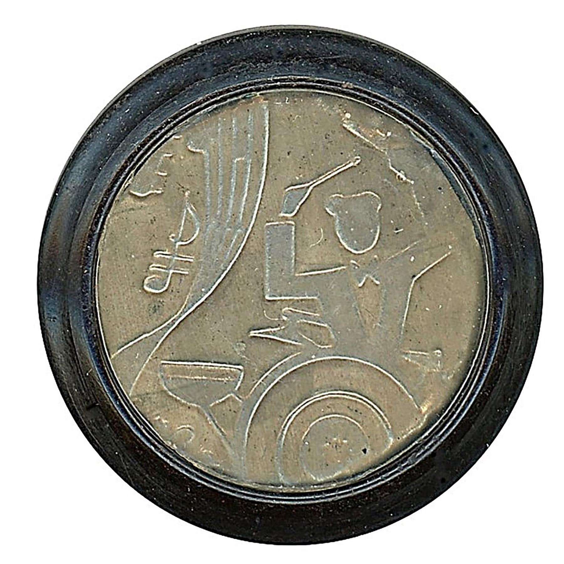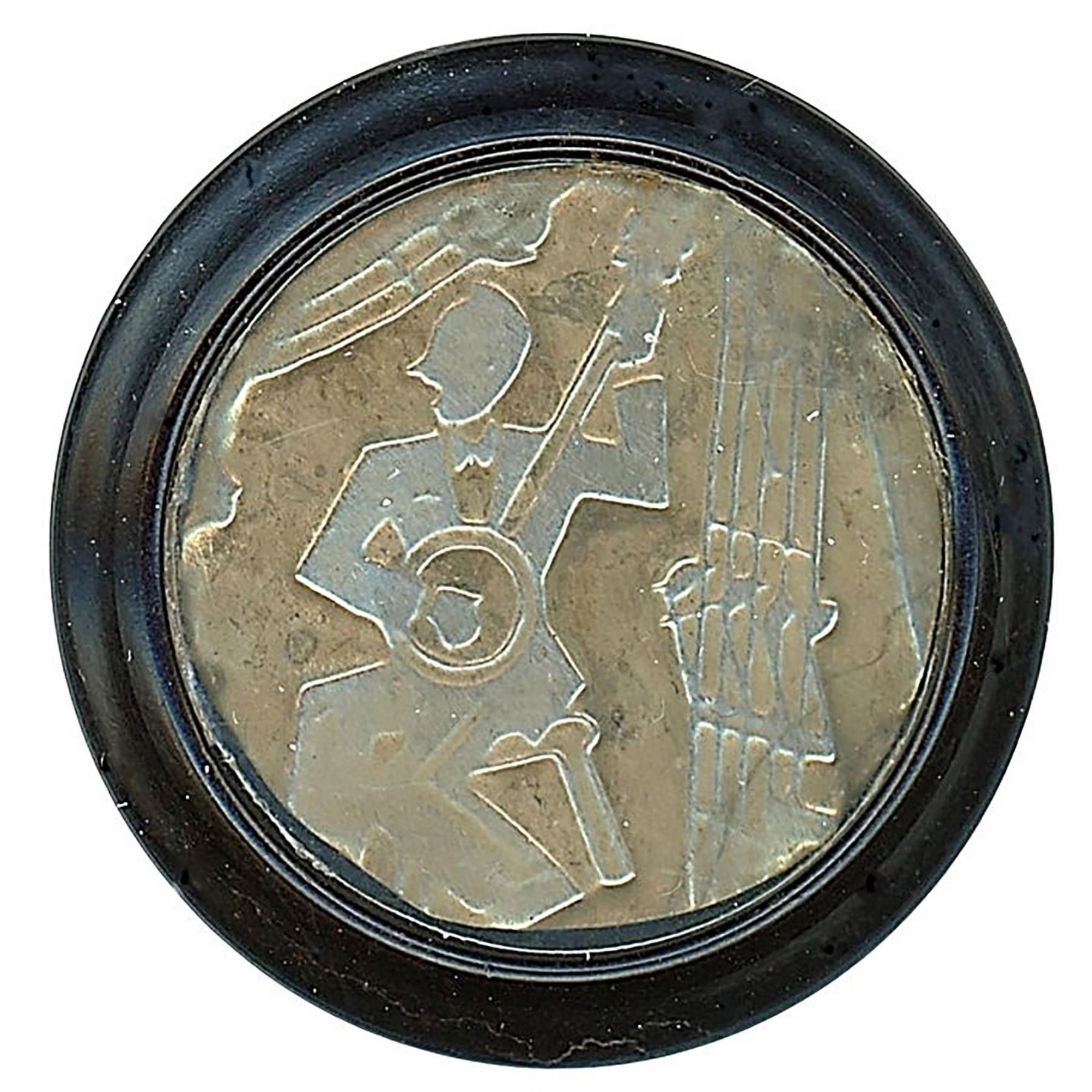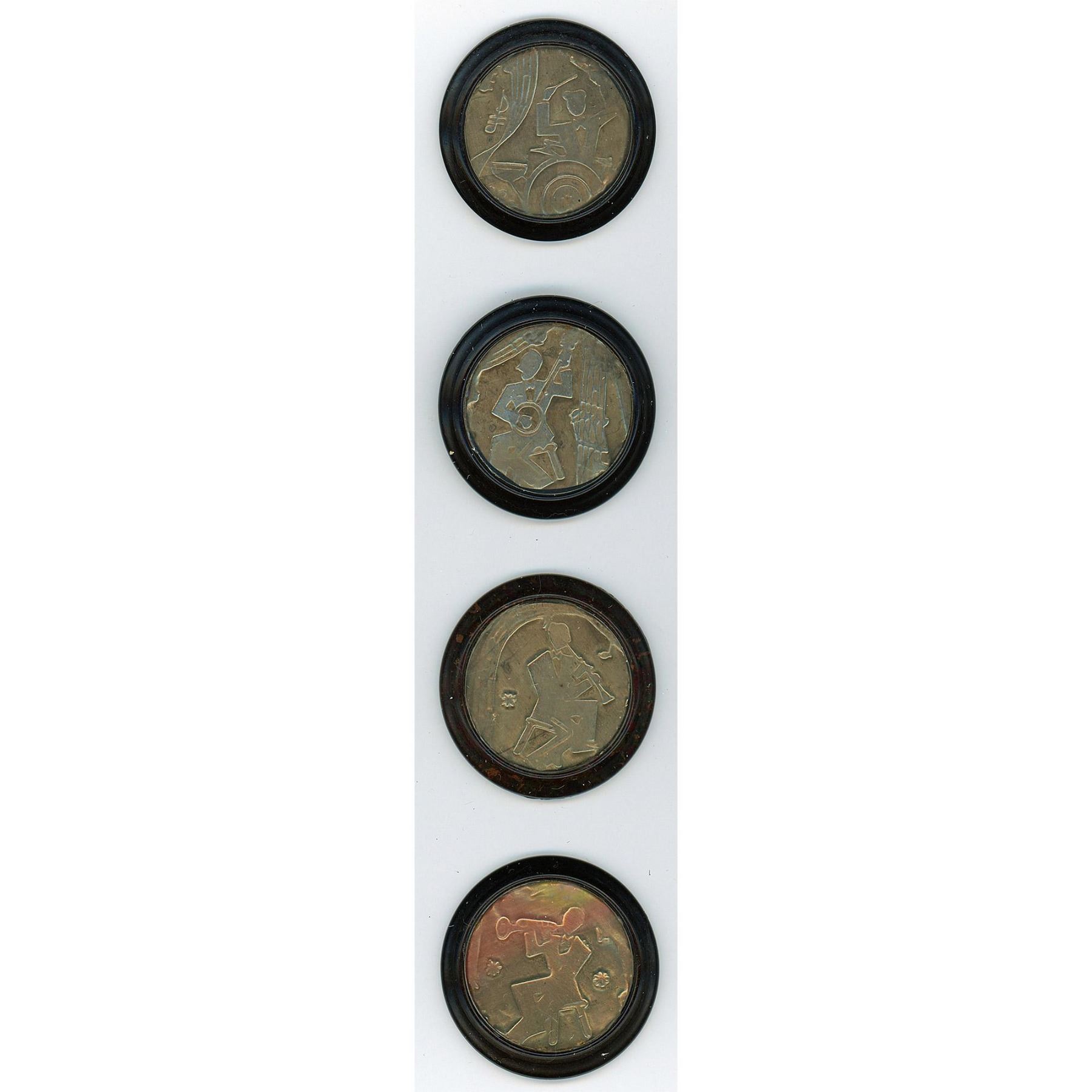 Here is a great set of Musicians and instruments, each one different. These are backmarked from England and are set with a clear shield over the central design. Great set and not always easy to find in the set! These are the large size examples.