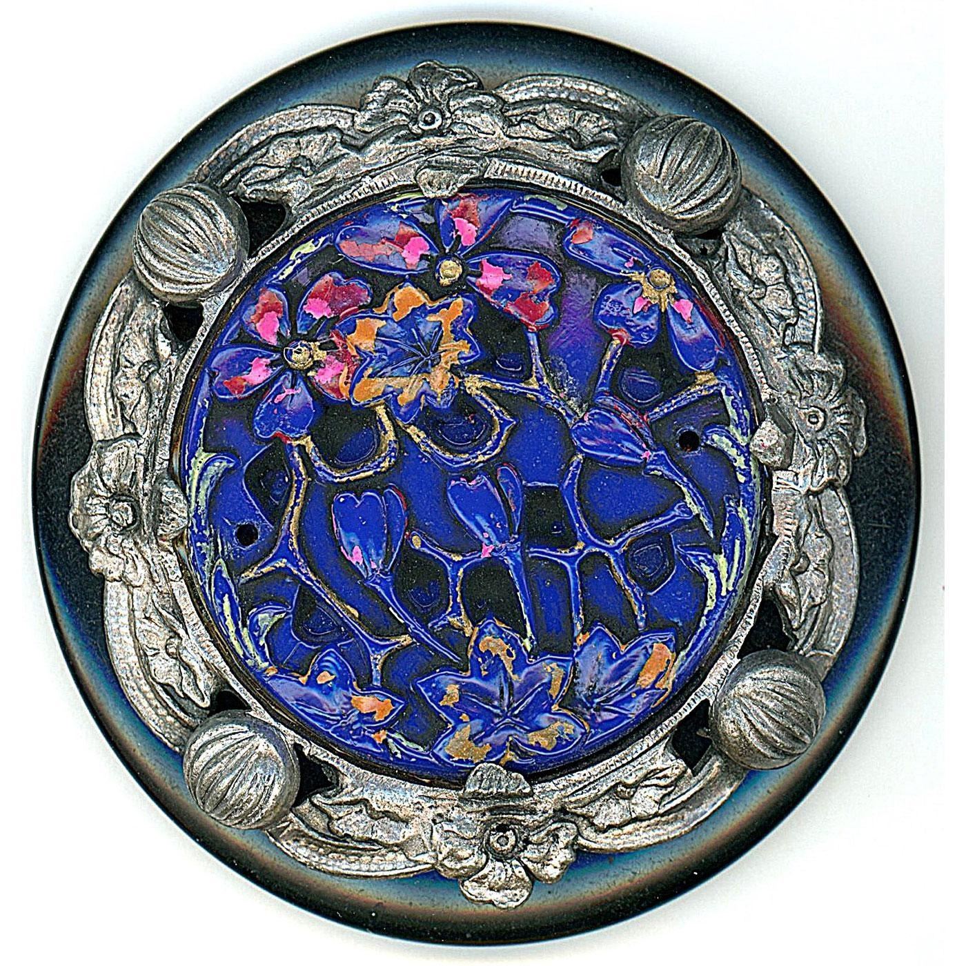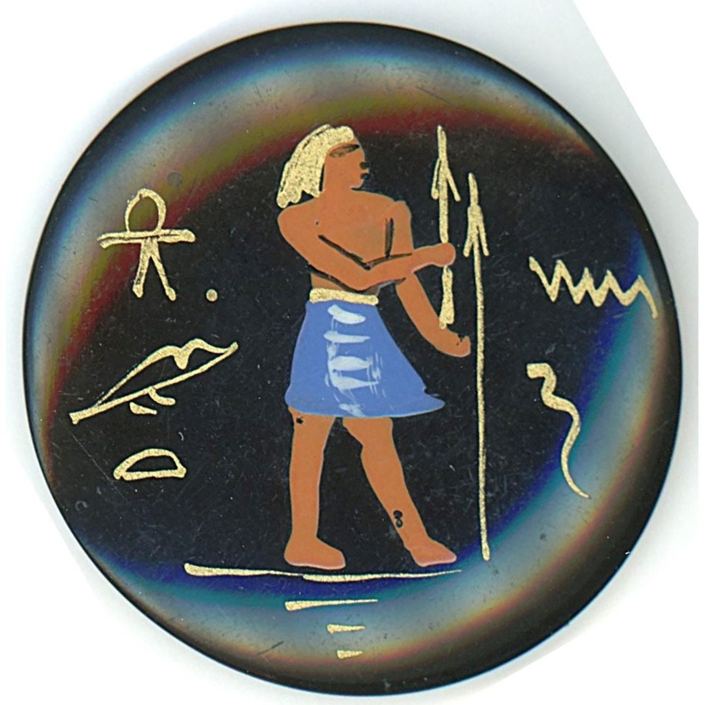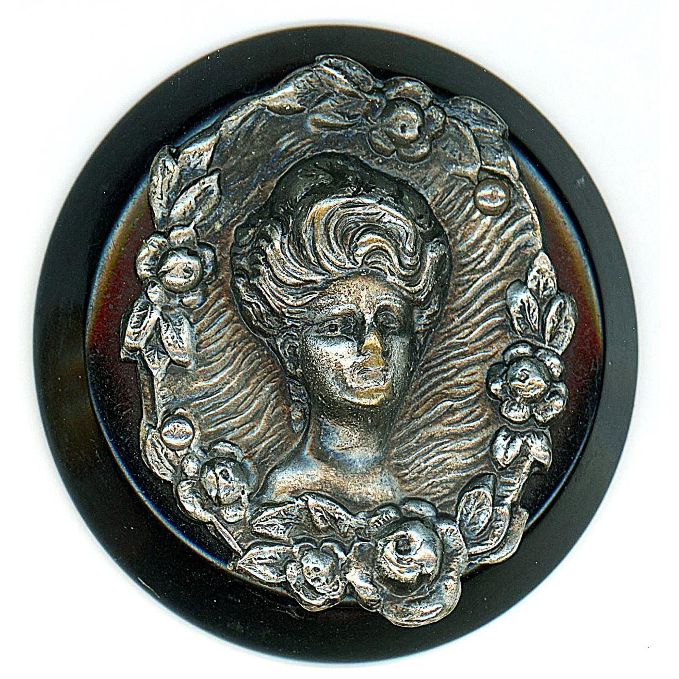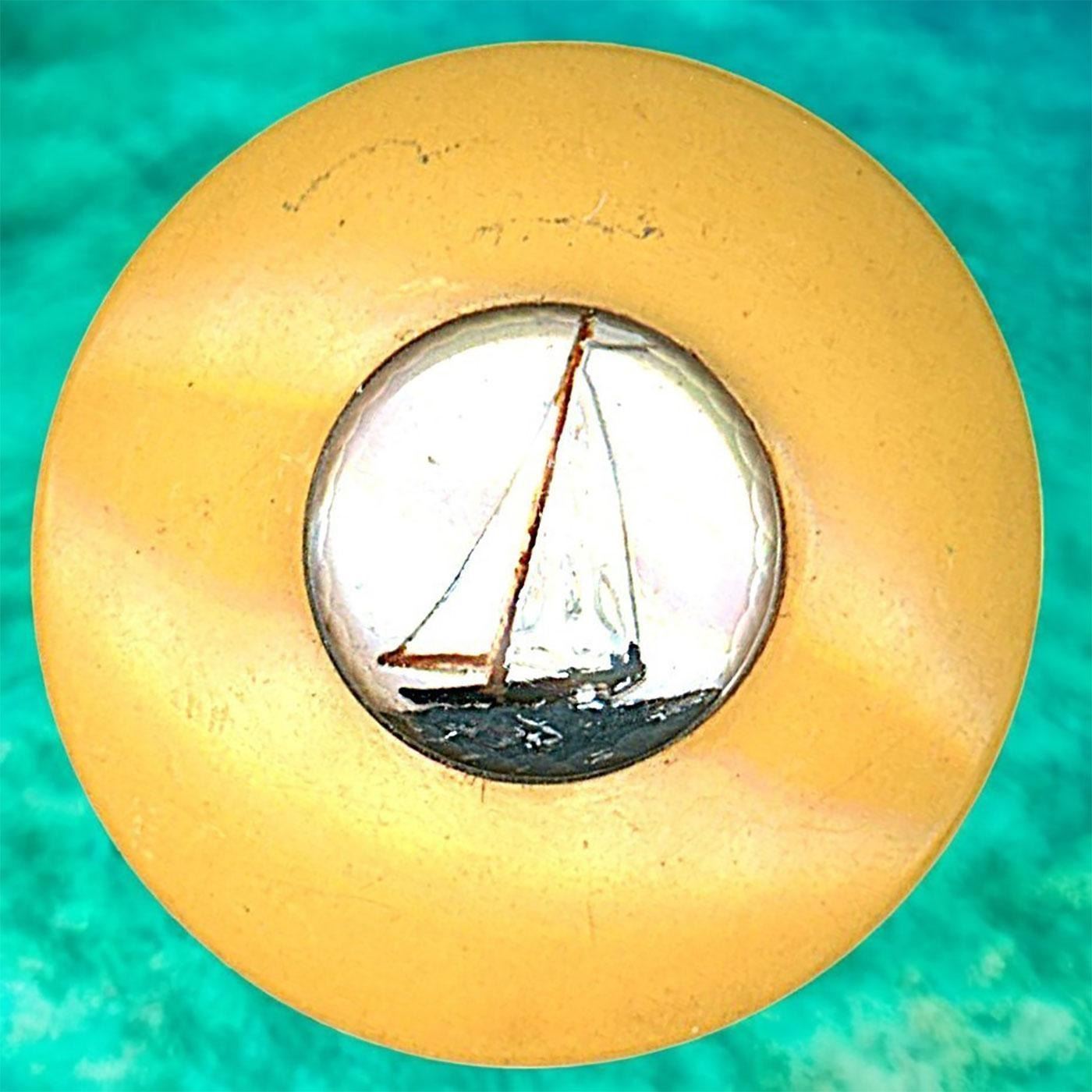 8 Medium/Large 20th century assorted examples. This lot is mostly Bakelite and Casein. The Egyptian figural is painted on a black Casein base and very cool, the sailing ship is reverse painted glass inset into a butterscotch Bakelite setting, the Gibson girl in silvered brass is an escutcheon on a Bakelite Chunky coat button, and the blue glass is paint DF with metal and set onto a Chunky Bakelite coast button, plus more.