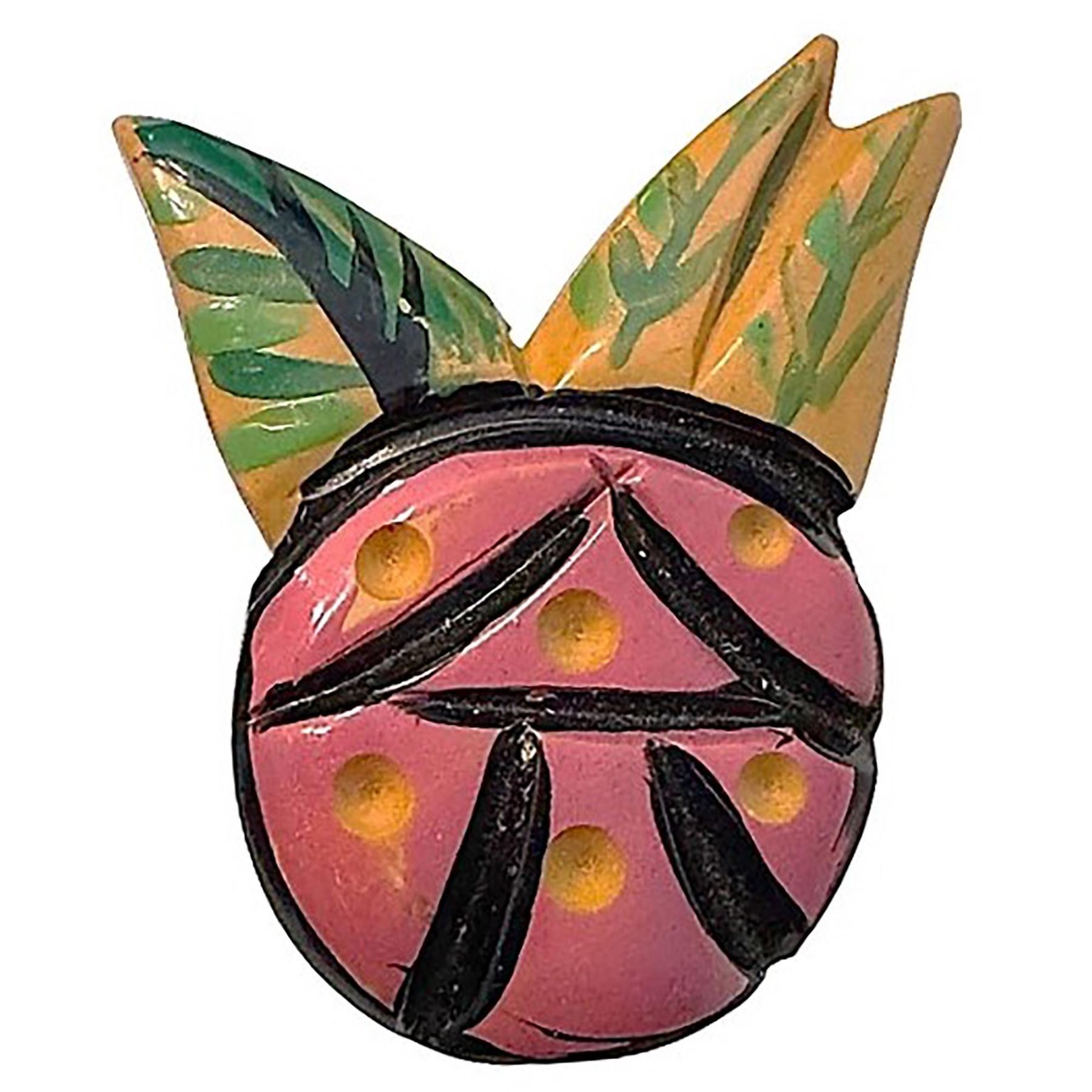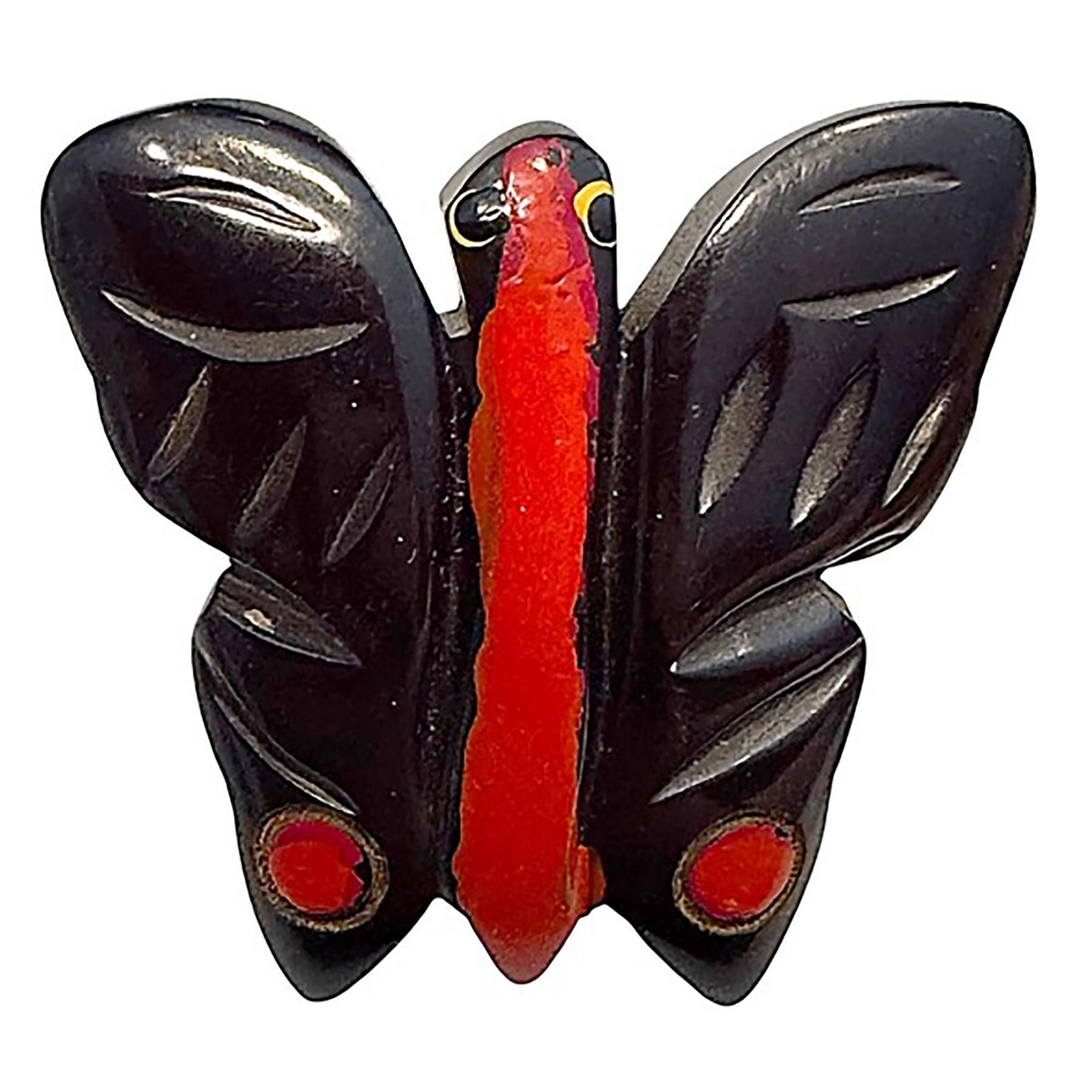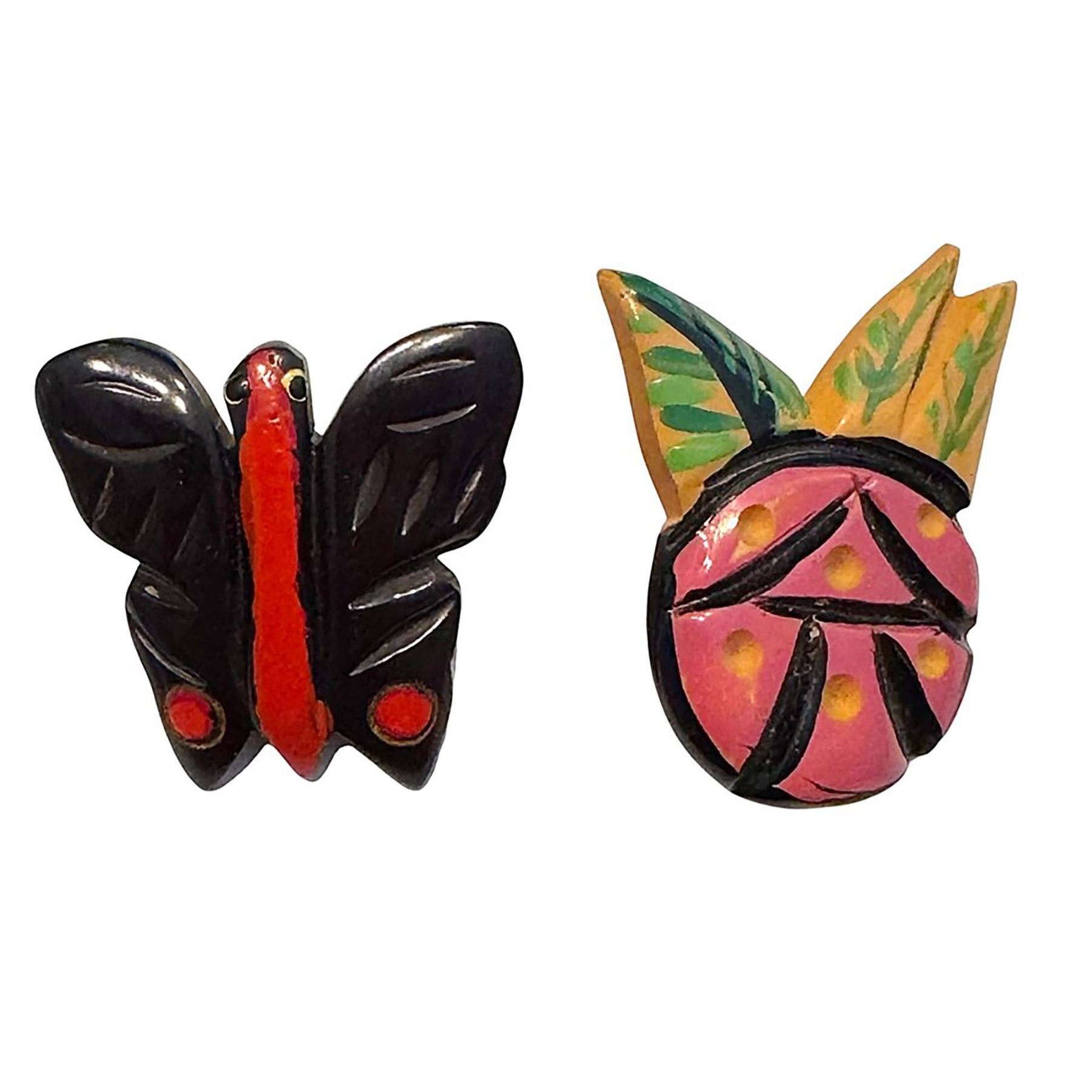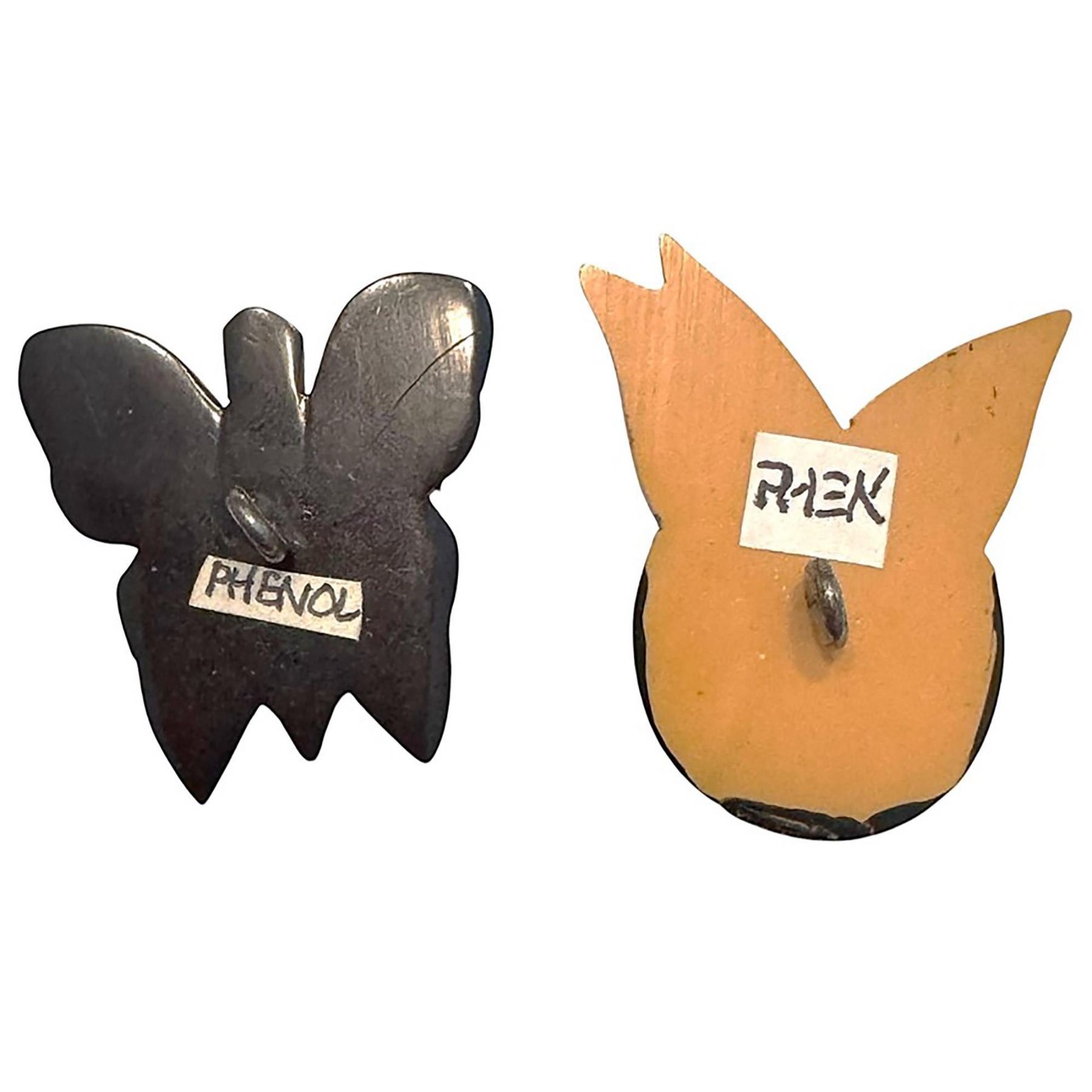 2 Large 20th century realistic shape examples. Here are two fun realistic buttons from the collection of Nikki Deal. These chunky Bakelite buttons include a Butterfly and a plant. Both have colored paint DF (decorative finish).