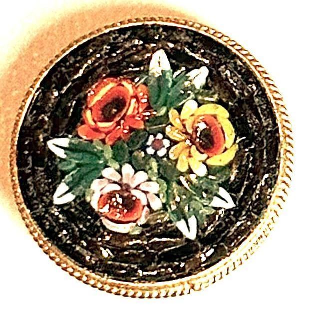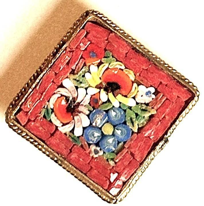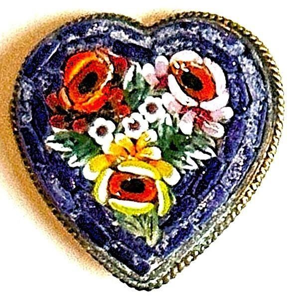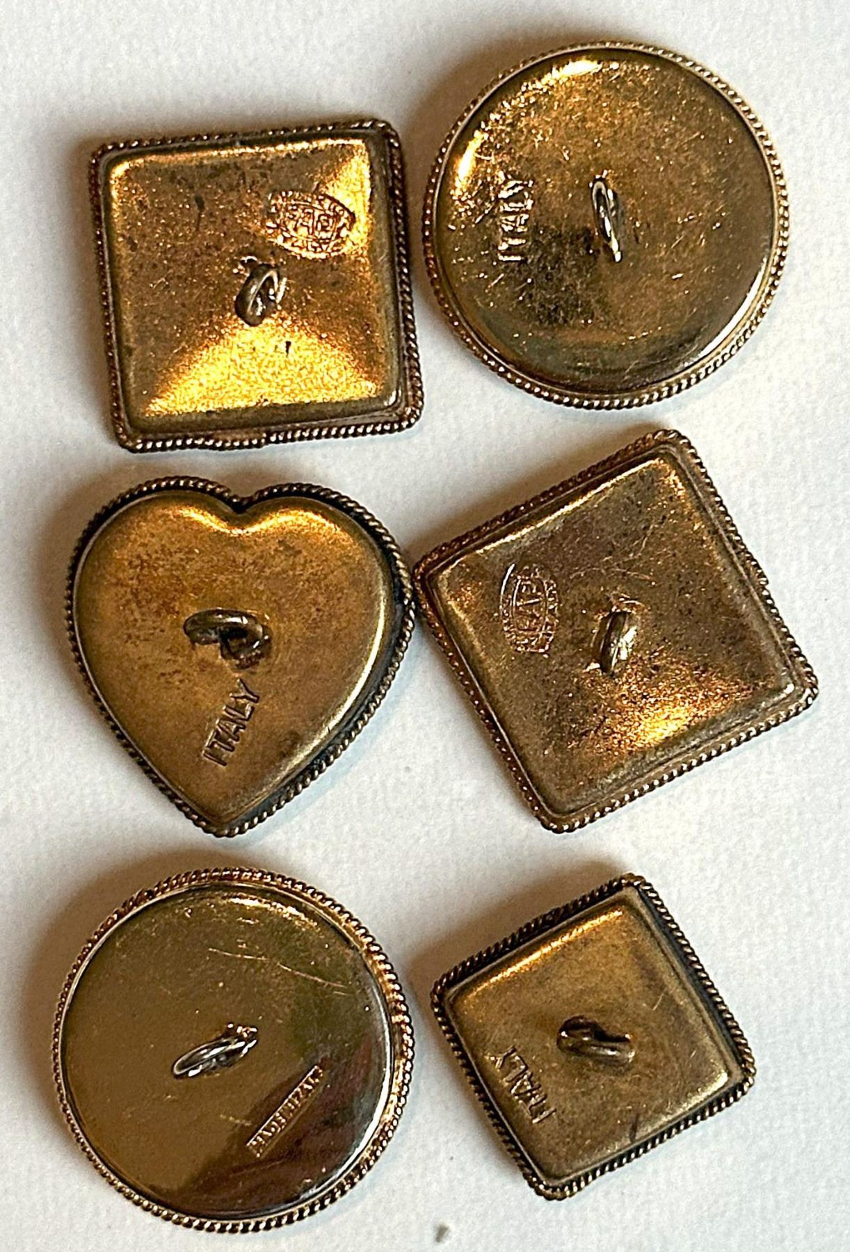 6 Medium 20th century Italian mosaic examples. Here we offer you these tesserae glass in metal buttons in a variety of colors and shapes. Nice heart example too.