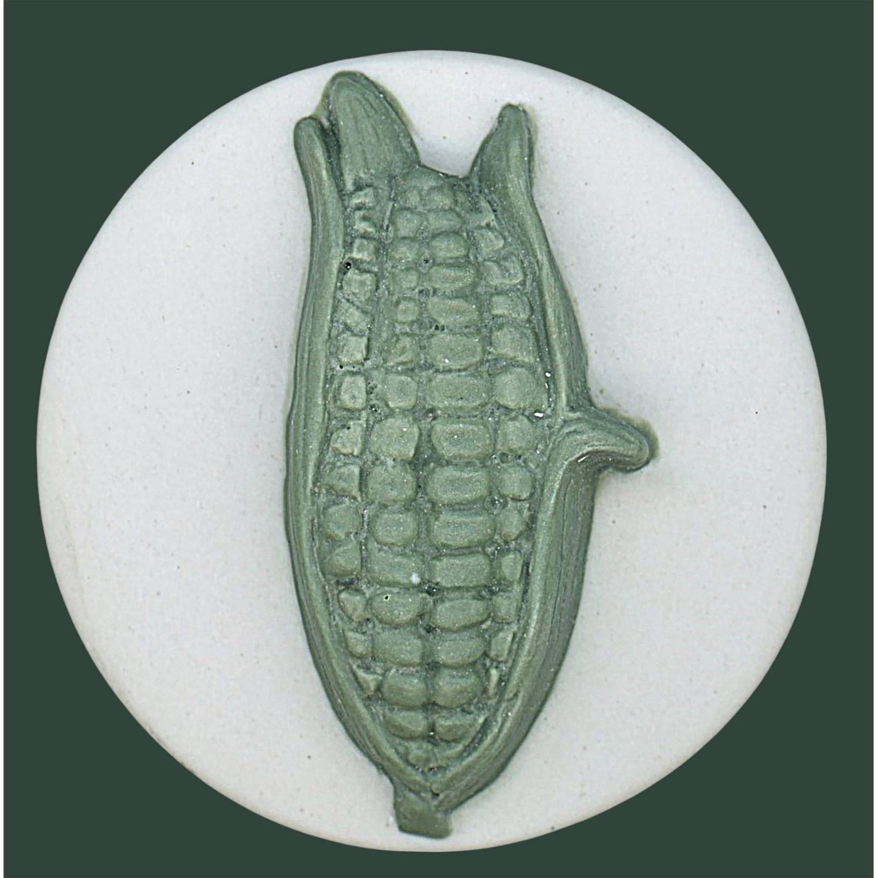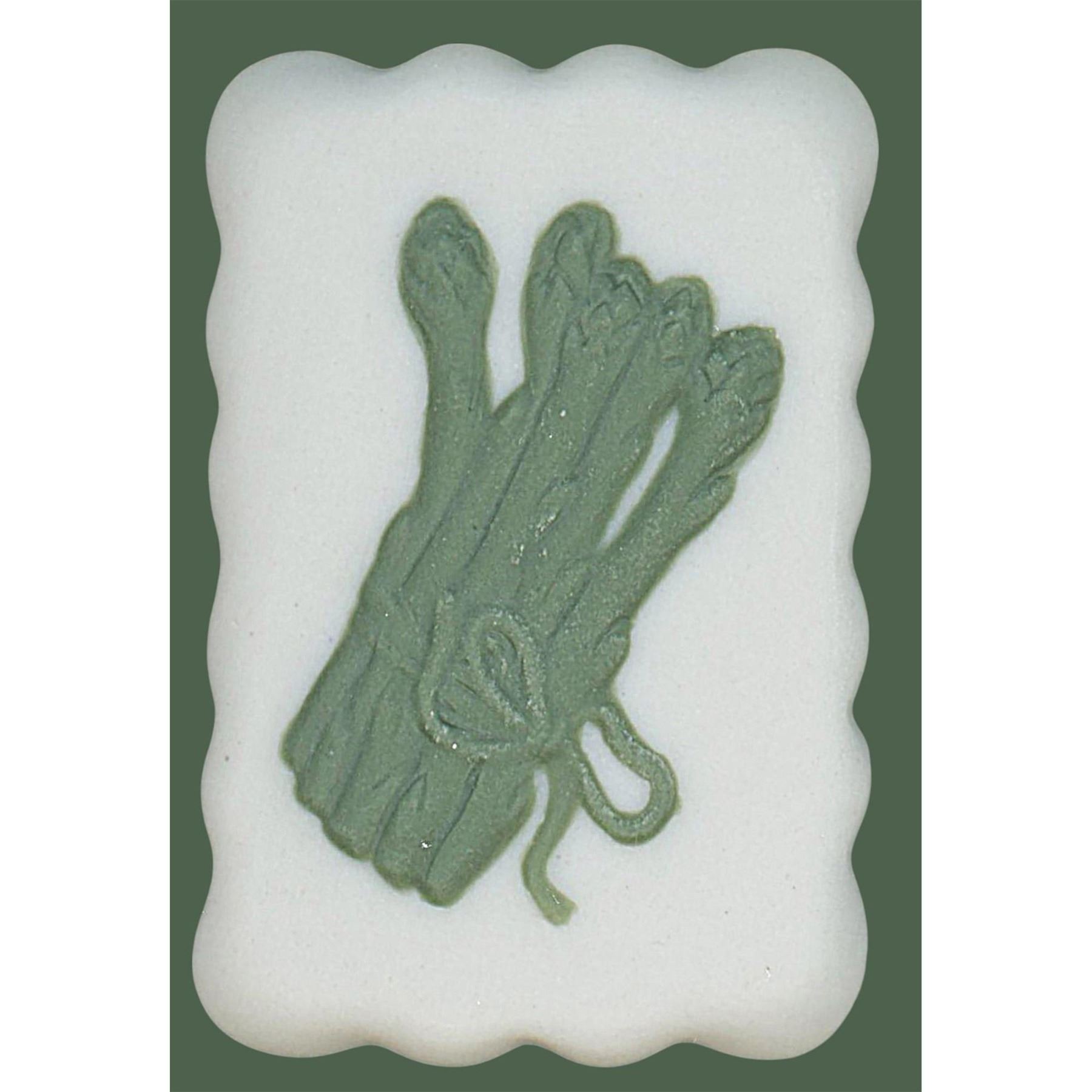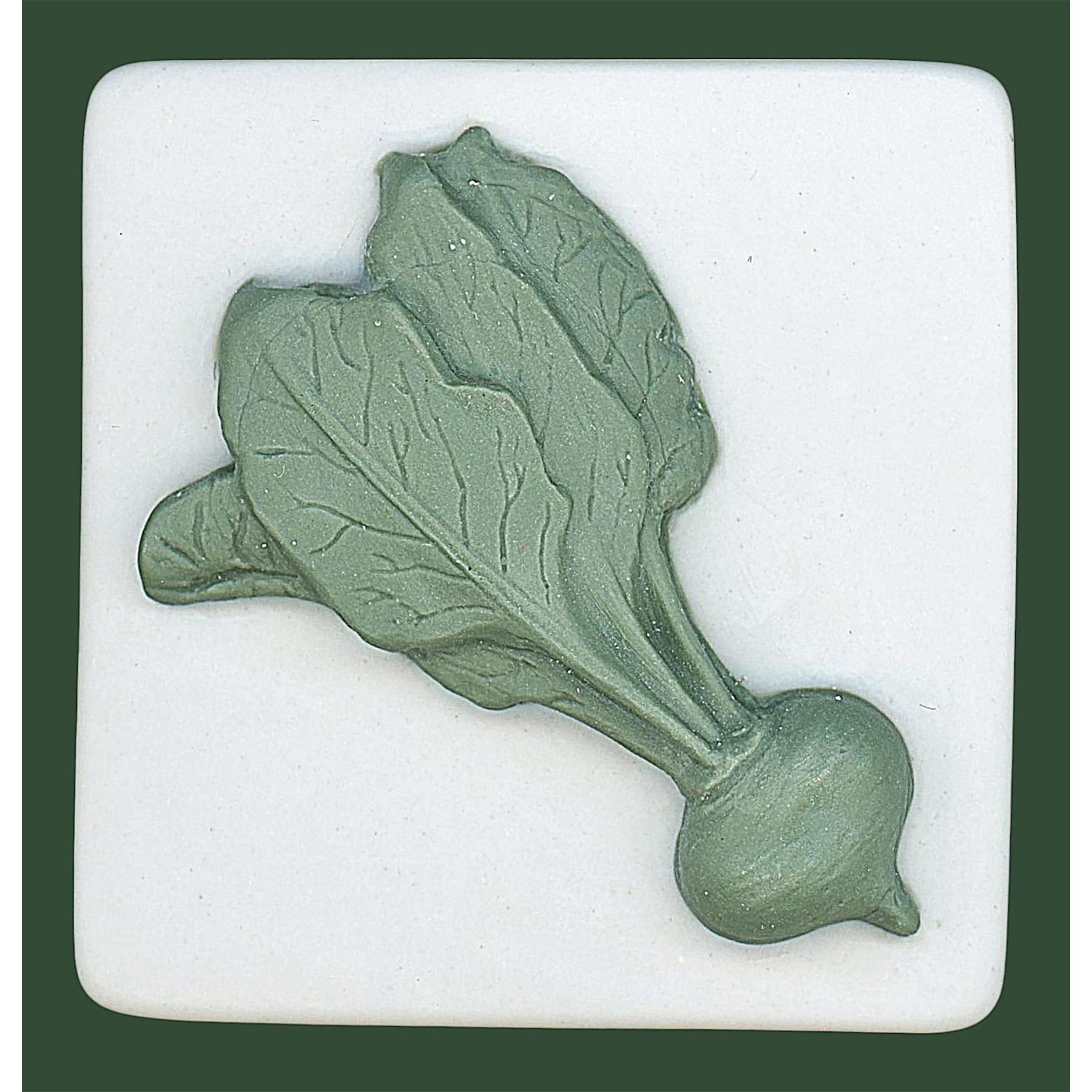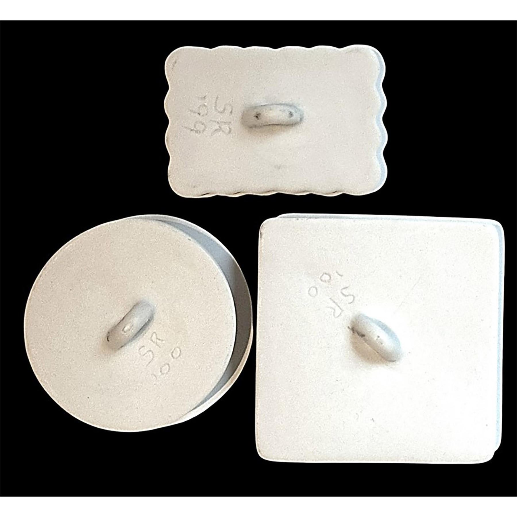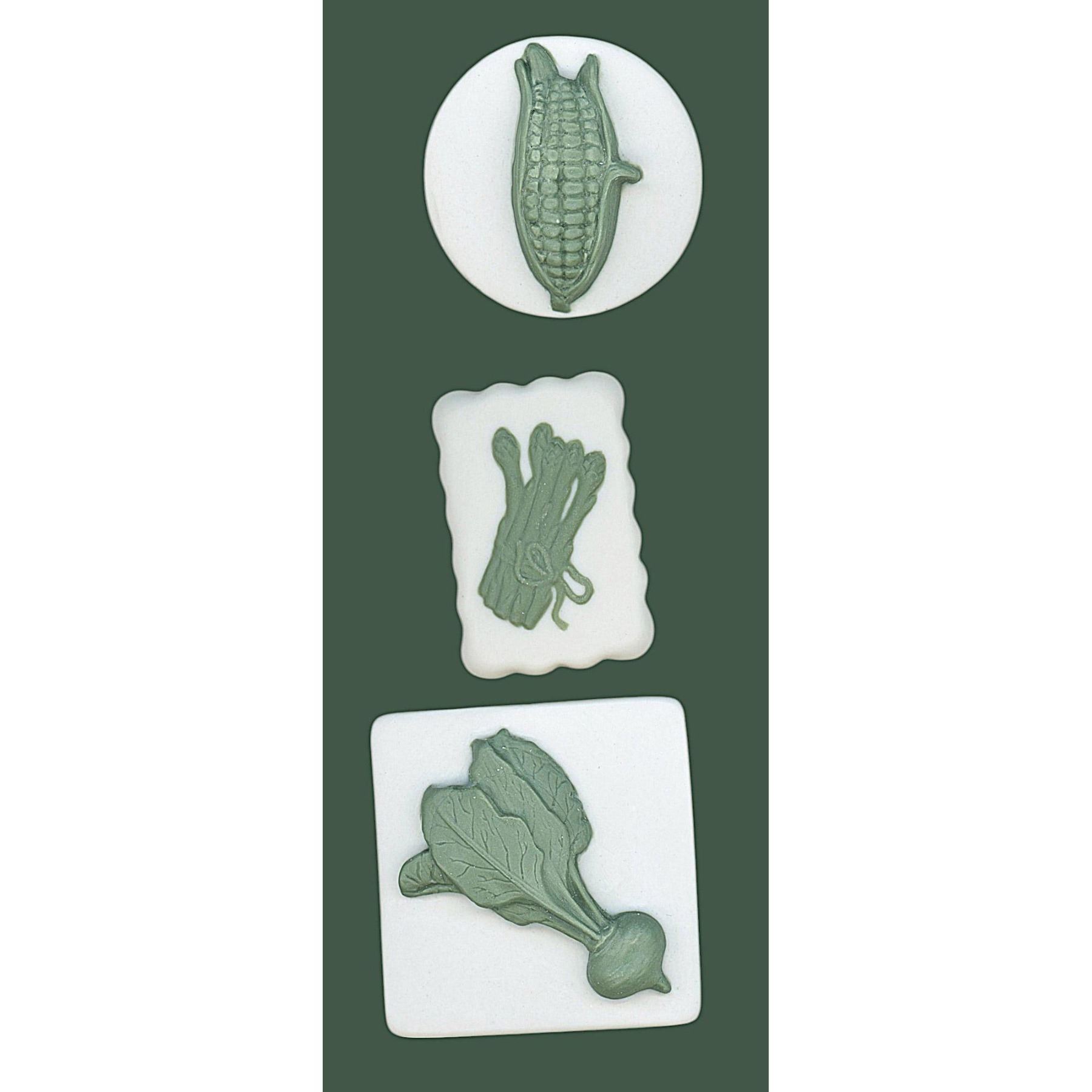 3 Large 20th C. unusual color combination Jasperware buttons. This group includes three square and modified ones with white bases and green pictorial vegetables. All from the studios of the late Stella Rzanski.
