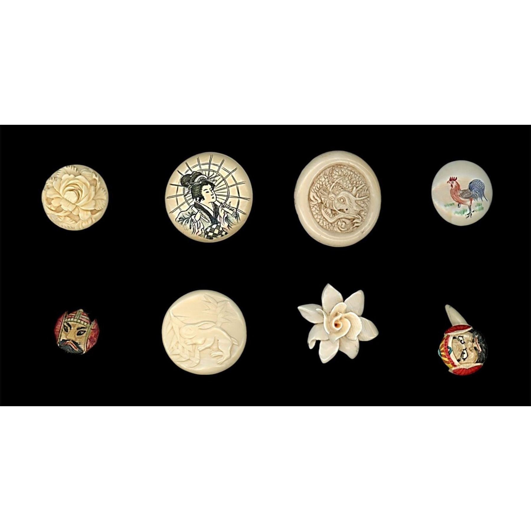8 S/M/L 20th/21st C. carved Asian themed buttons from China. Here is a nice small assortment of finely detailed pictorial buttons from China in the mid 20th century and the early 2000's.