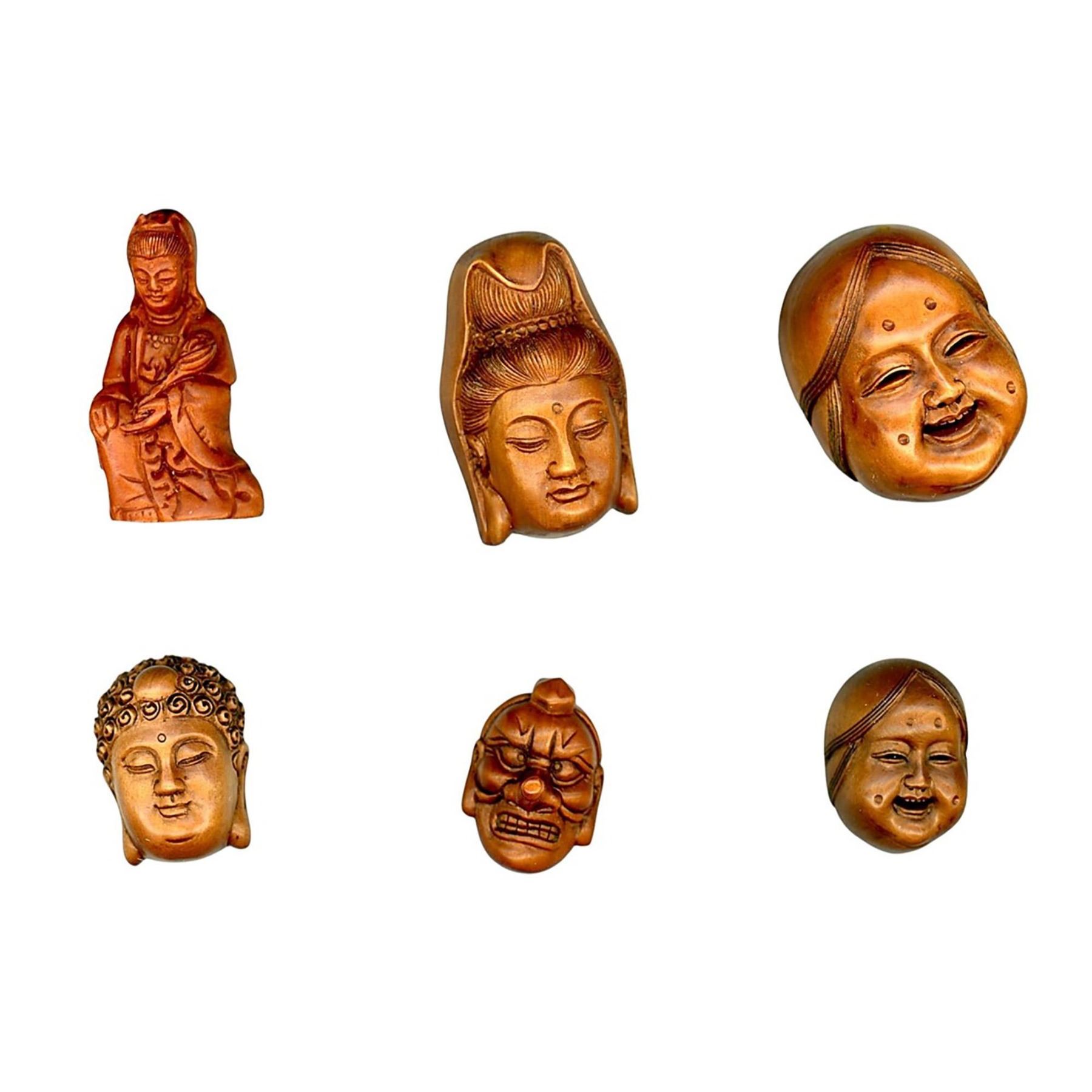 6 Medium/Large 21st century carved figural buttons. These examples from the collection of the late Pauline Lum of California are from China in the early 21st century. The detail of impeccable and the quality of the wood is very nice.