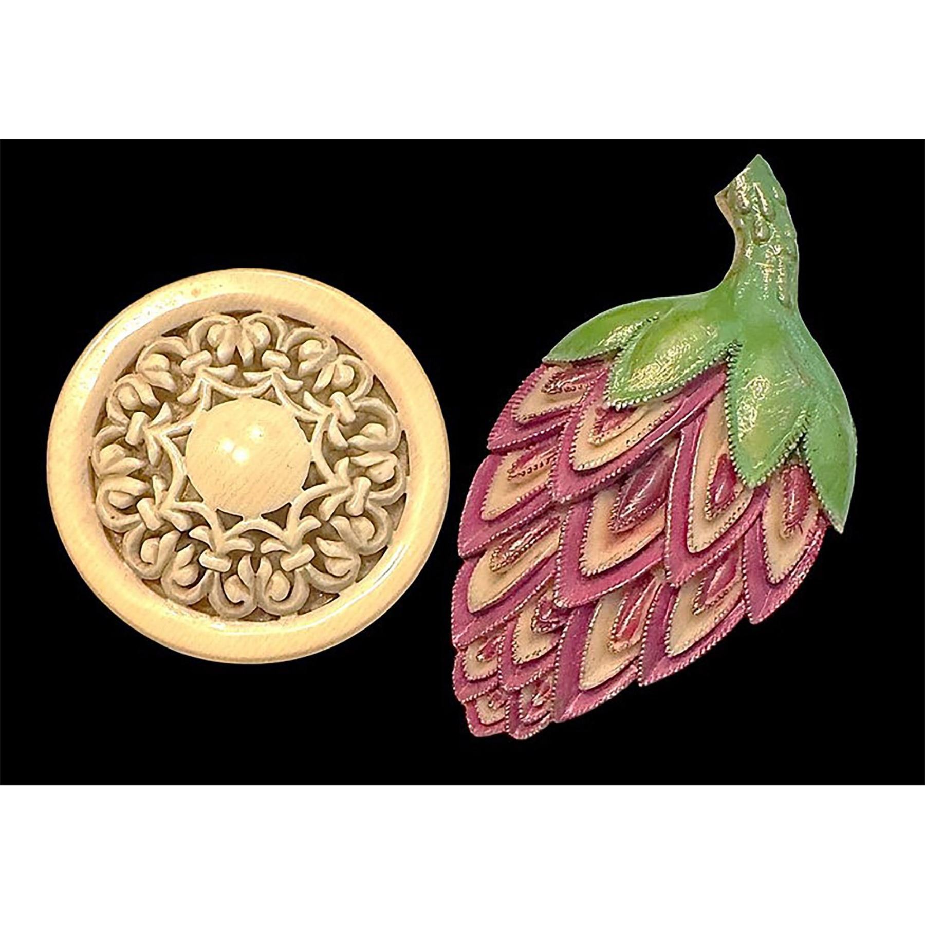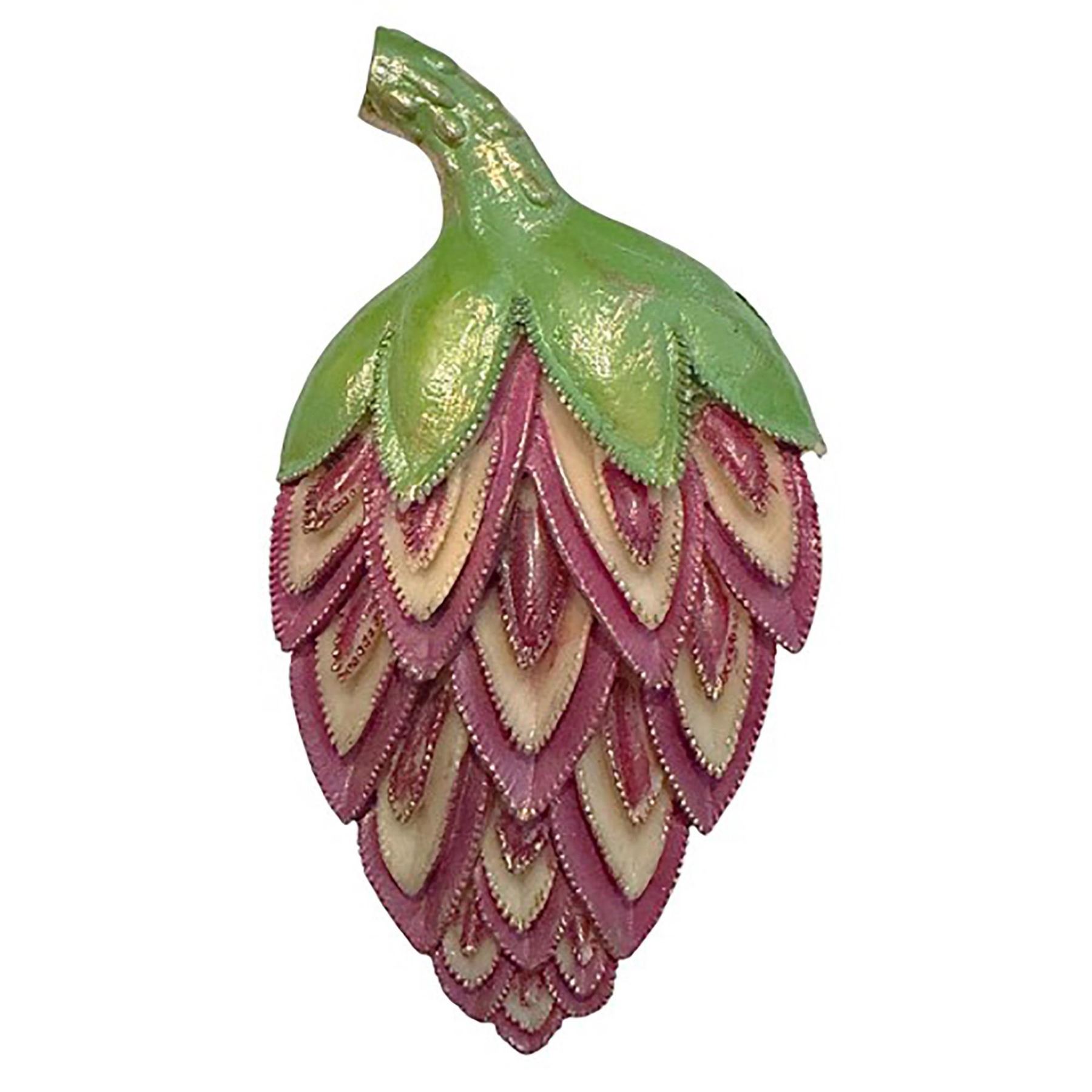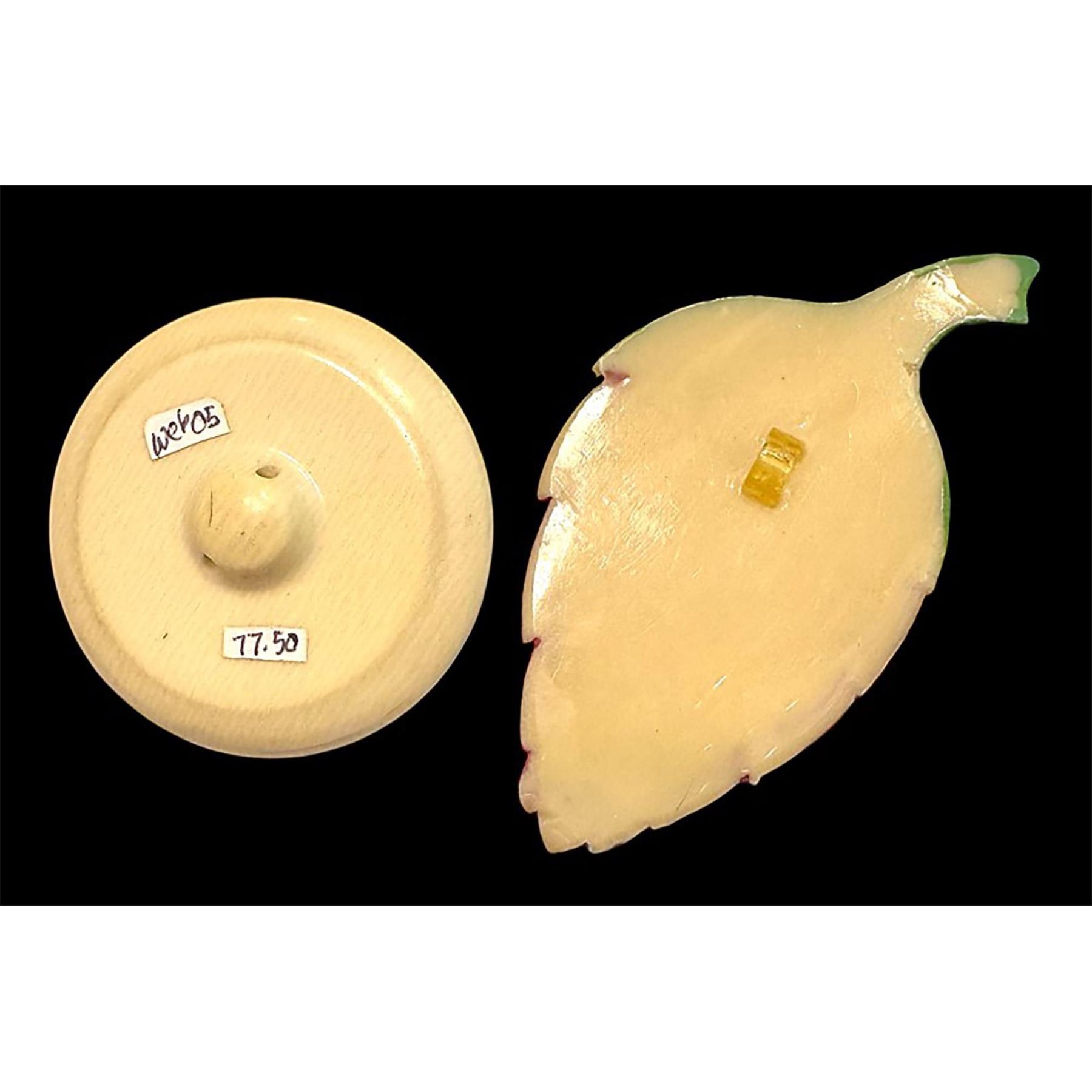 2 Large/Ex Large 20th century examples including lacy like. Here we have two different technique celluloid examples from the earlier part of the 20th century. One is a pierced openwork lacy style faux natural material example and the other is an extra large realistic cut pinecone? With colored tinting. Very nice. From the collection of Nikki Deal.