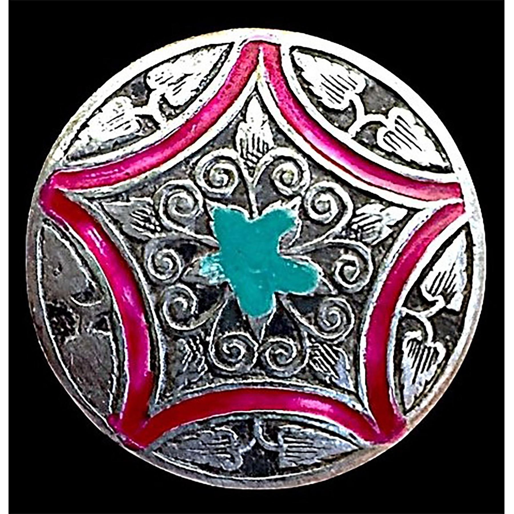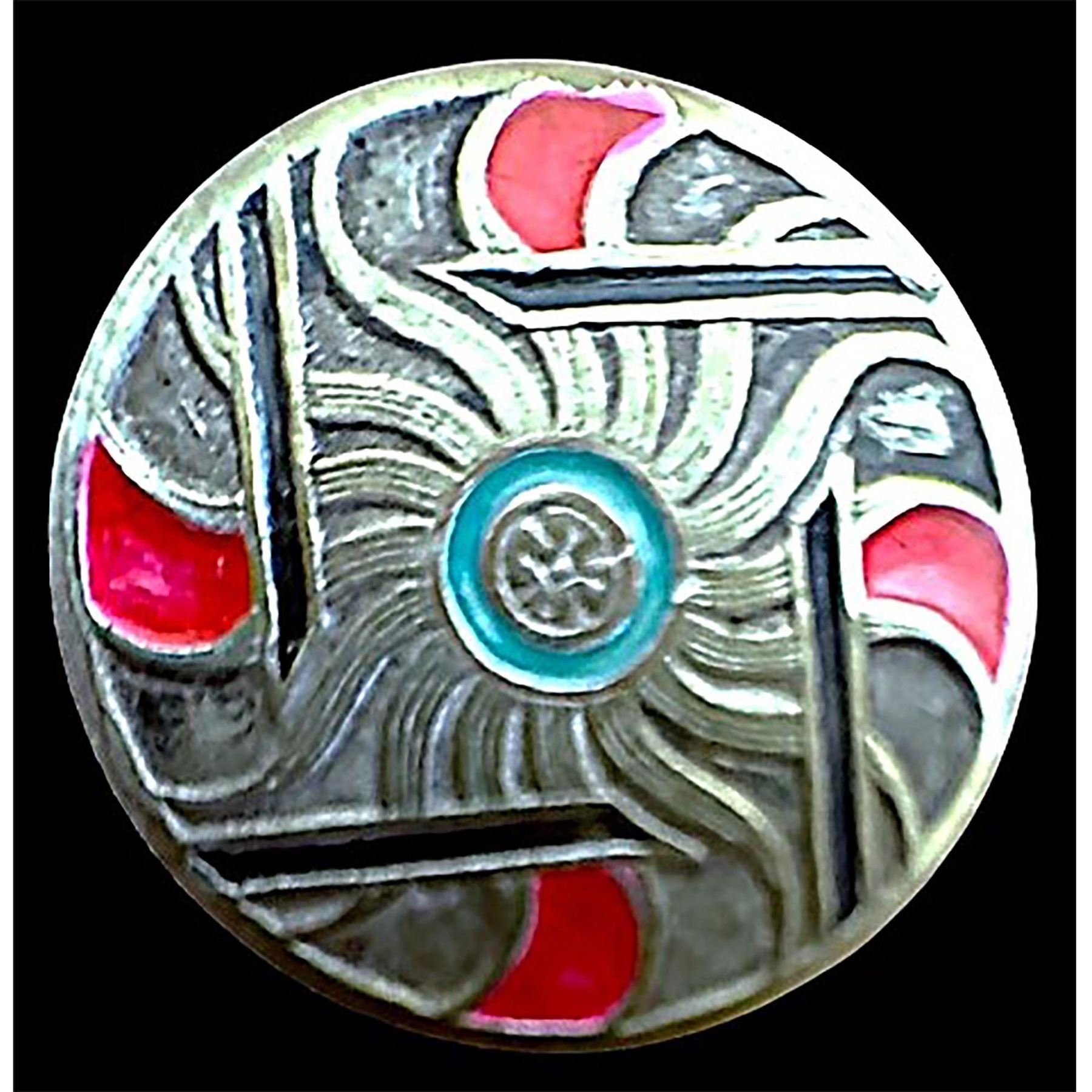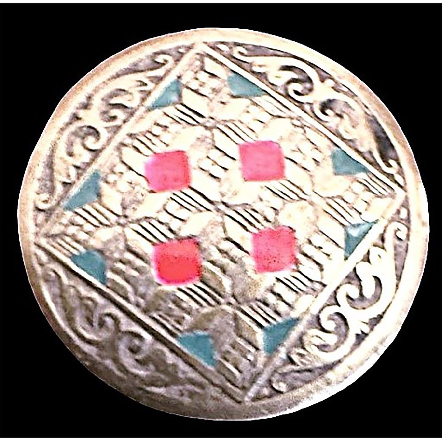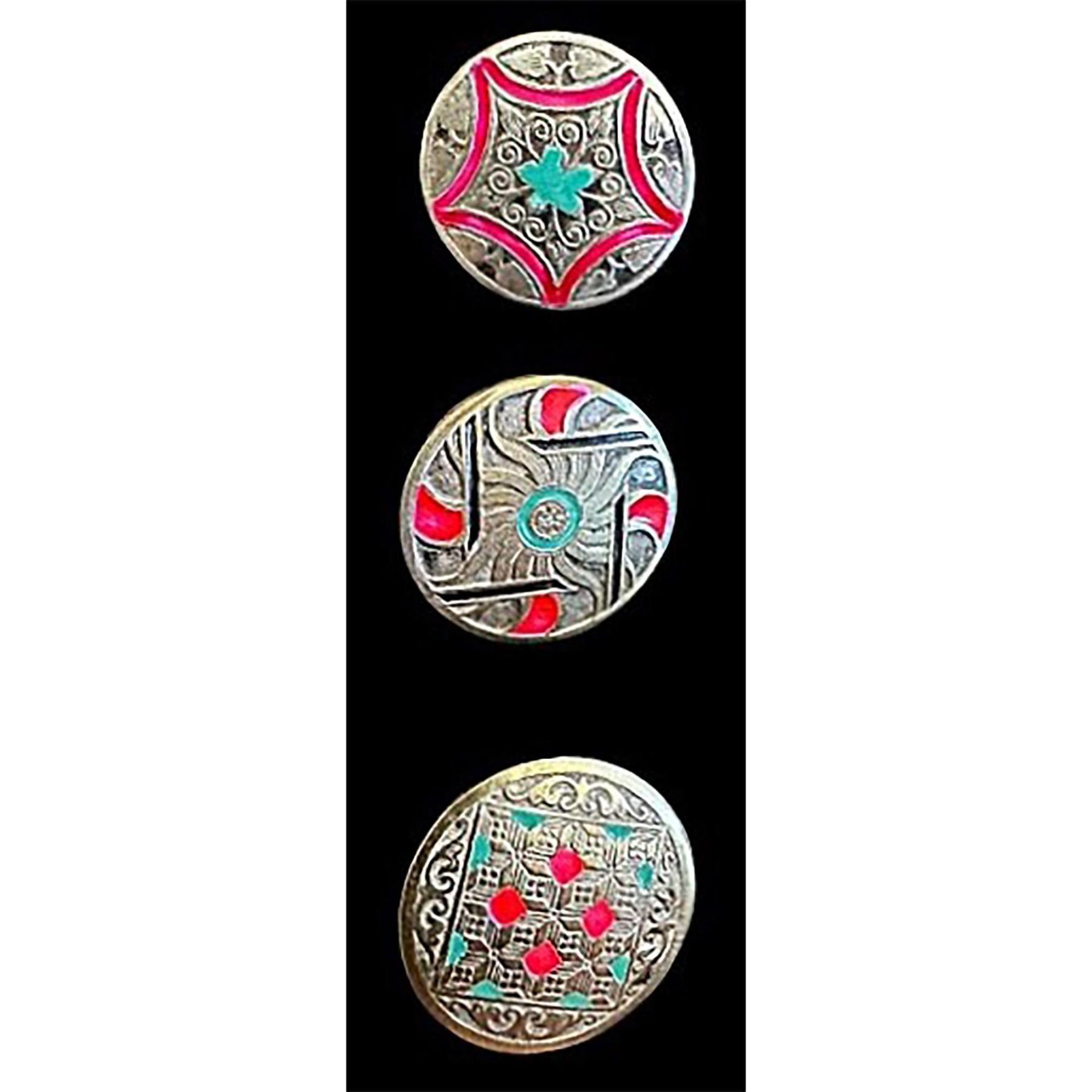 3 Medium 20th century buttons known as Deccan silver. Here are three nice and different pattern silver buttons with enamel DF from Deccan India.