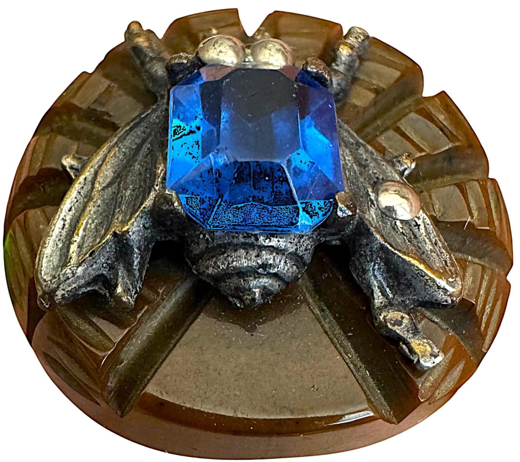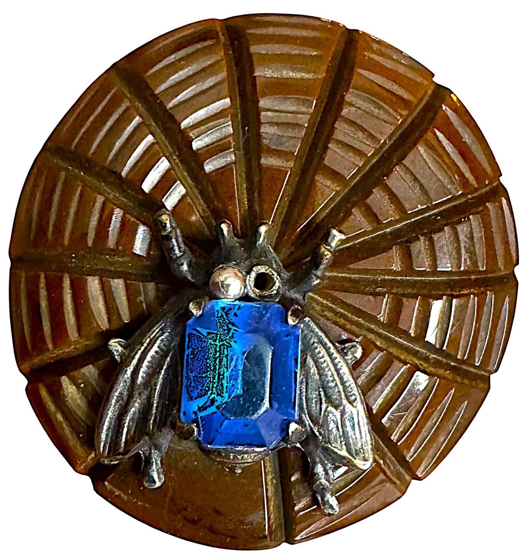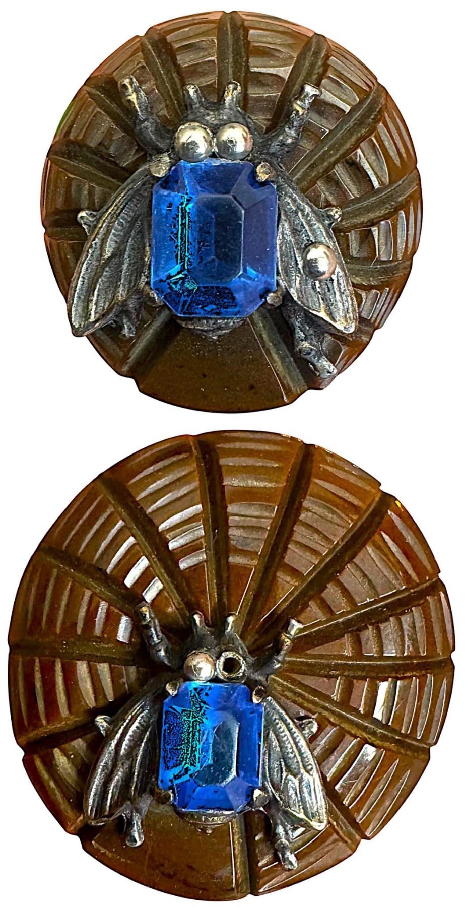 2 Medium/Large 20th century Bakelite jeweled BEE buttons. Here is a mother/daughter pair of carved chunky Bakelite with a white metal and value faceted glass jewel centered bee. Very cool buttons.