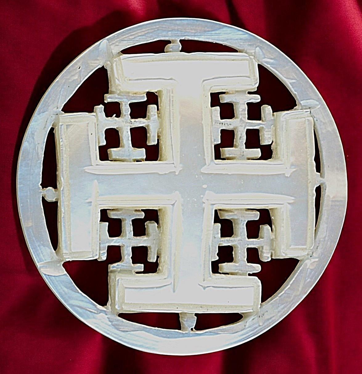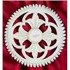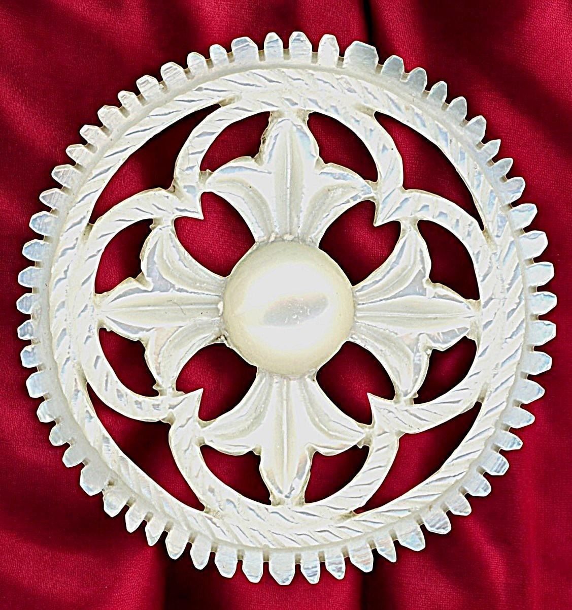3 Large 1930's carved Bethlehem pearl examples. This series of three came to us from a very old collection of buttons and were carded on beautiful red velvet which we left together but broke up two cards of them to make 4 different selections of three in this auction. These are the old 1930's detailed pearls from Jerusalem.