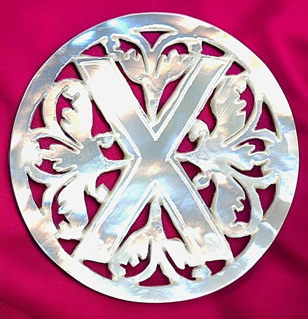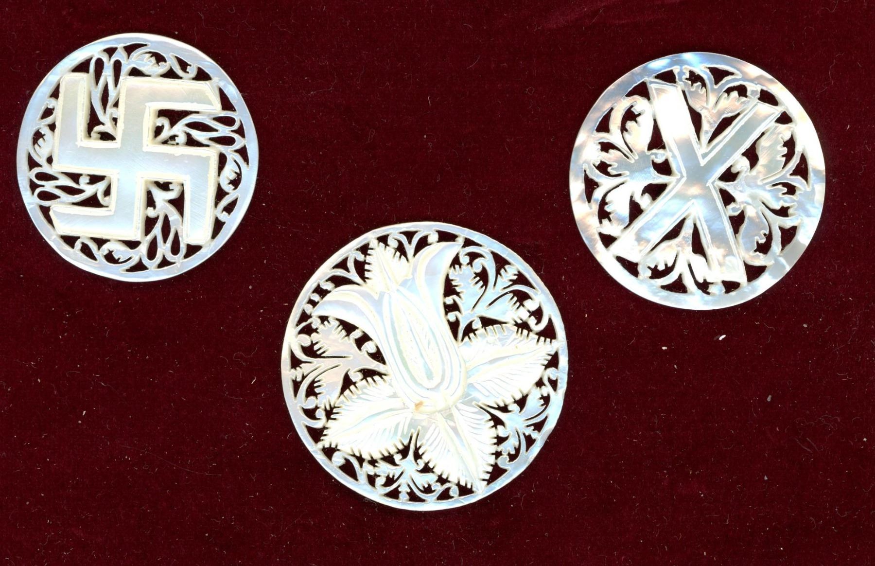 3 Large 1930's carved Bethlehem pearl examples. This series of three came to us from a very old collection of buttons and were carded on beautiful red velvet which we left together but broke up two cards of them to make 4 different selections of three in this auction. These are the old 1930's detailed pearls from Jerusalem.