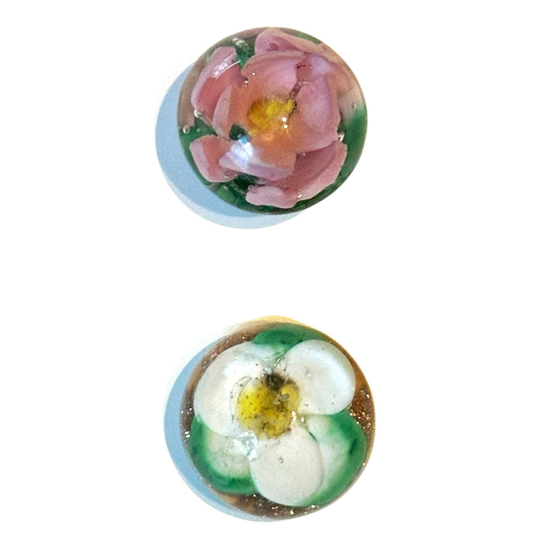 2 Medium size 20th century floral paperweight buttons. Here are two very vibrant color and detailed flower head buttons made of glass and in the style and technique of paperweights.