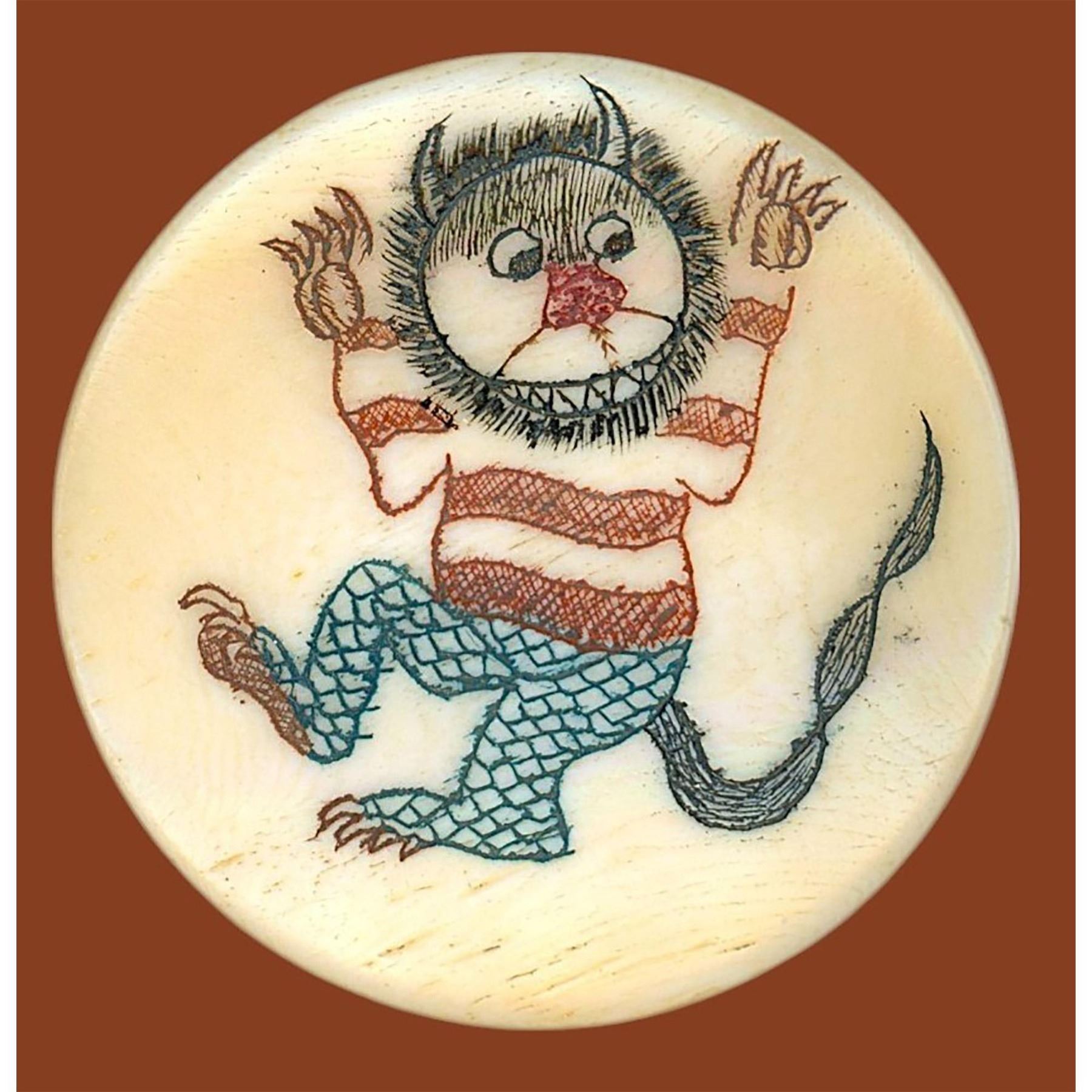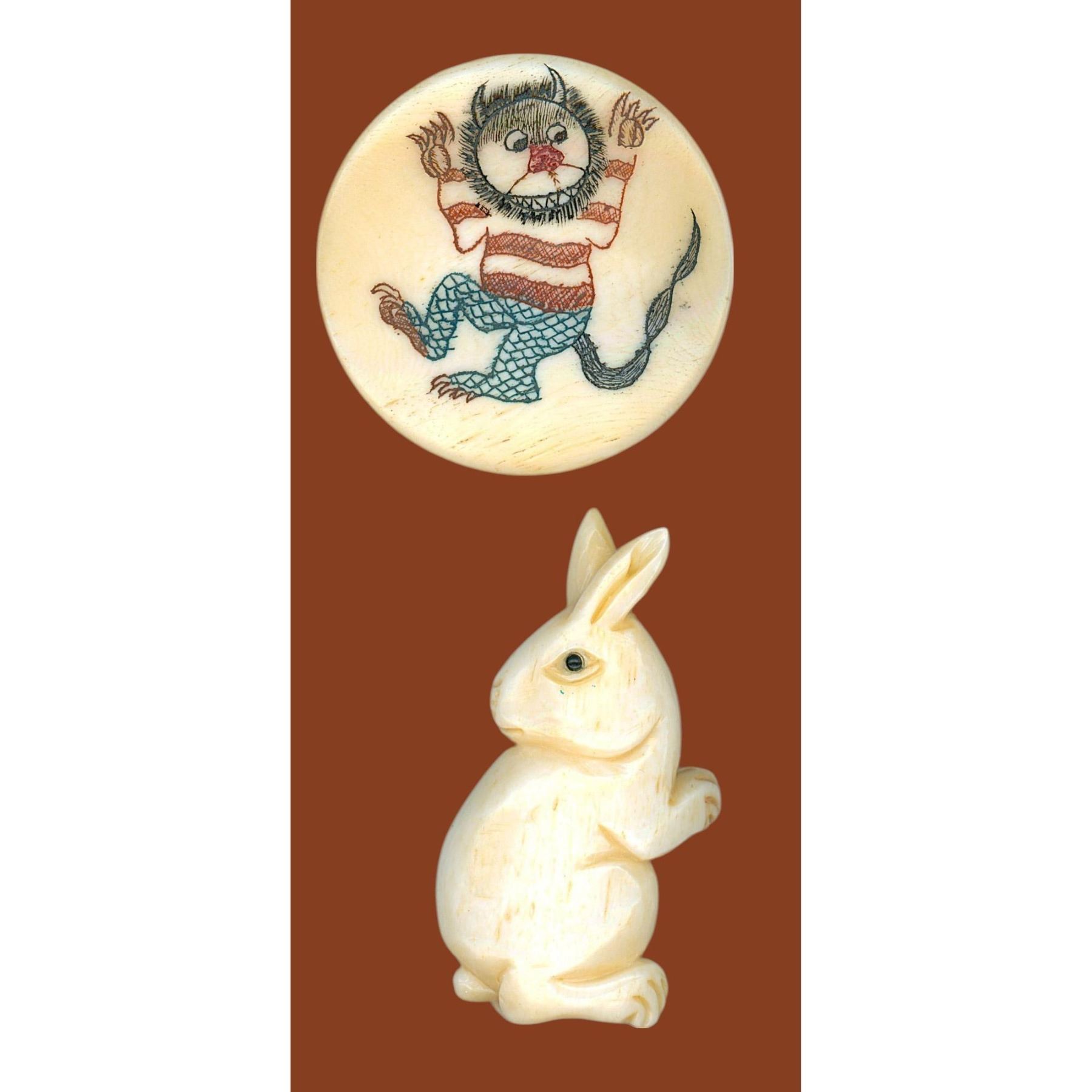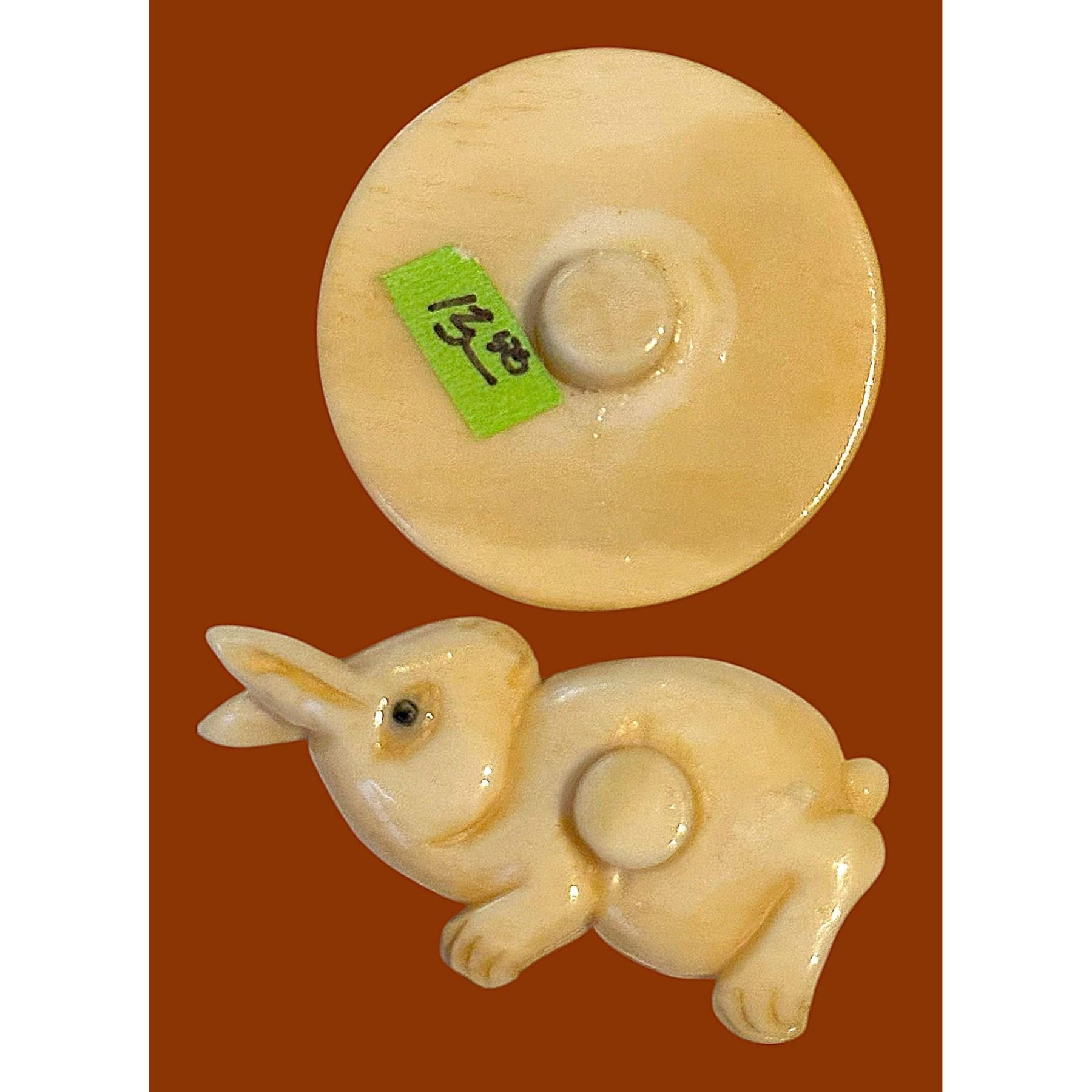 2 Large 20th-21st century pictorial examples incl. realistic. Here are two natural material buttons imported from China in the late 20th and early 21st century. The lot includes a very fun engraved and colorful dressed wild cat along with a chunky realistic rabbit.