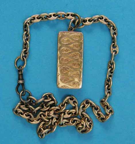 A small engraved gold vesta, on cable link chain £50-70