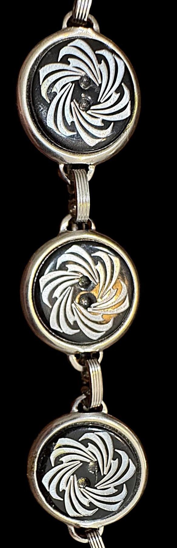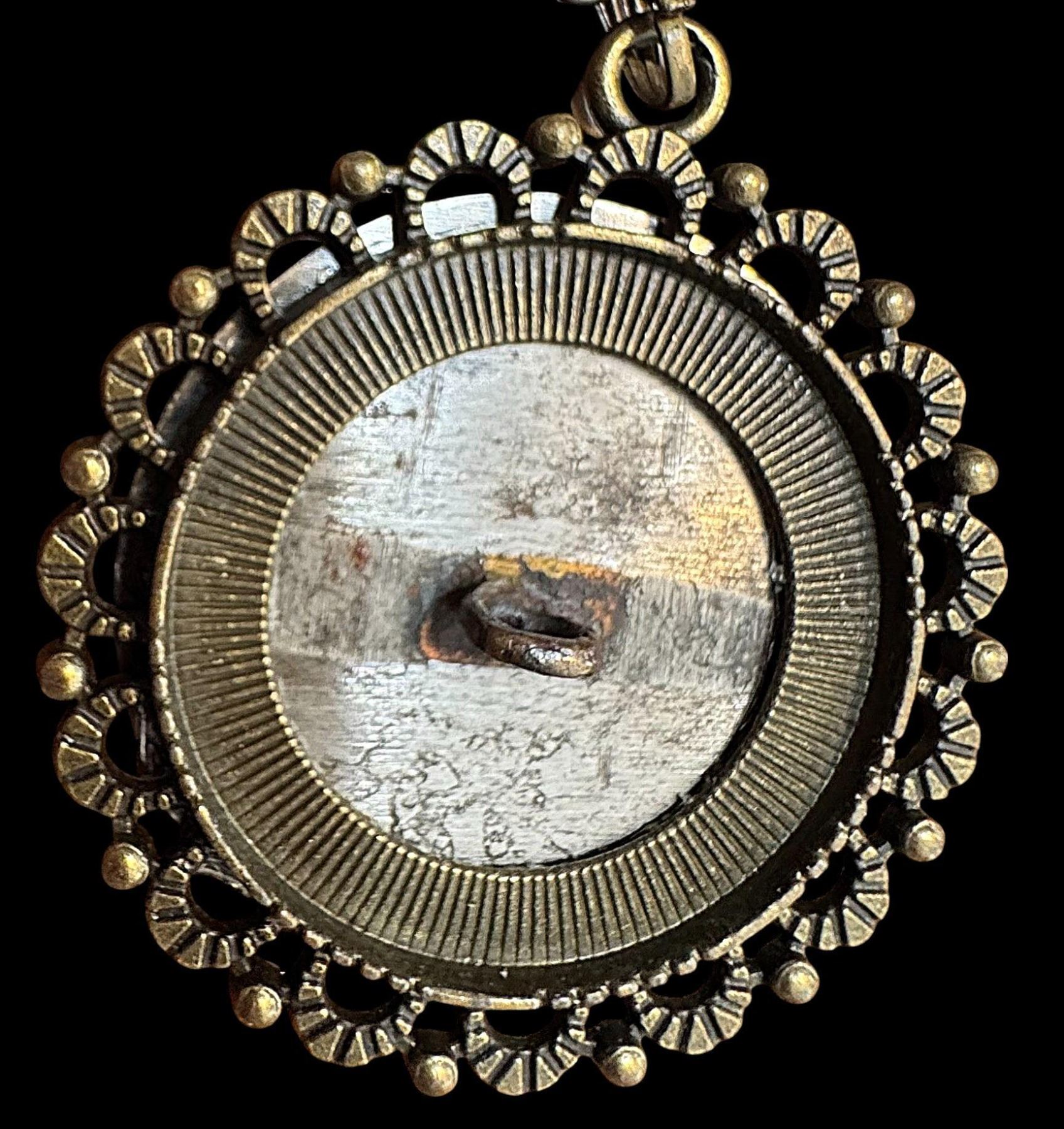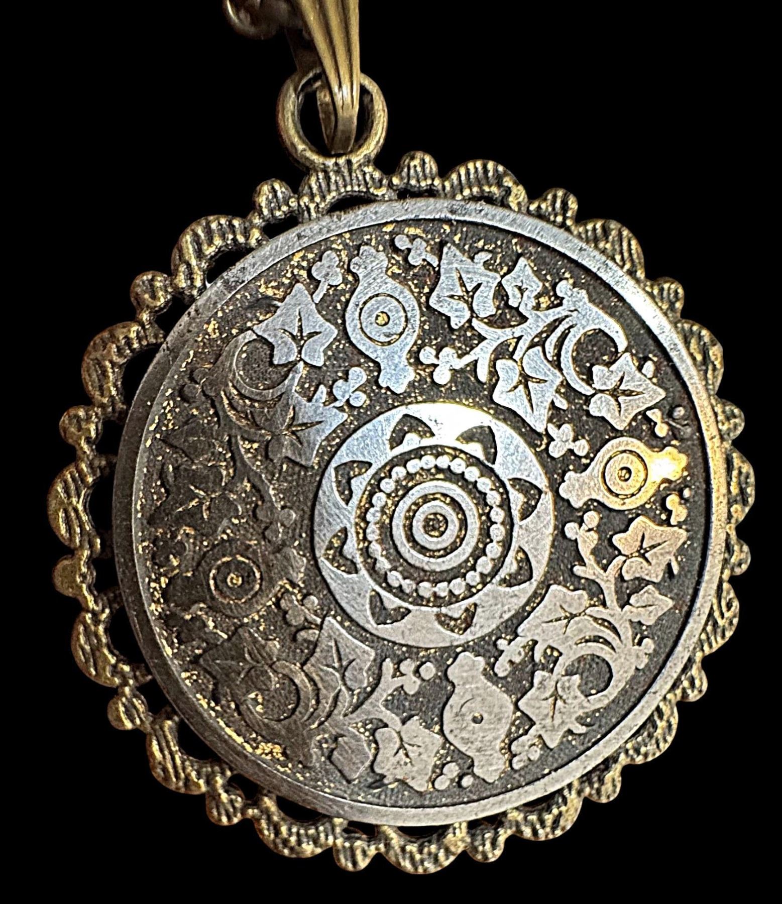 1 Necklace and one bracelet set with metal button examples. This lot includes a very nice brass chain necklace set with a brass bezel holding a large beautifully designed 19th century engraved steel button. The bracelet is set with 5 metal patterned buttons.