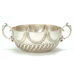 A small lobed round punch bowl, part spiral fluted with two caryatid handles, London 1951, 19.5cm diameter (7.74 in), 564g (18 oz)